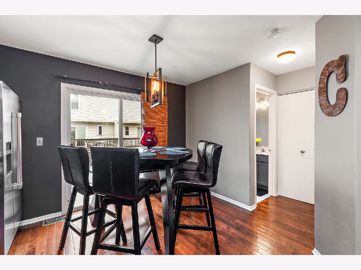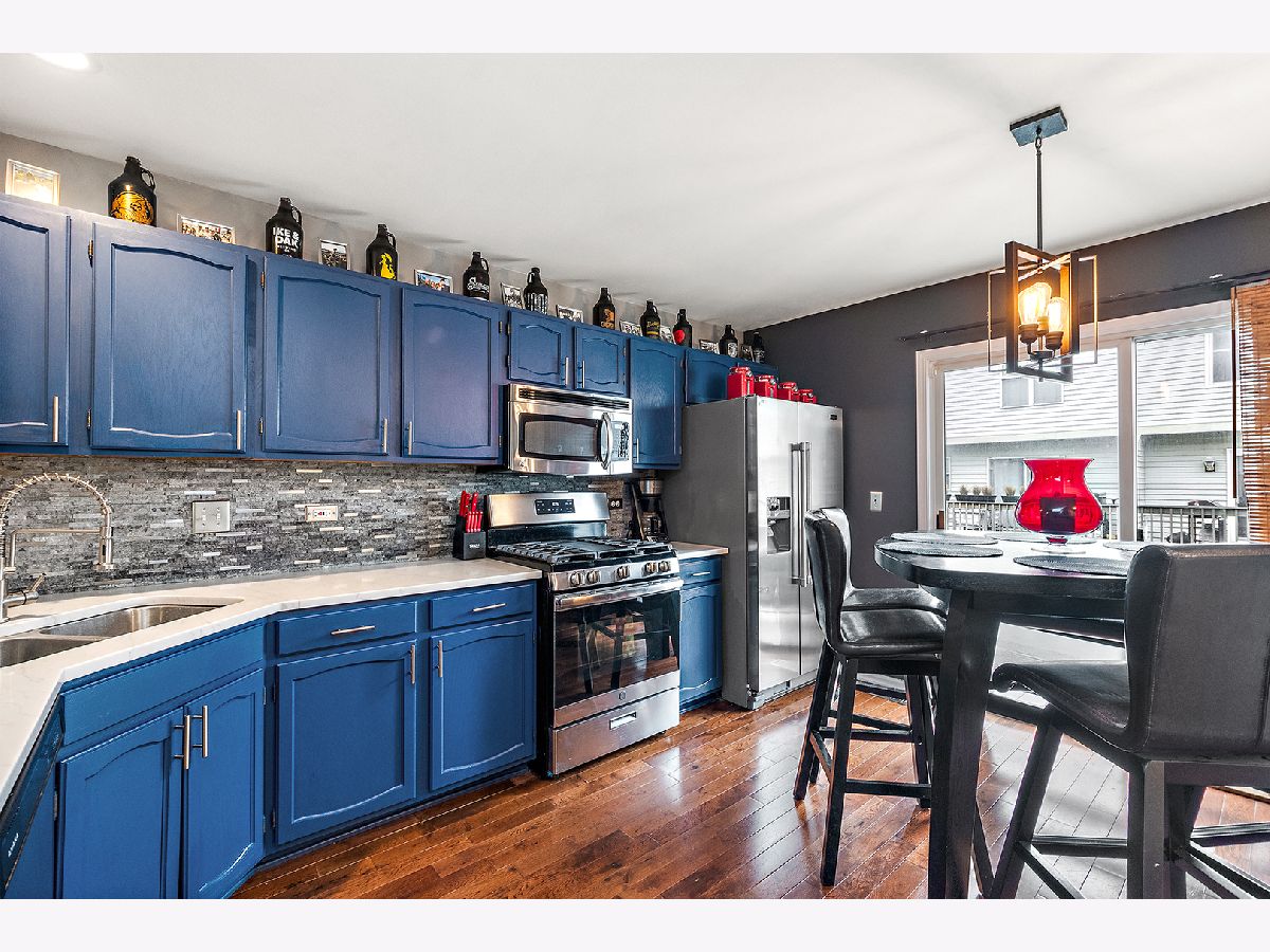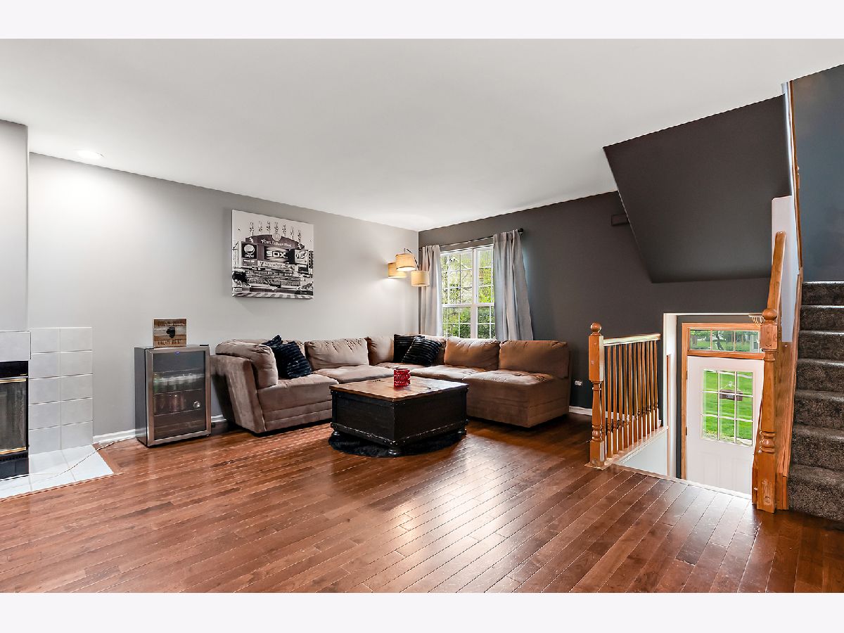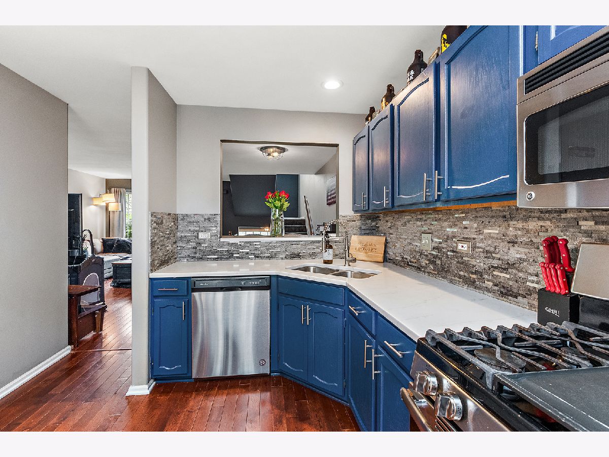 Center unit located in downtown Mokena, this 2-story is ideal for a METRA commute as well as area shopping dining and entertainment. A few steps up to open concept, main level living with gleaming hardwoods. Living and dining room offer plenty of space for entertaining. Oversized kitchen features an abundance of cabinetry, stainless appliances and complimenting backsplash. Great sight lines with the pass thru breakfast bar allow you to meal prep while socializing and/or keep an eye on the kids. Sliding glass doors to balcony. Convenient in-unit laundry room with additional cabinetry. Two large bedrooms each with a walk-in closet and full bathroom. Recreation area in the lower level with access to attached 2-car garage. Lush green courtyard for common area. Award-winning Lincoln-way East High School.