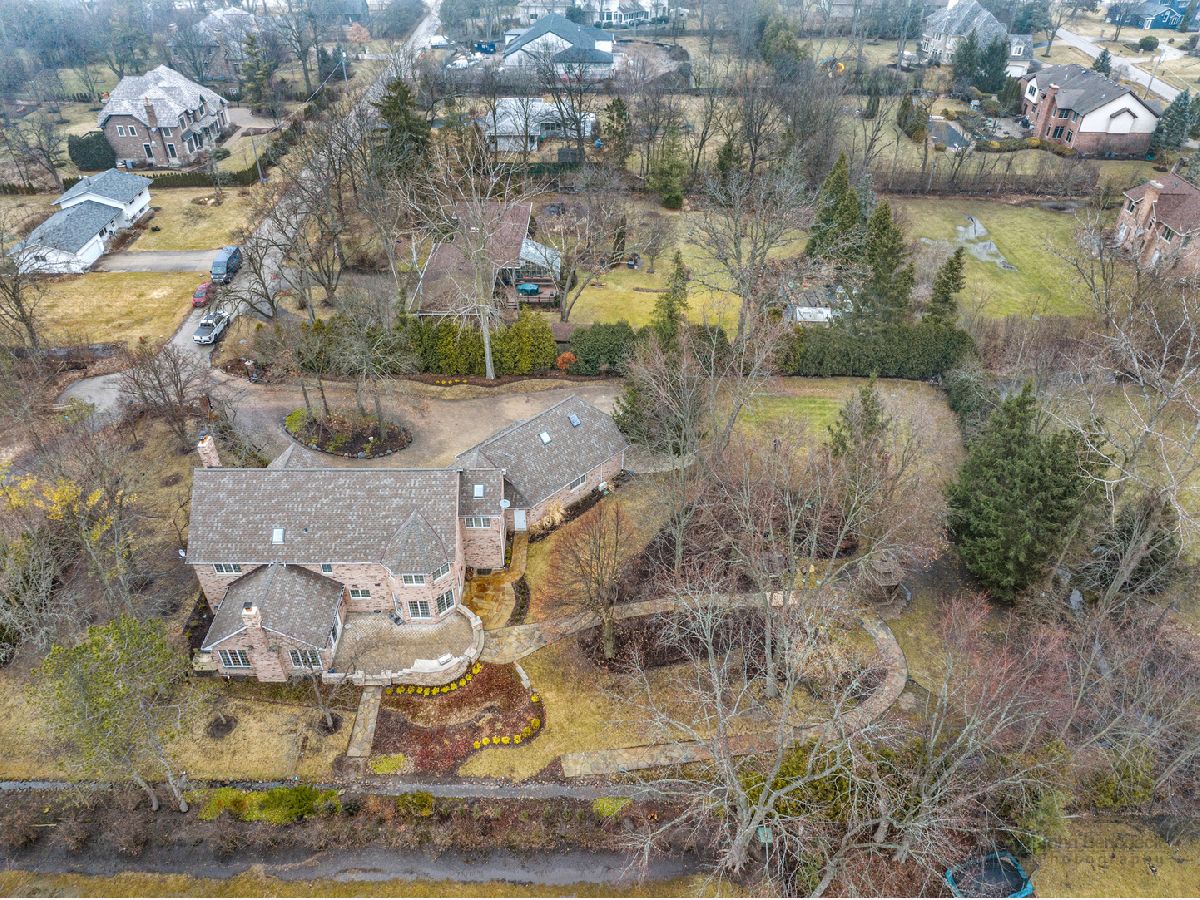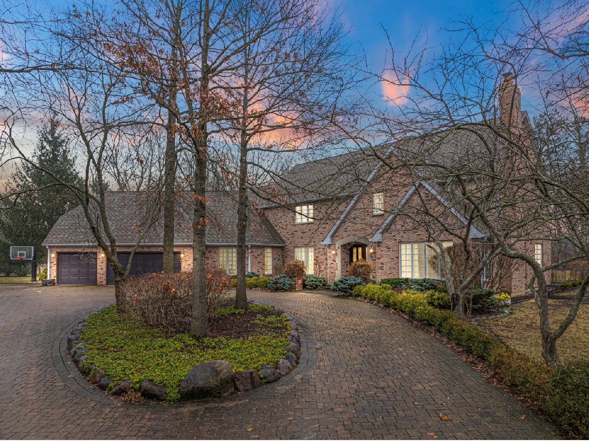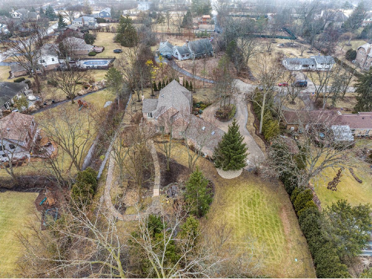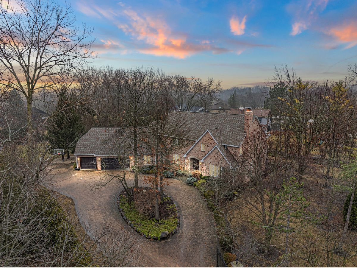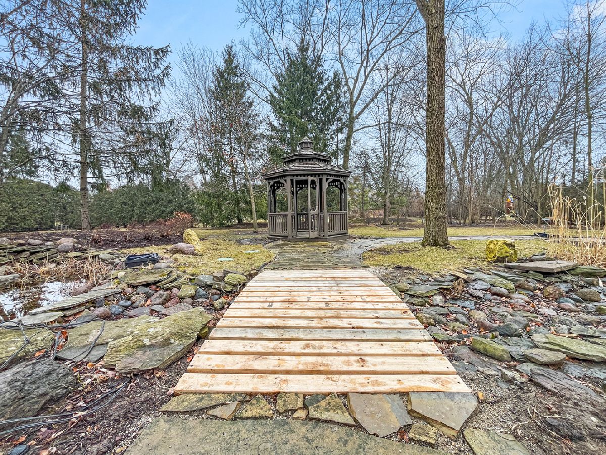 This extraordinary custom home effortlessly combines English and European design elements, nestled on a peaceful, wooded acre in the sought-after Stevenson High School district. Offering over 7,000 square feet of meticulously crafted living space (8,400 square feet gross), this home provides unmatched luxury. The chef's kitchen is a standout, equipped with high-end appliances, Miele Cappuccino machine, granite countertops, and a spacious island. The main floor showcases stunning hardwood floors, and includes formal living and dining rooms perfect for entertaining, as well as an office/library and family room featuring a striking fireplace. The main level also boasts a bedroom and full bathroom, ideal for in-laws or guests. The expansive primary suite offers a spa-like bathroom with a soaking tub, steam shower, and a huge walk-in closet with custom built-ins. The additional bedrooms are generously sized with ample closet space. The fully finished basement, with new carpeting, provides a large rec room and abundant storage, plus a dry sauna to warm you up during Chicago winters. A three-car attached garage offers plenty of room for your vehicles and storage needs. There is also a back up generator to keep your house running even if the power goes out. The park-like, fenced backyard features a gazebo and a charming bridge, while multiple patios, a deck, and a circular driveway enhance the home's appeal. Located on a quiet cul-de-sac, this private sanctuary remains conveniently close to top-rated schools, major commuter routes, parks, shopping, and entertainment. Welcome home!