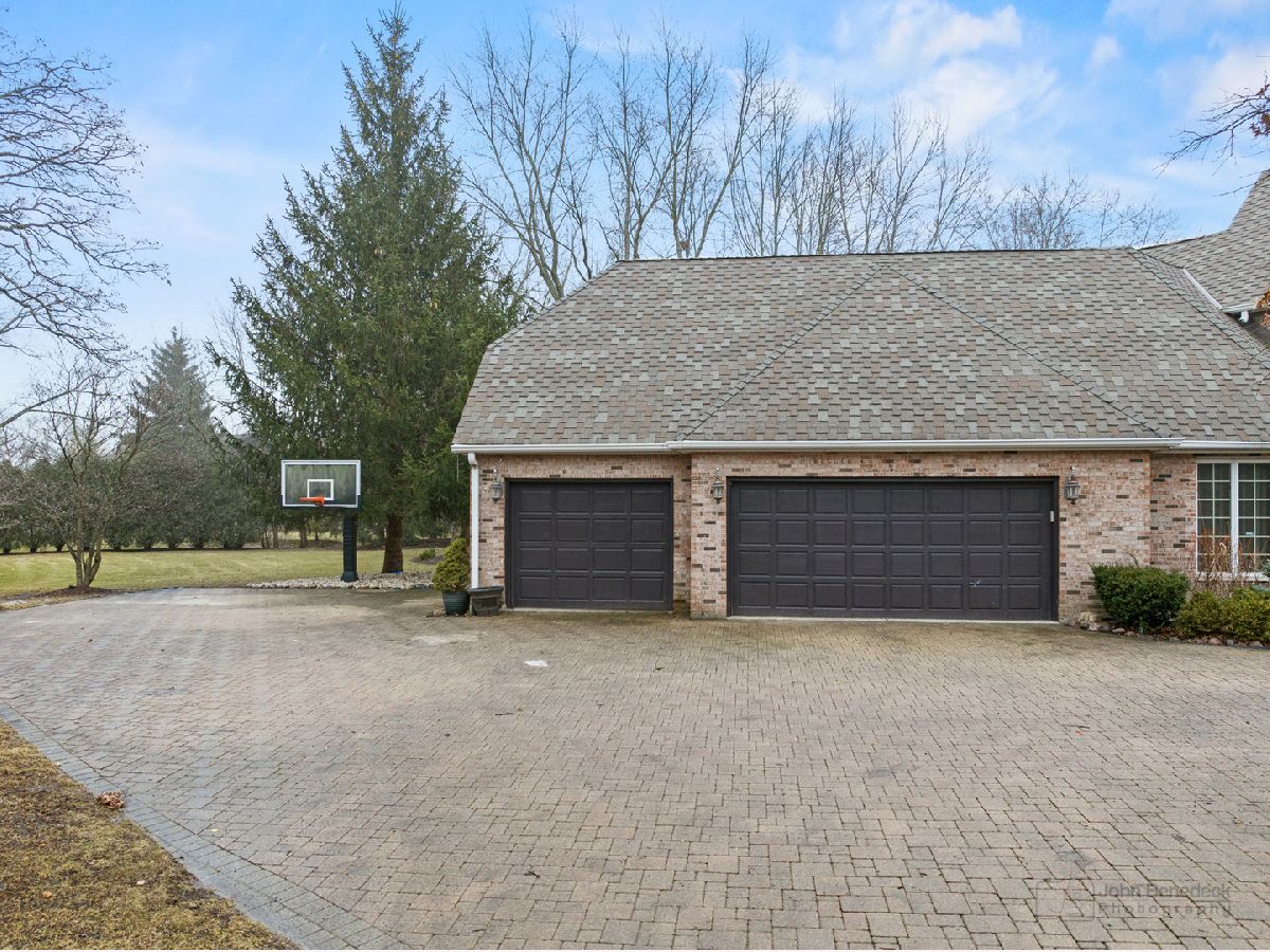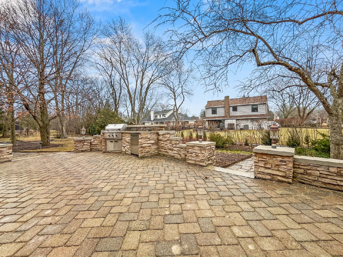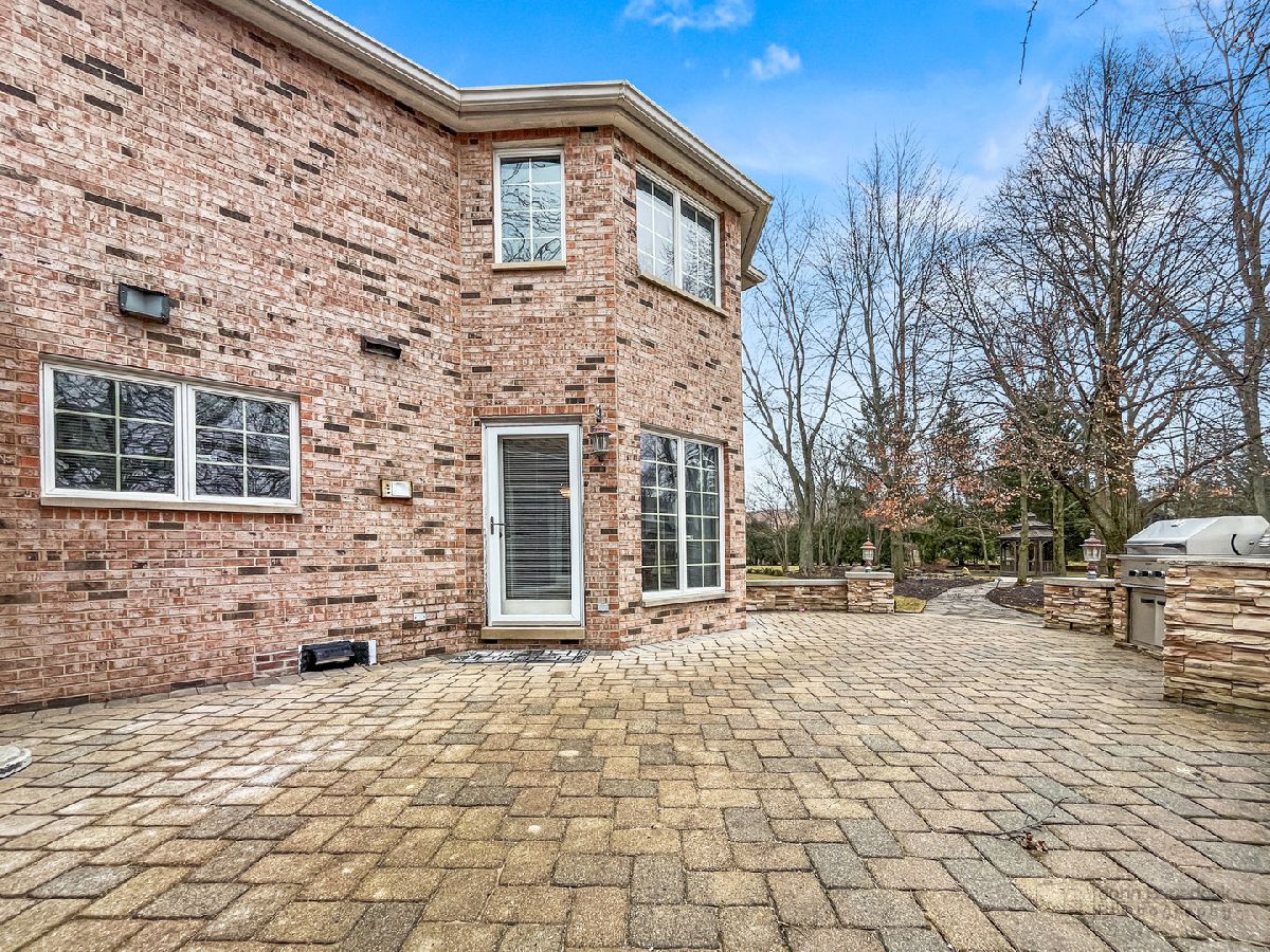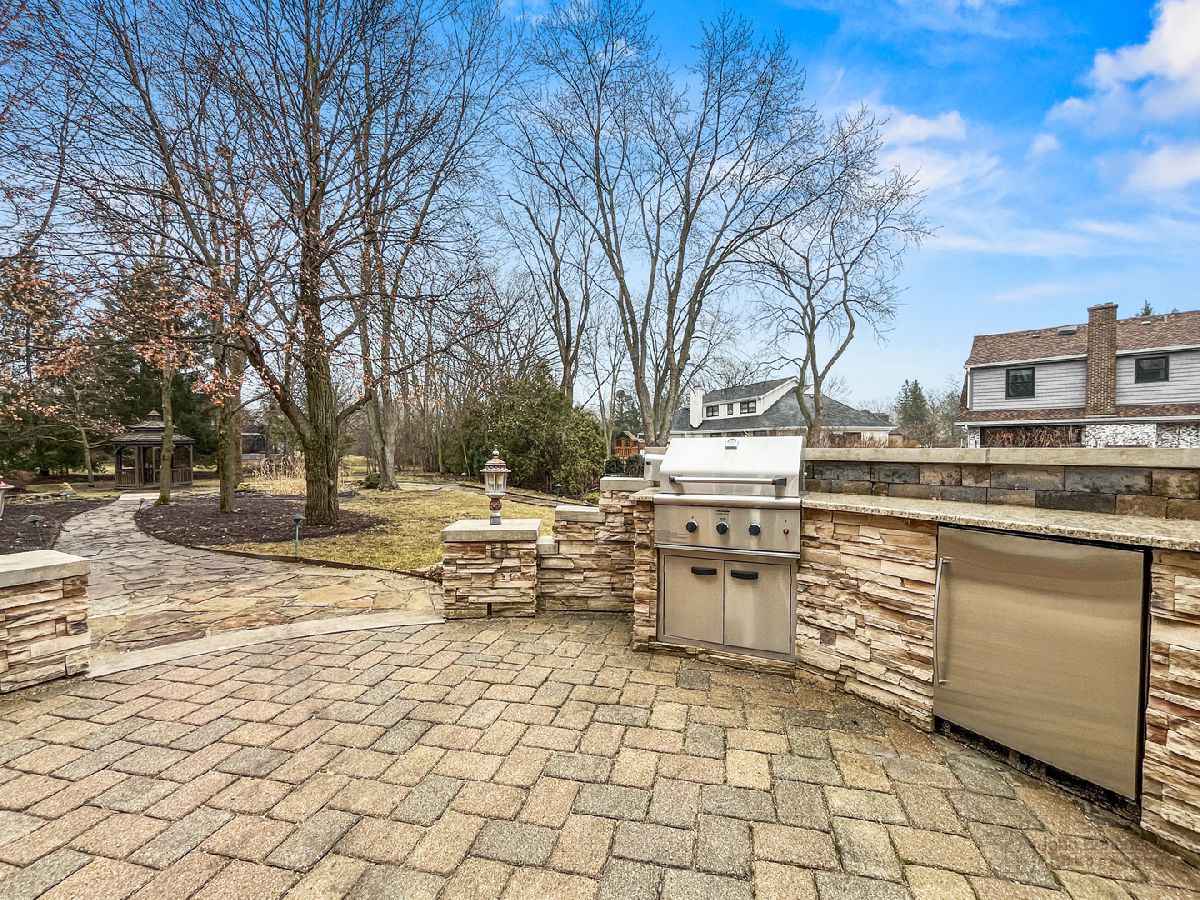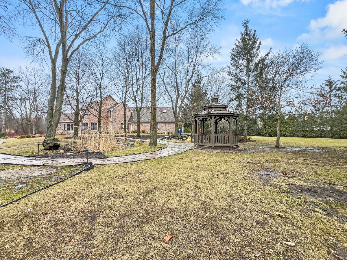 This extraordinary custom home effortlessly combines English and European design elements, nestled on a peaceful, wooded acre in the sought-after Stevenson High School district. Offering over 7,000 square feet of meticulously crafted living space (8,400 square feet gross), this home provides unmatched luxury. The chef's kitchen is a standout, equipped with high-end appliances, Miele Cappuccino machine, granite countertops, and a spacious island. The main floor showcases stunning hardwood floors, and includes formal living and dining rooms perfect for entertaining, as well as an office/library and family room featuring a striking fireplace. The main level also boasts a bedroom and full bathroom, ideal for in-laws or guests. The expansive primary suite offers a spa-like bathroom with a soaking tub, steam shower, and a huge walk-in closet with custom built-ins. The additional bedrooms are generously sized with ample closet space. The fully finished basement, with new carpeting, provides a large rec room and abundant storage, plus a dry sauna to warm you up during Chicago winters. A three-car attached garage offers plenty of room for your vehicles and storage needs. There is also a back up generator to keep your house running even if the power goes out. The park-like, fenced backyard features a gazebo and a charming bridge, while multiple patios, a deck, and a circular driveway enhance the home's appeal. Located on a quiet cul-de-sac, this private sanctuary remains conveniently close to top-rated schools, major commuter routes, parks, shopping, and entertainment. Welcome home!