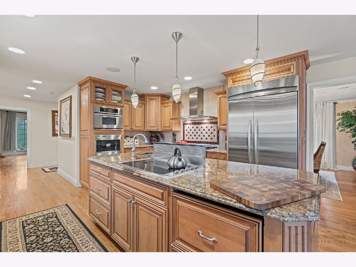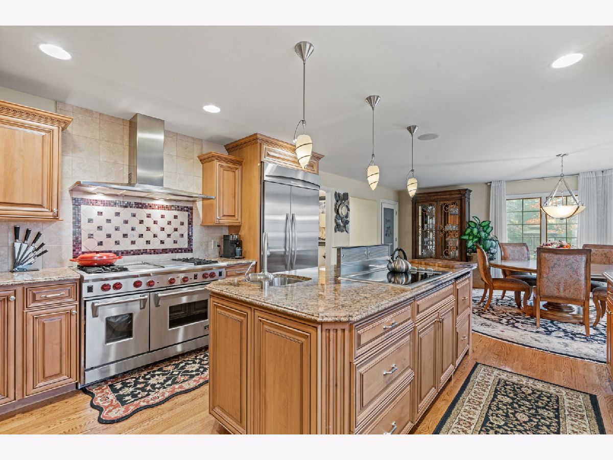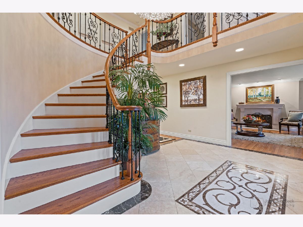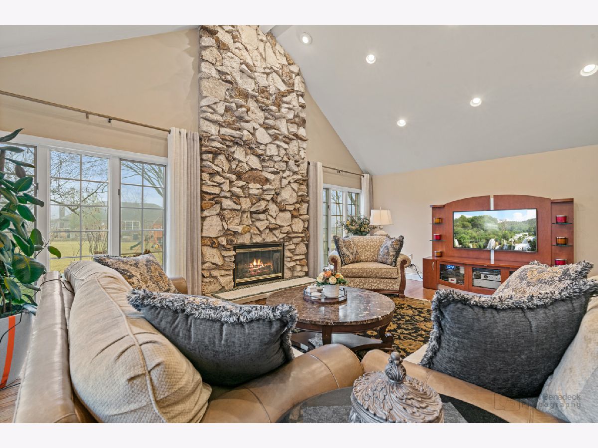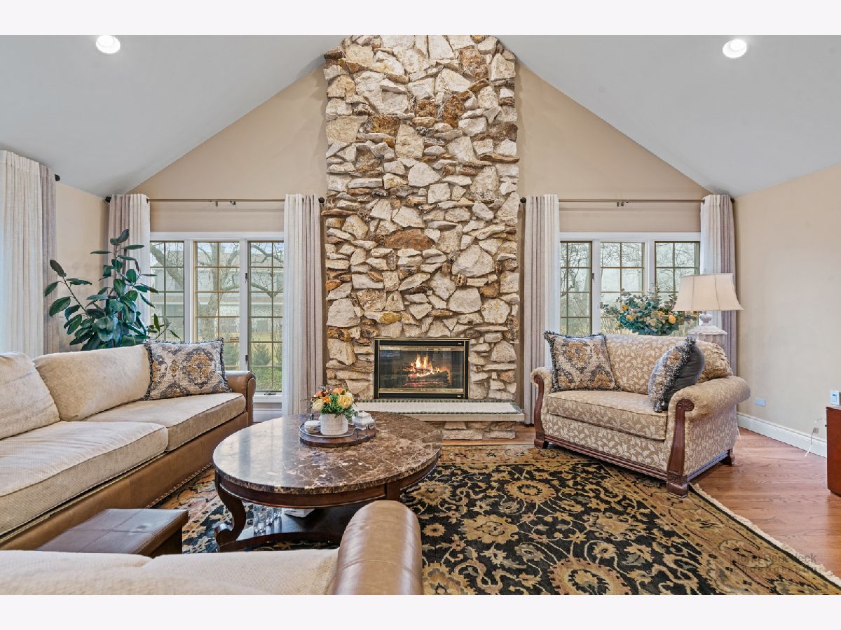 This extraordinary custom home effortlessly combines English and European design elements, nestled on a peaceful, wooded acre in the sought-after Stevenson High School district. Offering over 7,000 square feet of meticulously crafted living space (8,400 square feet gross), this home provides unmatched luxury. The chef's kitchen is a standout, equipped with high-end appliances, Miele Cappuccino machine, granite countertops, and a spacious island. The main floor showcases stunning hardwood floors, and includes formal living and dining rooms perfect for entertaining, as well as an office/library and family room featuring a striking fireplace. The main level also boasts a bedroom and full bathroom, ideal for in-laws or guests. The expansive primary suite offers a spa-like bathroom with a soaking tub, steam shower, and a huge walk-in closet with custom built-ins. The additional bedrooms are generously sized with ample closet space. The fully finished basement, with new carpeting, provides a large rec room and abundant storage, plus a dry sauna to warm you up during Chicago winters. A three-car attached garage offers plenty of room for your vehicles and storage needs. There is also a back up generator to keep your house running even if the power goes out. The park-like, fenced backyard features a gazebo and a charming bridge, while multiple patios, a deck, and a circular driveway enhance the home's appeal. Located on a quiet cul-de-sac, this private sanctuary remains conveniently close to top-rated schools, major commuter routes, parks, shopping, and entertainment. Welcome home!
