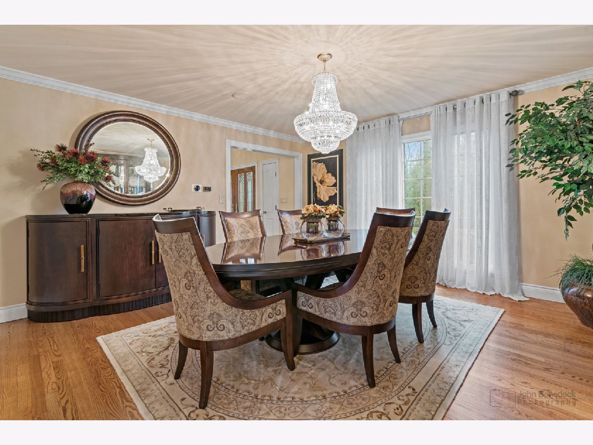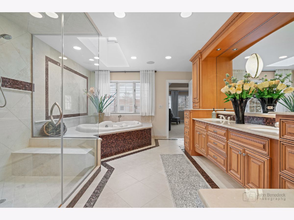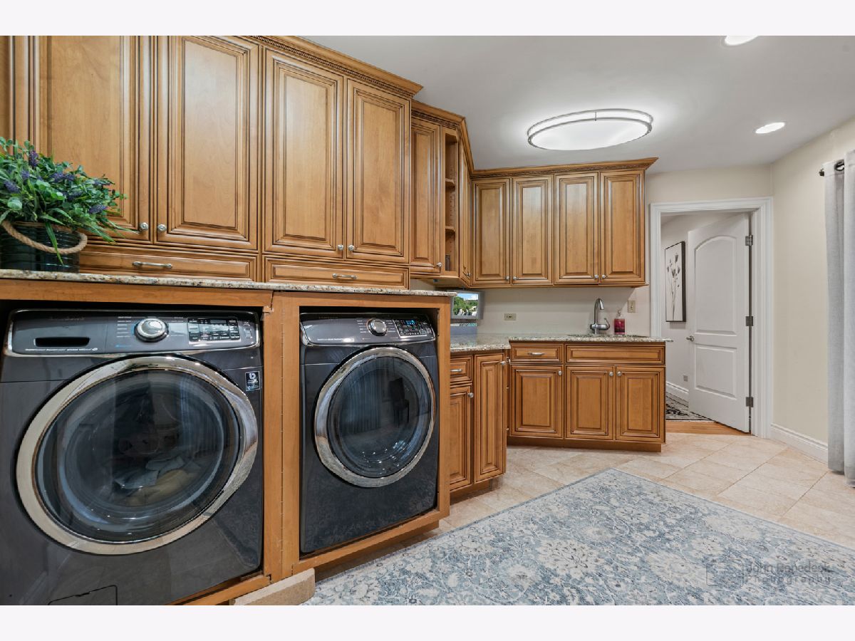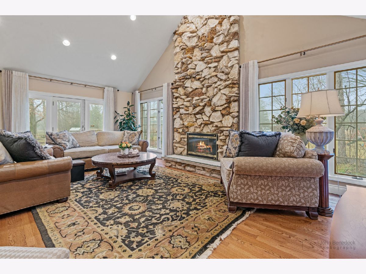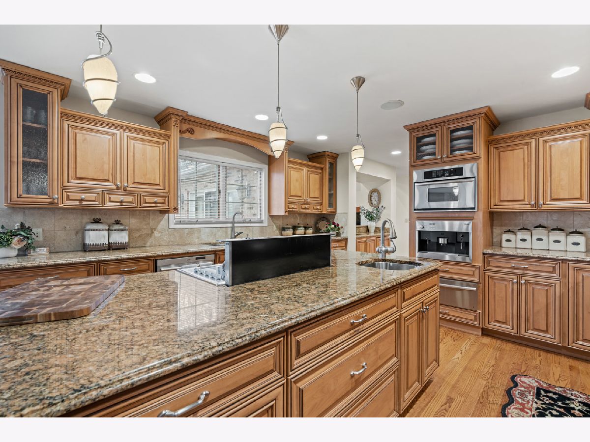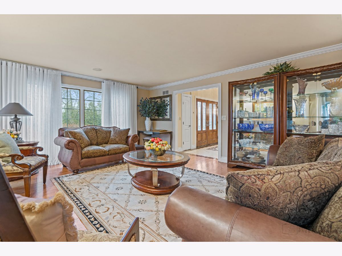 This extraordinary custom home effortlessly combines English and European design elements, nestled on a peaceful, wooded acre in the sought-after Stevenson High School district. Offering over 7,000 square feet of meticulously crafted living space (8,400 square feet gross), this home provides unmatched luxury. The chef's kitchen is a standout, equipped with high-end appliances, Miele Cappuccino machine, granite countertops, and a spacious island. The main floor showcases stunning hardwood floors, and includes formal living and dining rooms perfect for entertaining, as well as an office/library and family room featuring a striking fireplace. The main level also boasts a bedroom and full bathroom, ideal for in-laws or guests. The expansive primary suite offers a spa-like bathroom with a soaking tub, steam shower, and a huge walk-in closet with custom built-ins. The additional bedrooms are generously sized with ample closet space. The fully finished basement, with new carpeting, provides a large rec room and abundant storage, plus a dry sauna to warm you up during Chicago winters. A three-car attached garage offers plenty of room for your vehicles and storage needs. There is also a back up generator to keep your house running even if the power goes out. The park-like, fenced backyard features a gazebo and a charming bridge, while multiple patios, a deck, and a circular driveway enhance the home's appeal. Located on a quiet cul-de-sac, this private sanctuary remains conveniently close to top-rated schools, major commuter routes, parks, shopping, and entertainment. Welcome home!
