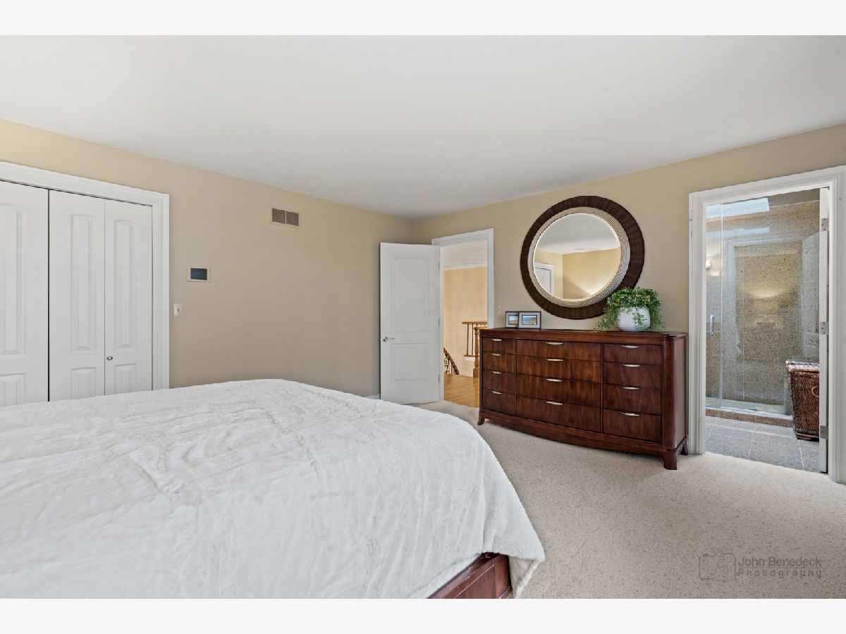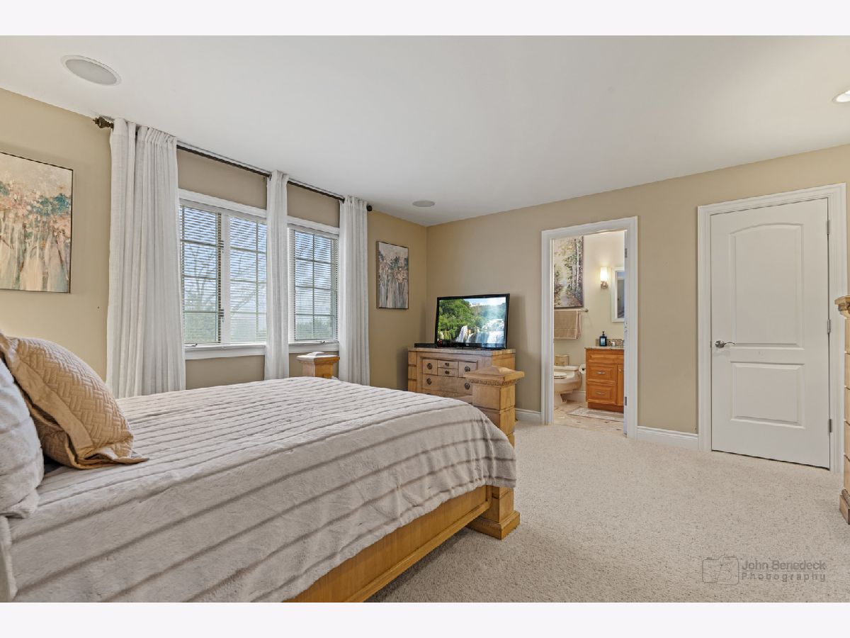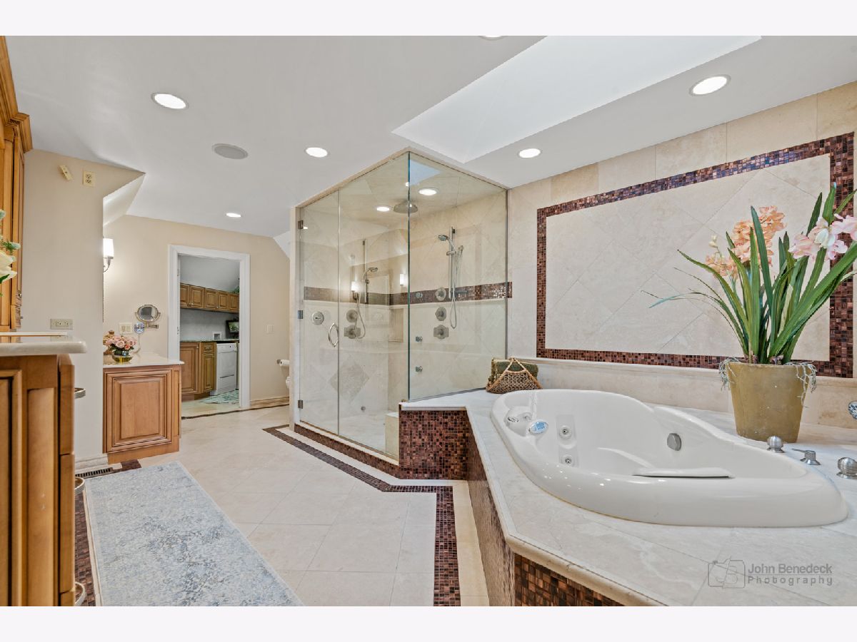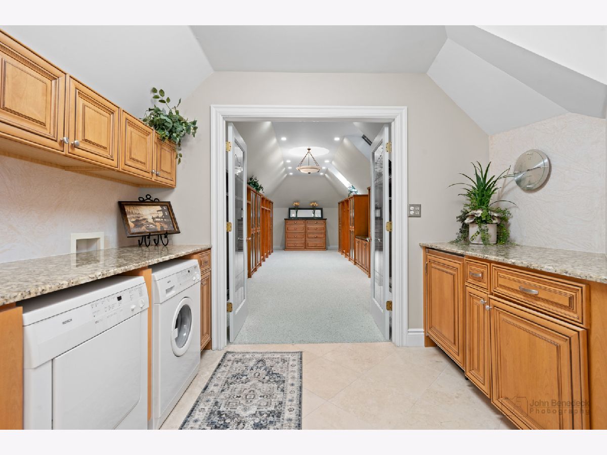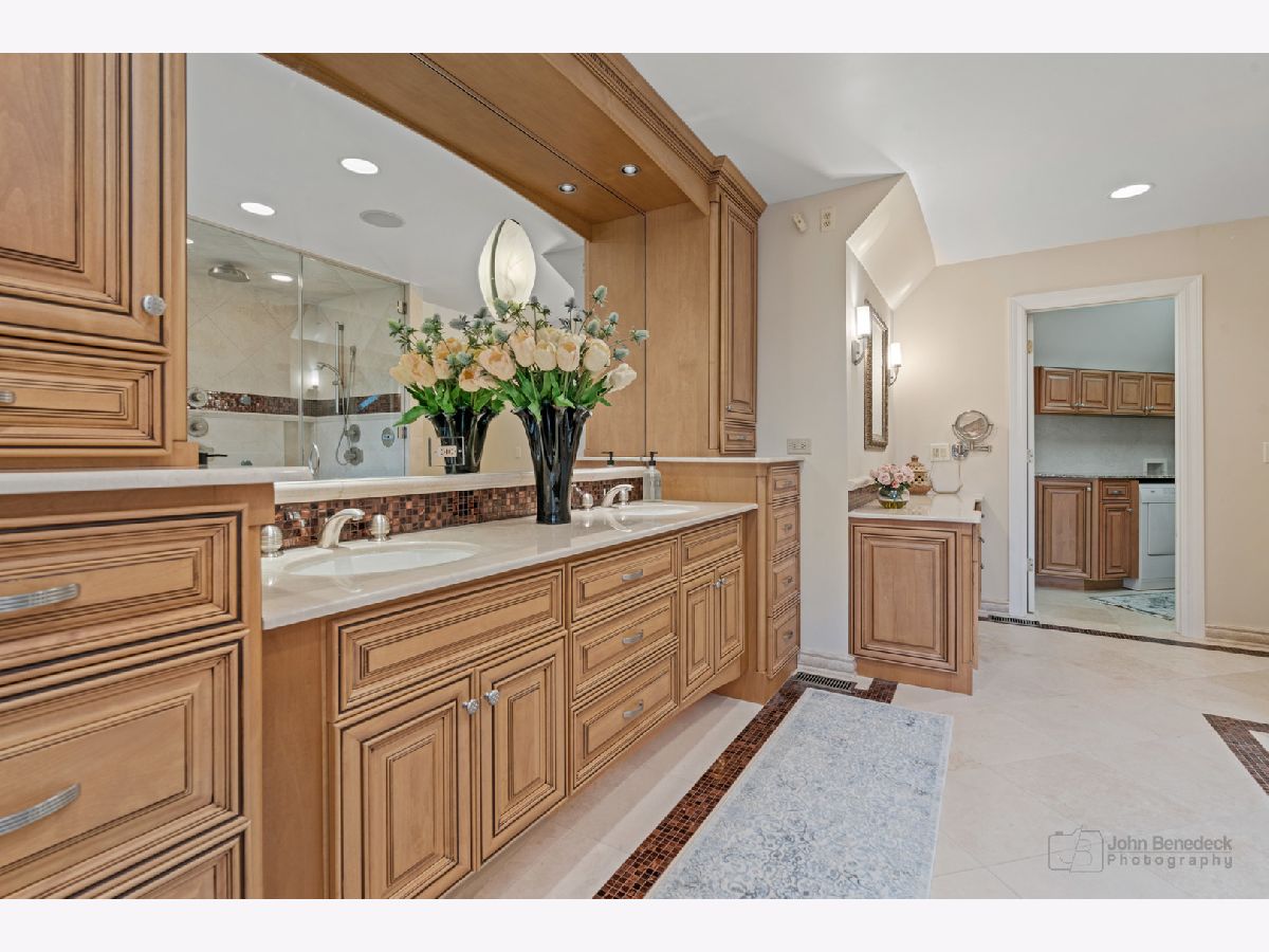 This extraordinary custom home effortlessly combines English and European design elements, nestled on a peaceful, wooded acre in the sought-after Stevenson High School district. Offering over 7,000 square feet of meticulously crafted living space (8,400 square feet gross), this home provides unmatched luxury. The chef's kitchen is a standout, equipped with high-end appliances, Miele Cappuccino machine, granite countertops, and a spacious island. The main floor showcases stunning hardwood floors, and includes formal living and dining rooms perfect for entertaining, as well as an office/library and family room featuring a striking fireplace. The main level also boasts a bedroom and full bathroom, ideal for in-laws or guests. The expansive primary suite offers a spa-like bathroom with a soaking tub, steam shower, and a huge walk-in closet with custom built-ins. The additional bedrooms are generously sized with ample closet space. The fully finished basement, with new carpeting, provides a large rec room and abundant storage, plus a dry sauna to warm you up during Chicago winters. A three-car attached garage offers plenty of room for your vehicles and storage needs. There is also a back up generator to keep your house running even if the power goes out. The park-like, fenced backyard features a gazebo and a charming bridge, while multiple patios, a deck, and a circular driveway enhance the home's appeal. Located on a quiet cul-de-sac, this private sanctuary remains conveniently close to top-rated schools, major commuter routes, parks, shopping, and entertainment. Welcome home!