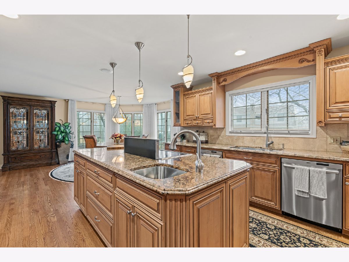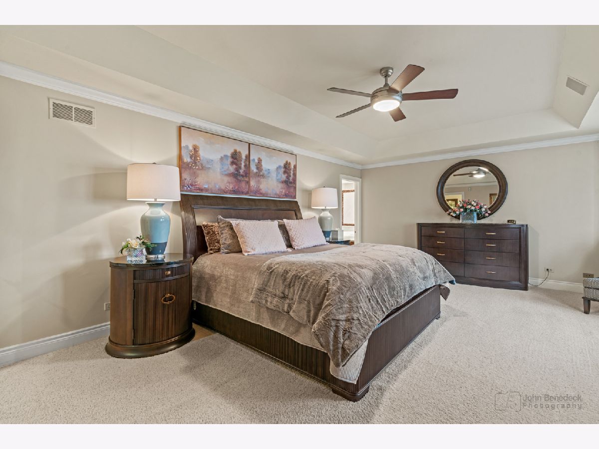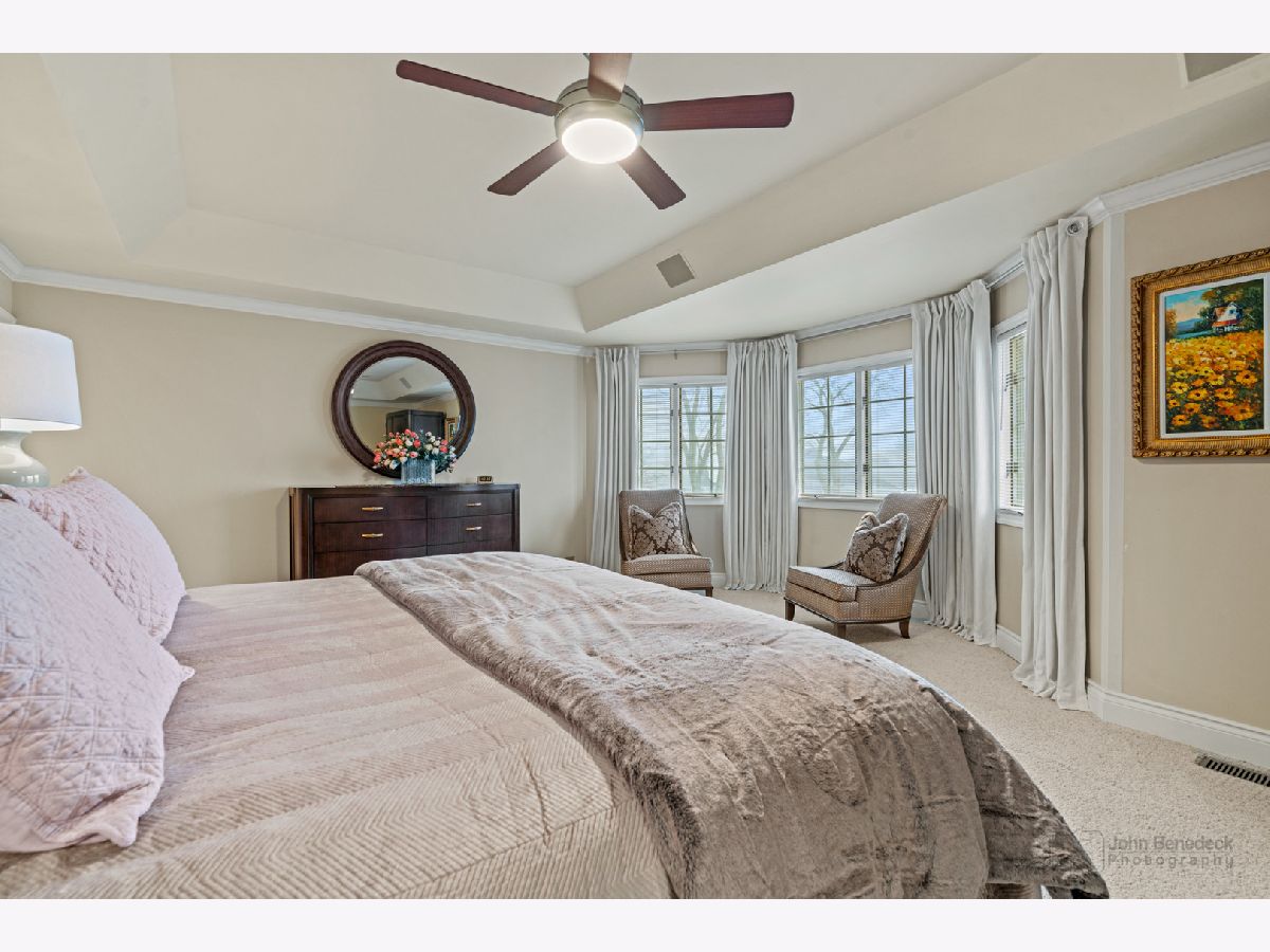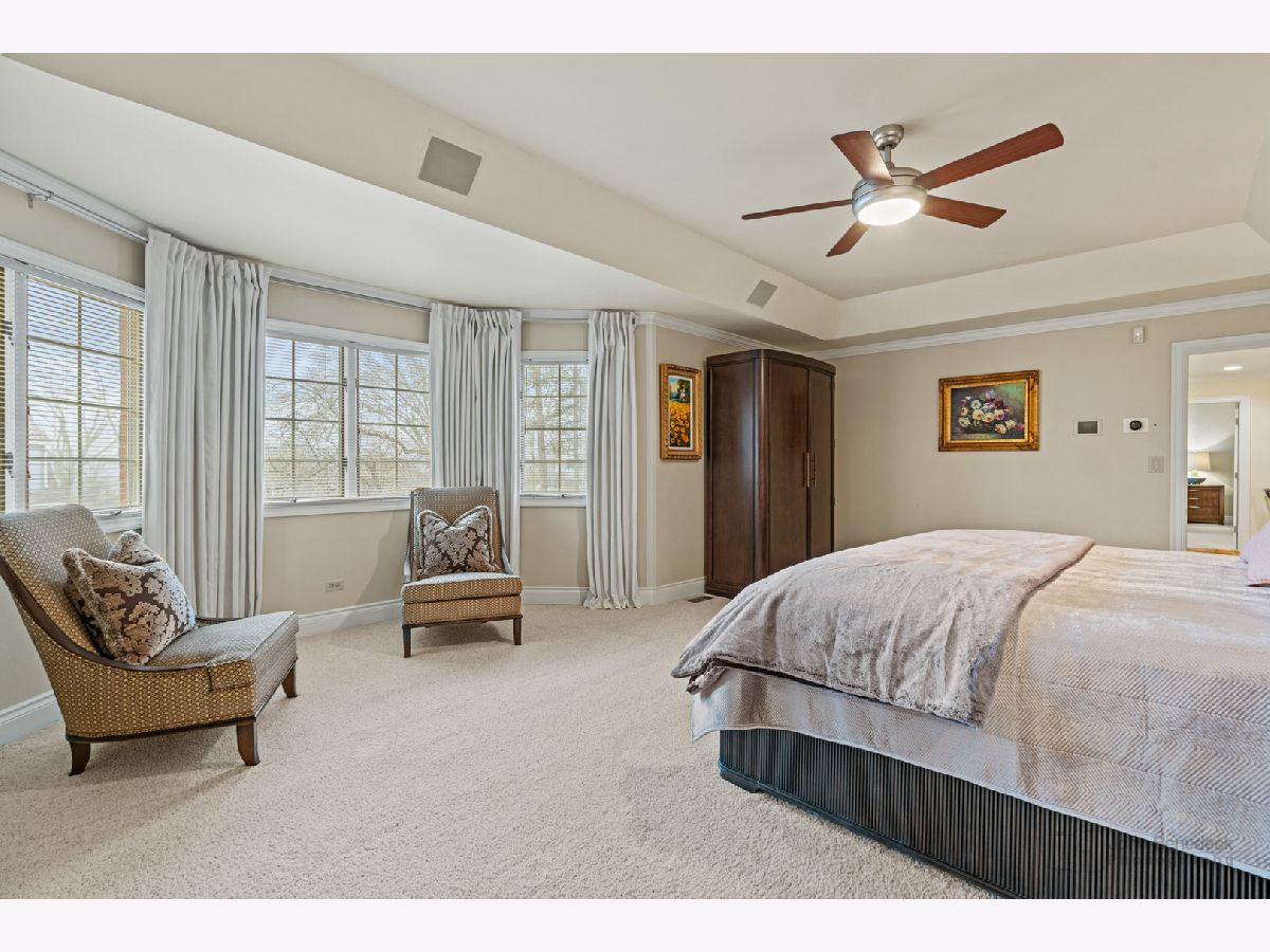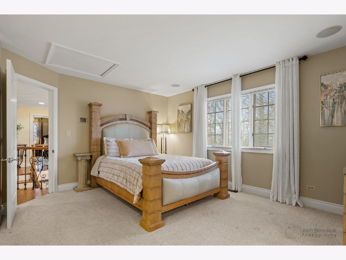 This extraordinary custom home effortlessly combines English and European design elements, nestled on a peaceful, wooded acre in the sought-after Stevenson High School district. Offering over 7,000 square feet of meticulously crafted living space (8,400 square feet gross), this home provides unmatched luxury. The chef's kitchen is a standout, equipped with high-end appliances, Miele Cappuccino machine, granite countertops, and a spacious island. The main floor showcases stunning hardwood floors, and includes formal living and dining rooms perfect for entertaining, as well as an office/library and family room featuring a striking fireplace. The main level also boasts a bedroom and full bathroom, ideal for in-laws or guests. The expansive primary suite offers a spa-like bathroom with a soaking tub, steam shower, and a huge walk-in closet with custom built-ins. The additional bedrooms are generously sized with ample closet space. The fully finished basement, with new carpeting, provides a large rec room and abundant storage, plus a dry sauna to warm you up during Chicago winters. A three-car attached garage offers plenty of room for your vehicles and storage needs. There is also a back up generator to keep your house running even if the power goes out. The park-like, fenced backyard features a gazebo and a charming bridge, while multiple patios, a deck, and a circular driveway enhance the home's appeal. Located on a quiet cul-de-sac, this private sanctuary remains conveniently close to top-rated schools, major commuter routes, parks, shopping, and entertainment. Welcome home!