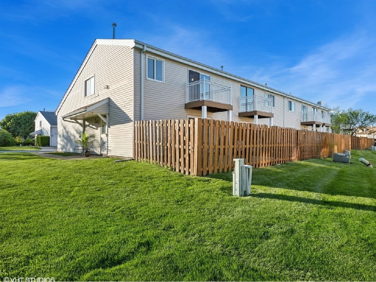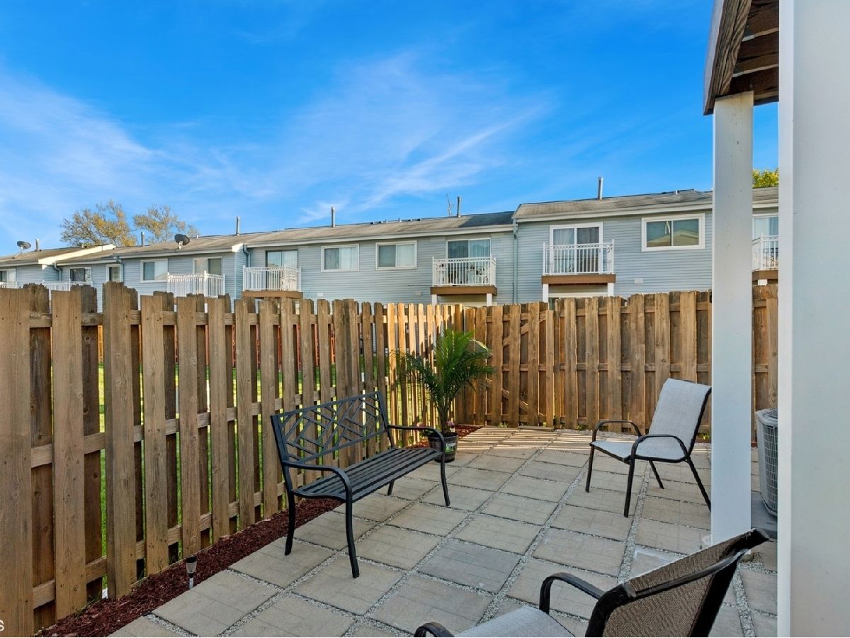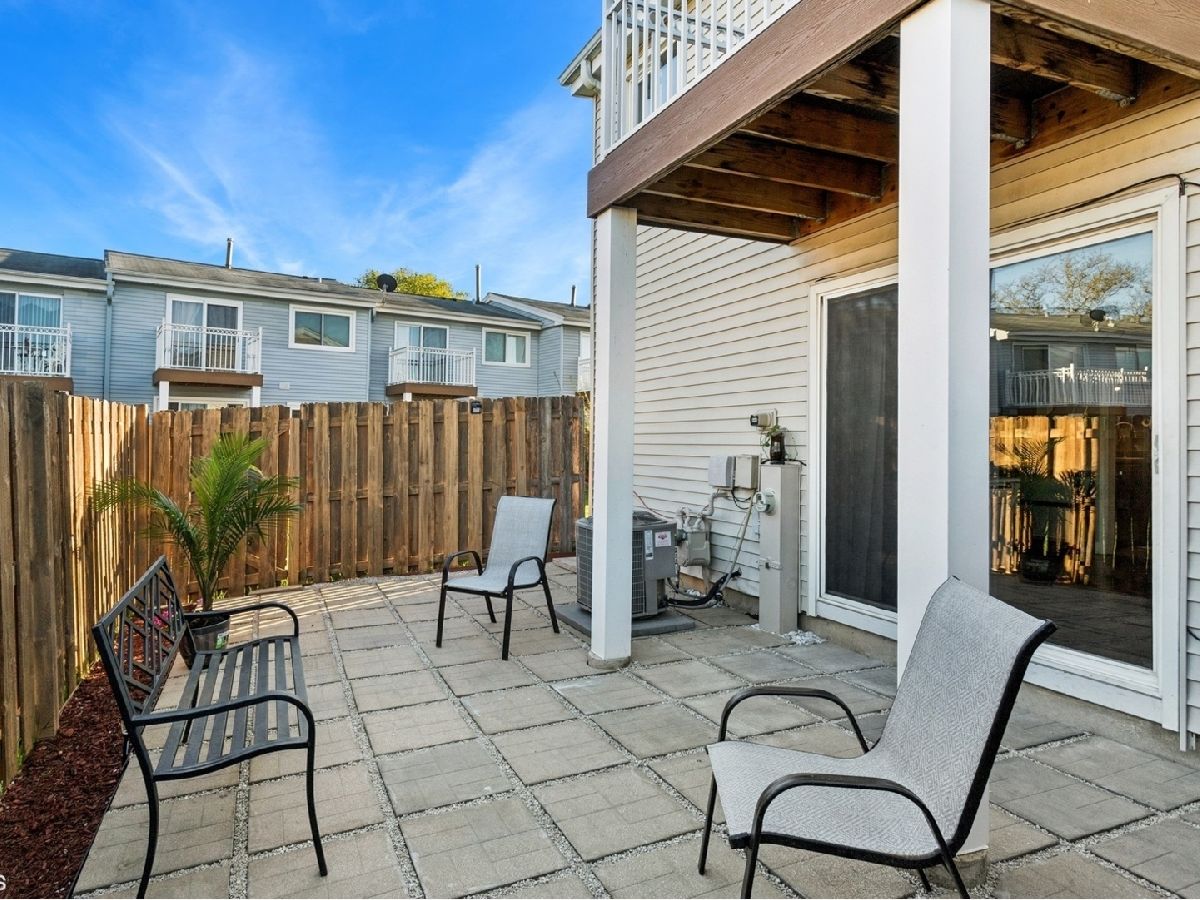 Welcome to this stunning two story 3-bedroom, 1.5-bath townhome featuring a 1-car garage and an extended driveway for additional parking. As an end unit, it offers extra privacy and two outdoor paver patio spaces for entertaining-plus a private balcony of the primary bedroom, perfect for relaxing. Step inside to find an updated galley kitchen with maple soft-close cabinets, ceramic tile flooring, matching backsplash, a vent hood, and dishwasher. The separate dining room and open living room area include decorative wood columns and an accent wall, adding charm and character. Upstairs, enjoy beautiful wood laminate flooring throughout and a laundry closet with washer and dryer for convenience. The spacious primary bedroom features a wall-to-wall beveled mirrored closet and access to the private balcony. Both bathrooms have been tastefully updated. The home also offers central A/C, and a privacy fence enclosing both front and rear patios. Located walking distance to the clubhouse and pool, and just minutes from shopping, dining, and I-355. Don't miss this move-in-ready gem-schedule your showing today!