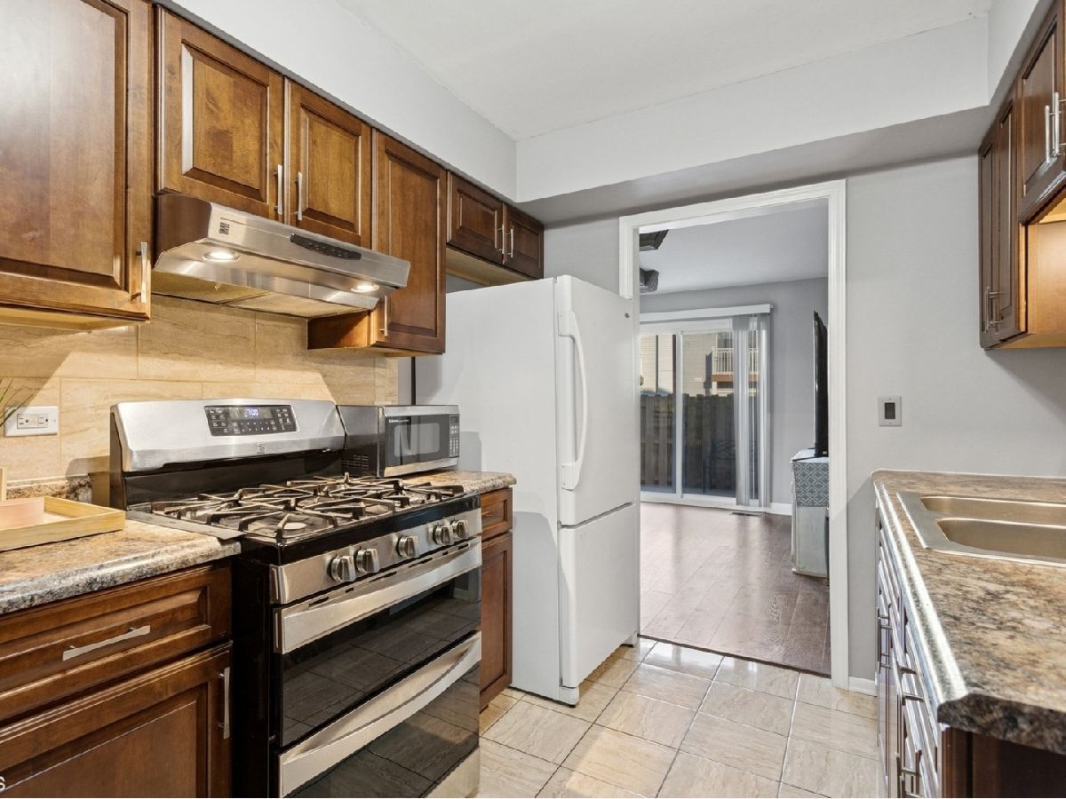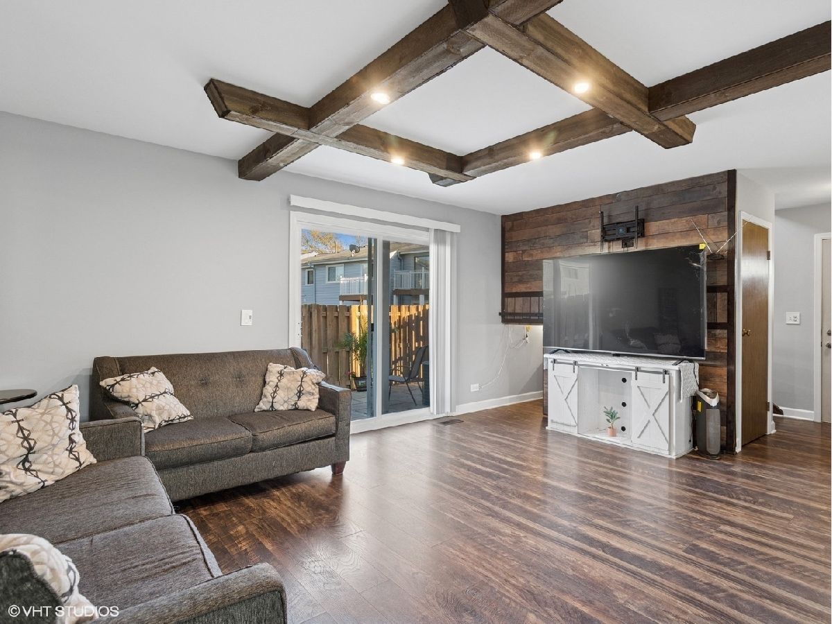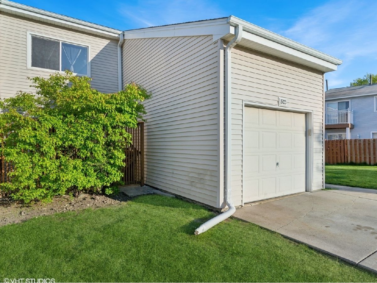 Welcome to this stunning two story 3-bedroom, 1.5-bath townhome featuring a 1-car garage and an extended driveway for additional parking. As an end unit, it offers extra privacy and two outdoor paver patio spaces for entertaining-plus a private balcony of the primary bedroom, perfect for relaxing. Step inside to find an updated galley kitchen with maple soft-close cabinets, ceramic tile flooring, matching backsplash, a vent hood, and dishwasher. The separate dining room and open living room area include decorative wood columns and an accent wall, adding charm and character. Upstairs, enjoy beautiful wood laminate flooring throughout and a laundry closet with washer and dryer for convenience. The spacious primary bedroom features a wall-to-wall beveled mirrored closet and access to the private balcony. Both bathrooms have been tastefully updated. The home also offers central A/C, and a privacy fence enclosing both front and rear patios. Located walking distance to the clubhouse and pool, and just minutes from shopping, dining, and I-355. Don't miss this move-in-ready gem-schedule your showing today!
