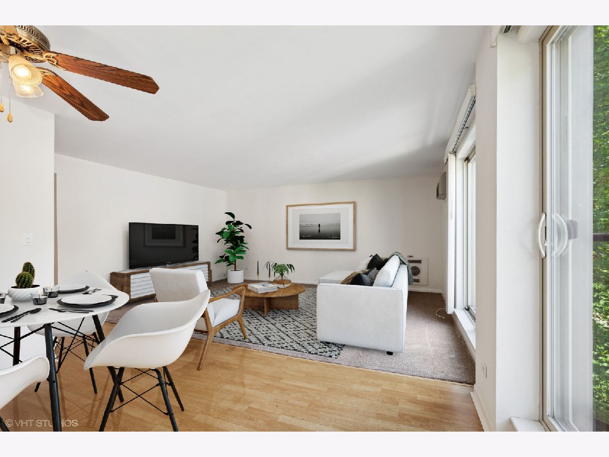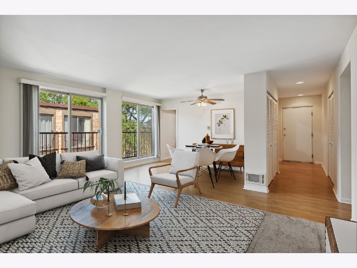 Discover a rare find in the heart of downtown Northbrook - this beautiful 2-bedroom, 1-bathroom top-floor condo that offers convenience, comfort, and investment potential! Home features gleaming wood laminate flooring and newer carpeting, plus floor-to-ceiling sliders with charming Juliet balconies, filling the home with natural light. Large kitchen with plenty of cabinet space, and an open living room/dining room that provides an ideal space for relaxation and entertainment. Two nice-sized bedrooms and a full bathroom complete the home. In-unit laundry, electric heat and assigned parking space. Whether you're an investor looking to expand your portfolio or an individual exploring an astute home purchase, this rarely available condo is a great buy!