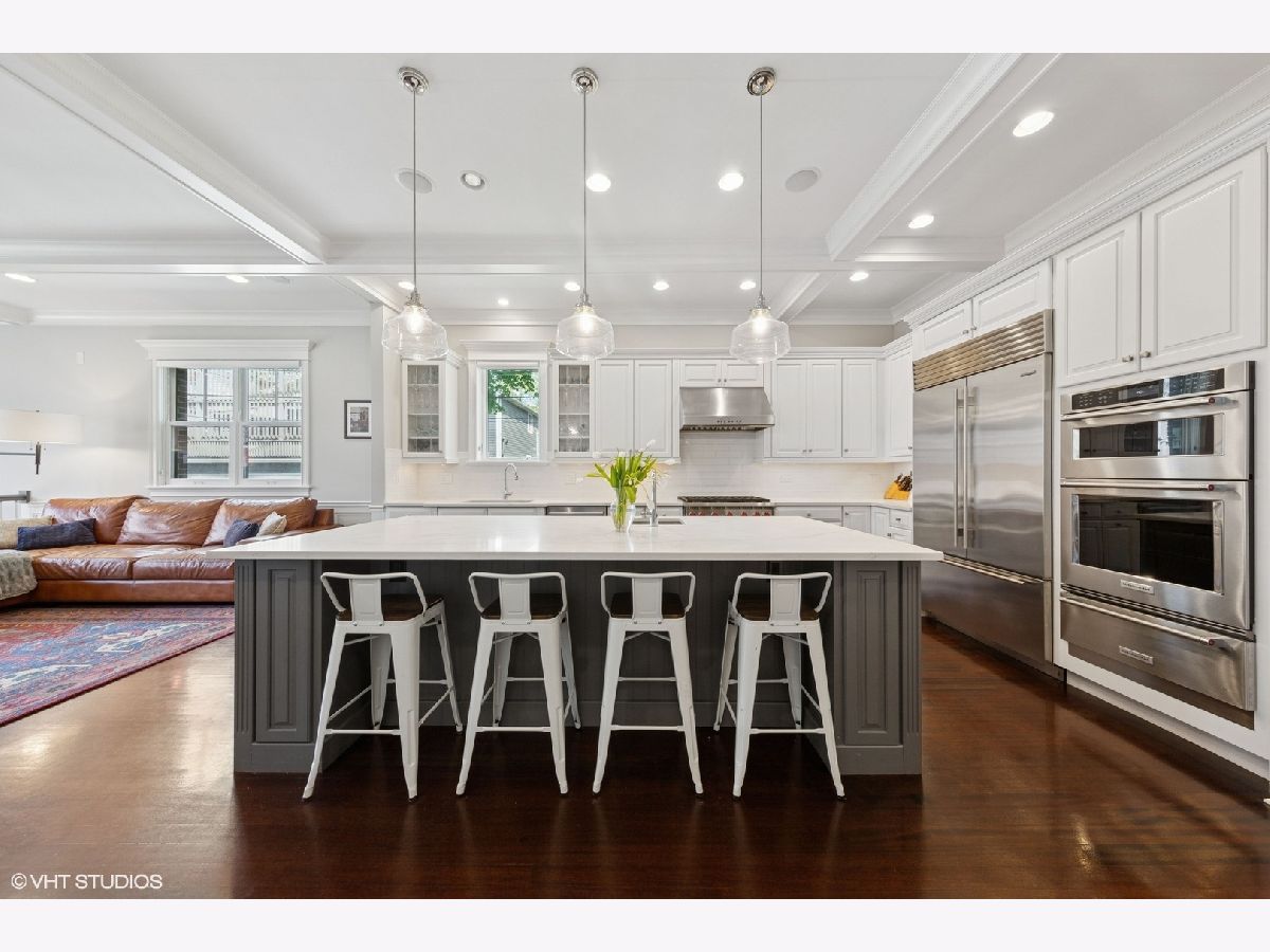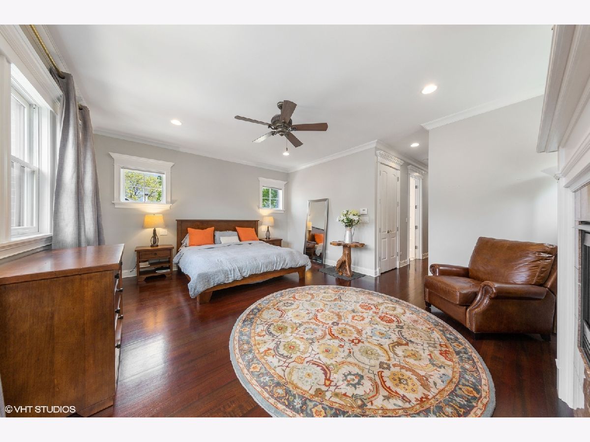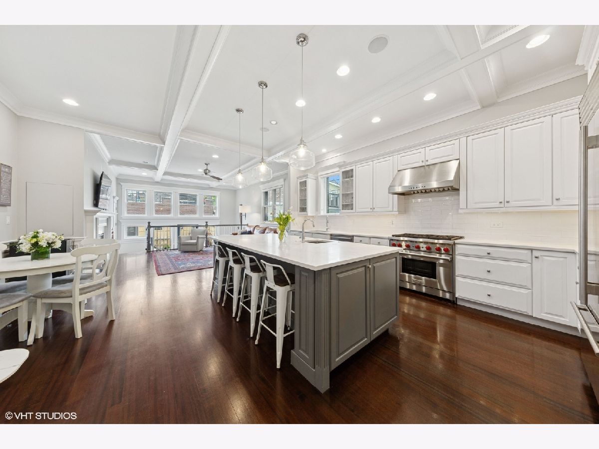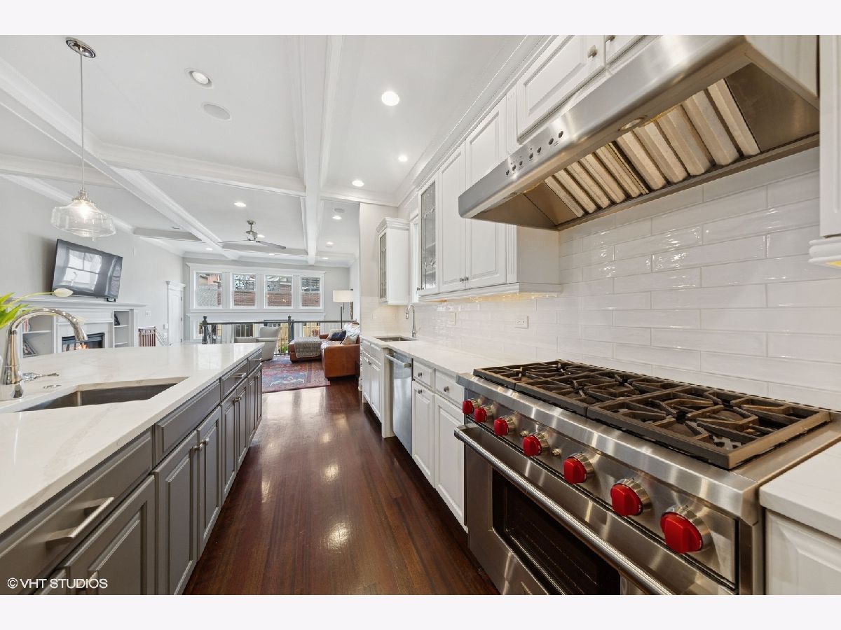 This stunning brick and limestone corner home built by Paul Petersen sits on a tree-lined street in the heart of Roscoe Village. This 4-bedroom, 3.5-bath residence blends timeless elegance with modern comforts and a layout perfect for everyday living and entertaining. Step inside to find soaring ceilings, abundant natural light, and thoughtful finishes throughout. The spacious main level features formal living and dining areas accented by one of four fireplaces. At the heart of the home is a professionally designed chef's kitchen with a massive 9-foot quartz island, Wolf six-burner gas range and oven (2024), Bosch 800 series dishwasher (2024), KitchenAid microwave, oven and warming drawer (2024), Sub-Zero refrigerator (2019/20), and custom cabinetry-all anchored by sleek granite countertops and bar seating beneath sophisticated pendant lighting. Flowing seamlessly from the kitchen is an expansive great room featuring a fireplace and custom built-ins, leading to an oversized private rear patio. Beyond, a fully built-out roof deck above the heated two-car garage offers a rare, multi-season outdoor retreat, perfect for dining, lounging, or entertaining. Upstairs features well-proportioned bedrooms with generous closet space, convenient second-floor laundry, and a luxurious primary suite with a fireplace, massive walk-in closet and a spa-like bathroom complete with a jetted tub, steam shower, double vanity and heated floors. The radiant-heated lower level is ideal for relaxation and recreation, featuring a generous family room with fireplace and wet bar, a fourth bedroom, a full bath, and secondary laundry. Beneath plush carpet lies heated flooring for year-round comfort. All of this just steps to parks, shops, restaurants, and top-rated schools, this home blends classic craftsmanship with modern conveniences in one of Chicago's most desirable neighborhoods.