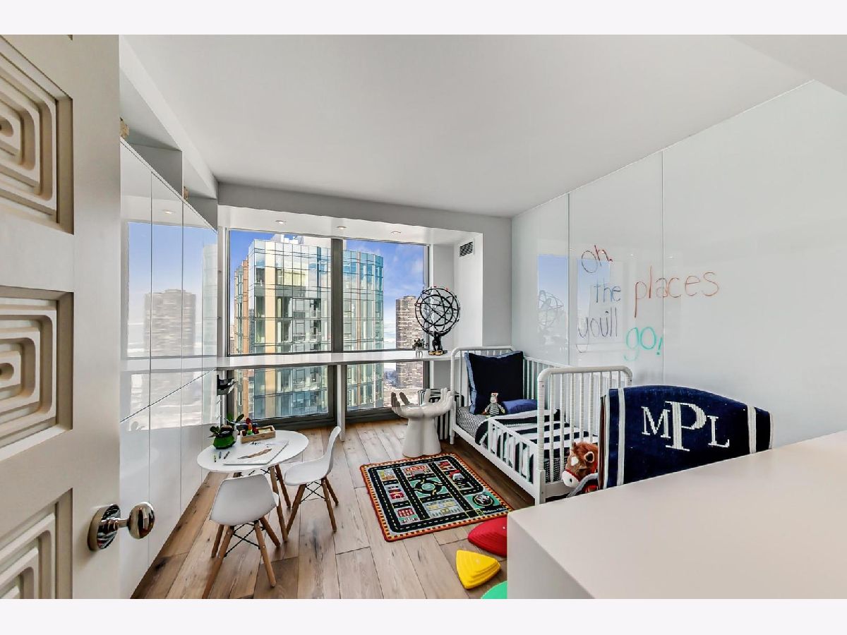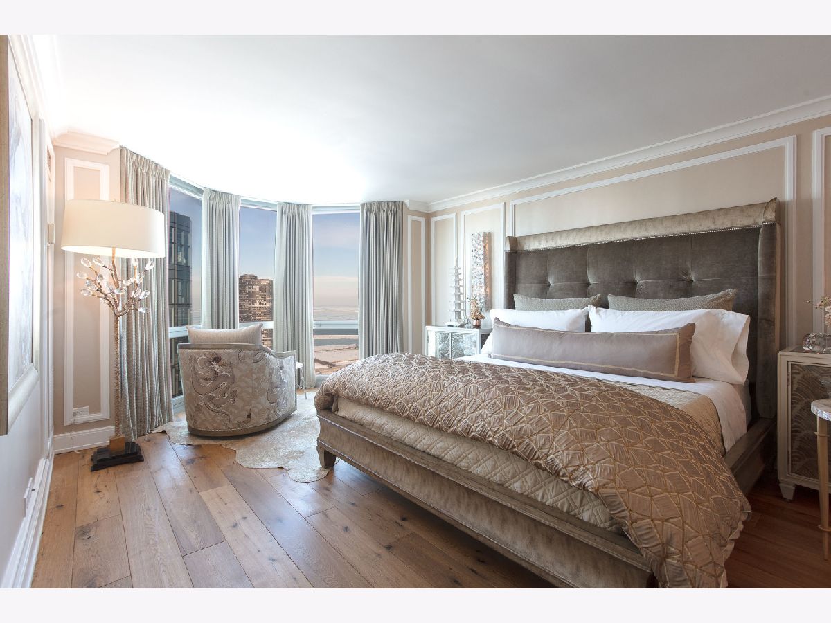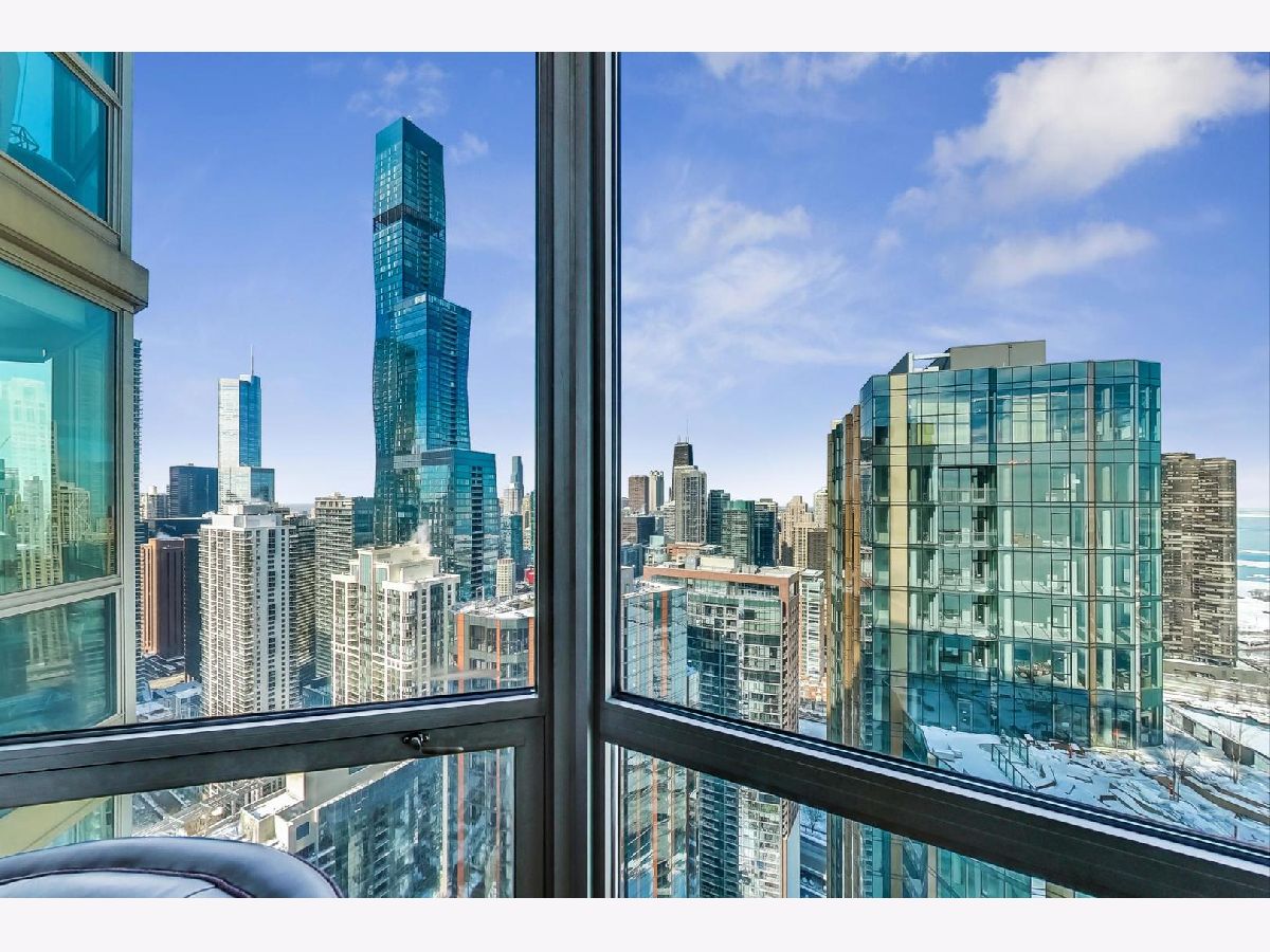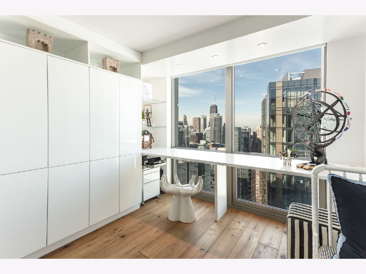 If you're tired of the same "cookie cutter" condo finishes, then this magazine-caliber showstopper is for you! Perched on the 53rd floor, this two-bedroom, two-bathroom home has been tastefully reimagined by Blair Crown Design, appointed with luxurious finishes throughout. The foyer greets you with Maya Romanoff wall coverings, leading to an open living room, dining room, and kitchen. The living room is anchored by a custom library wall, complete with a ladder, leading to the floor-to-ceiling windows, perfectly framing the Chicago skyline, Navy Pier, and Lake Michigan. The chef's kitchen boasts a full Sub Zero/Wolf appliance suite including an induction cooktop, convection steam oven, and built-in coffee system. Not to be missed are the 24K gold plated faucet and matching pot filler over the cooktop, integrated range hood, hammered nickel sink, and hidden spice rack. Abundant storage discreetly tucked behind walls of cabinetry. A sleek marble peninsula with a waterfall edge is perfect for cocktails and casual dining. The adjacent dining area is ideal for a more formal setting, with a custom banquet and table. The primary retreat at the end of the hall feels like a 5-Star hotel with stunning millwork, seating alcove, and dressing area. While the attached bathroom is contemporary and minimal in design, the features are anything but! The space is thoughtfully outfitted with NuWave heated floors and towel rack, recessed Robern medicine cabinets (with interior outlets), oversized glass-enclosed shower with bench, and integrated full height storage cabinet and drawers. The guest bedroom is highlighted by back-painted glass walls, motorized black-out shades, and a wall of custom closets and cabinetry. There's no shortage of high design in the guest bathroom, which has been furnished with a custom vanity, fully tiled walls, and a glass-enclosed shower sporting a bespoke cremone handle. Wide plank hardwood floors, custom window treatments, in unit laundry, and breathtaking ceiling lighting and sconces showcased throughout the home. All of this is located in a full-service building with 24-hour door staff, health club with sauna, 56-57th floor rooftop pool/sundeck, dog run, tennis court, and valet parking (included). Fantastic location with easy access to Lake Michigan, Riverwalk, exclusive New Eastside park, Maggie Daley & Millennium Parks, and the pedway. Connected passageway to Bockwinkel's and steps from Mariano's. All furniture is for sale.