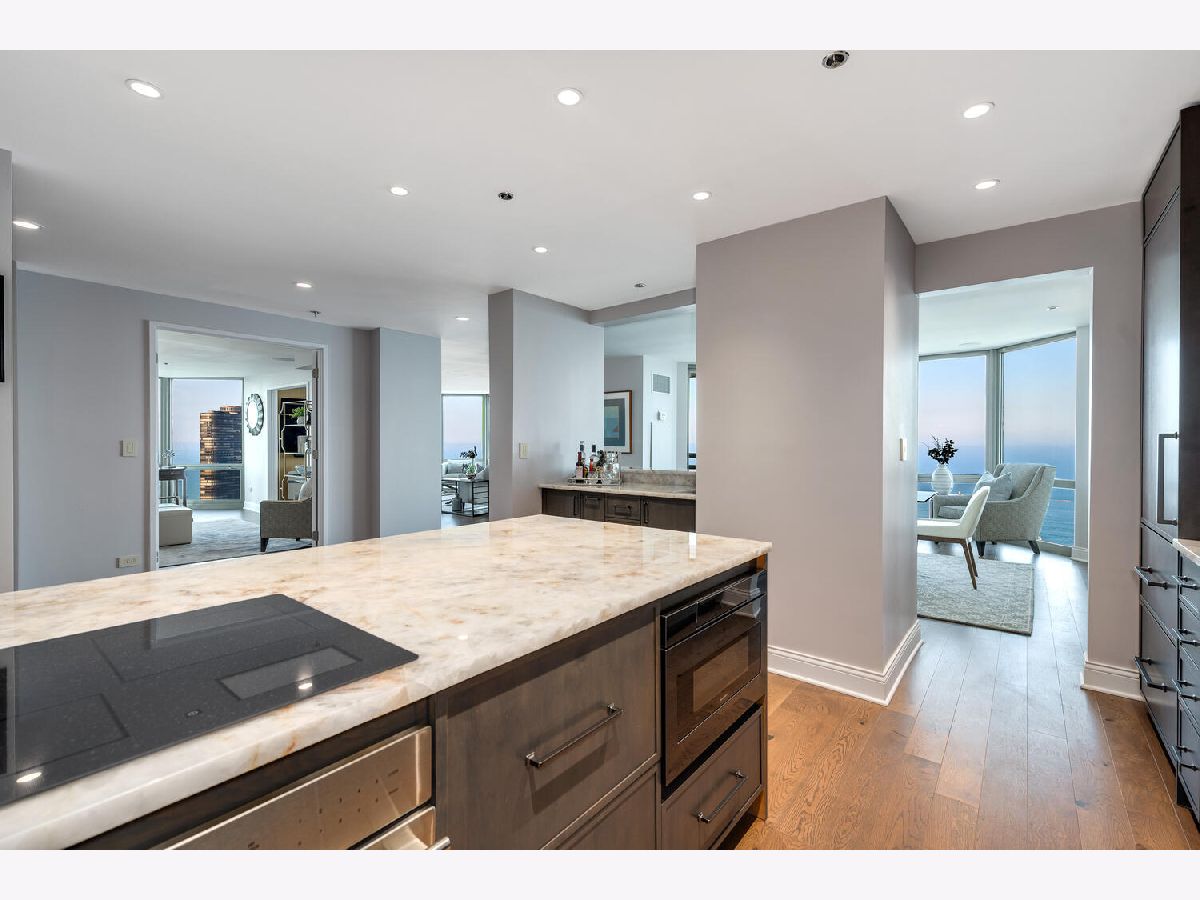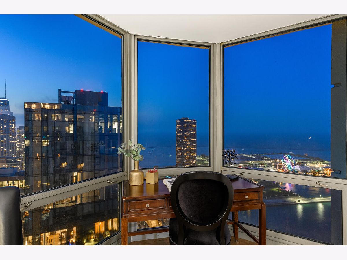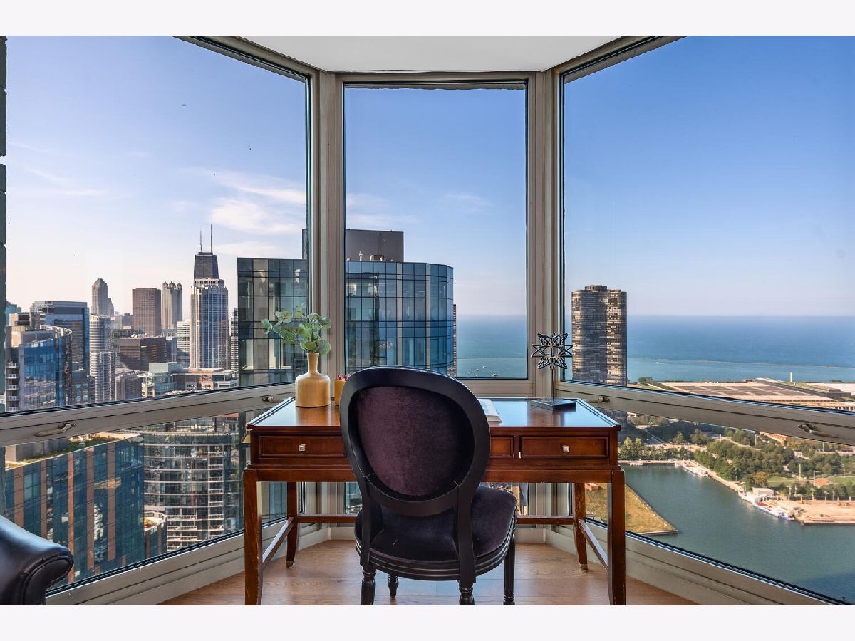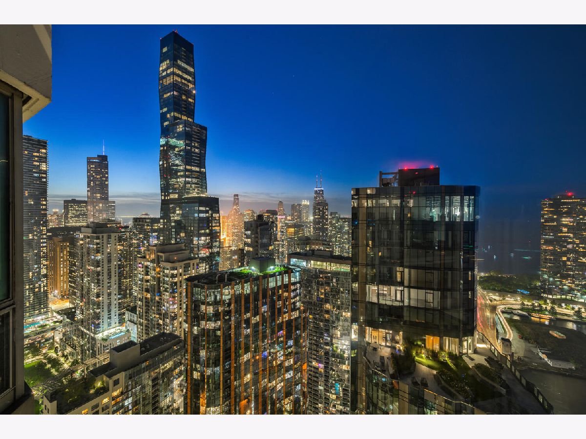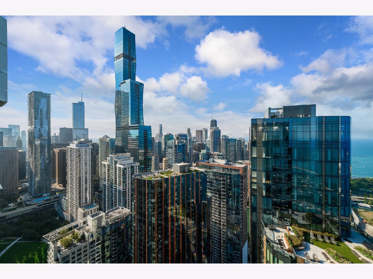 Welcome to the pinnacle of luxury living in Lakeshore East's premier 55th-floor penthouse at the Park Shore, a newly renovated masterpiece offering 2,650 square feet of exquisite living space. This stunning 3-bedroom, 2.5-bathroom corner unit is a rare find, featuring a private balcony and two heated garage parking spaces. From every room, you'll be captivated by unobstructed 180-degree views of Navy Pier, Lake Michigan, and the Chicago skyline, framed by expansive windows that flood the home with natural light. The gourmet kitchen, designed for both casual dining and grand entertaining, boasts quartzite countertops and backsplash, custom Omega cabinetry with walnut drawers, and professional-grade Wolf, Subzero, and Bosch appliances. The oversized peninsula with a breakfast bar, along with a built-in wet bar featuring a wine fridge and filtered water tap, make this kitchen a true chef's delight. Adjacent to the kitchen is a spacious dining area and a separate living room with custom built-ins, offering direct access to the balcony, perfect for morning coffee or sunset cocktails. The luxurious primary suite, expanded by an additional 450 square feet acquired from another unit, is a serene retreat with French doors leading from the bedroom to an oversized family room and office space, which can be converted into a fourth bedroom if desired. The spa-like en-suite bathroom features a dual vanity, soaking tub, and walk-in shower, while the suite also includes a kitchenette, full laundry room with sink, and a second private entrance, offering flexibility for guests or in-law quarters. Two additional bedrooms, including one with its own en-suite bath, a half bath, and Sonos ceiling speakers complete this magnificent residence. As part of a full-amenity building, you'll enjoy 24 hour door staff, an outdoor pool, sundeck, grills, indoor spa, fitness center with Pilates studio, tennis, bocce ball and pickleball courts, a dog park, cleaners, and valet parking for guests. With convenient access to the lakefront, Millennium Park, and the vibrant dining and shopping scene of Lakeshore East, this penthouse is a truly unparalleled offering.