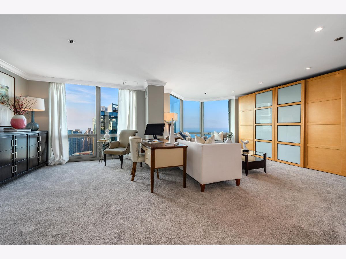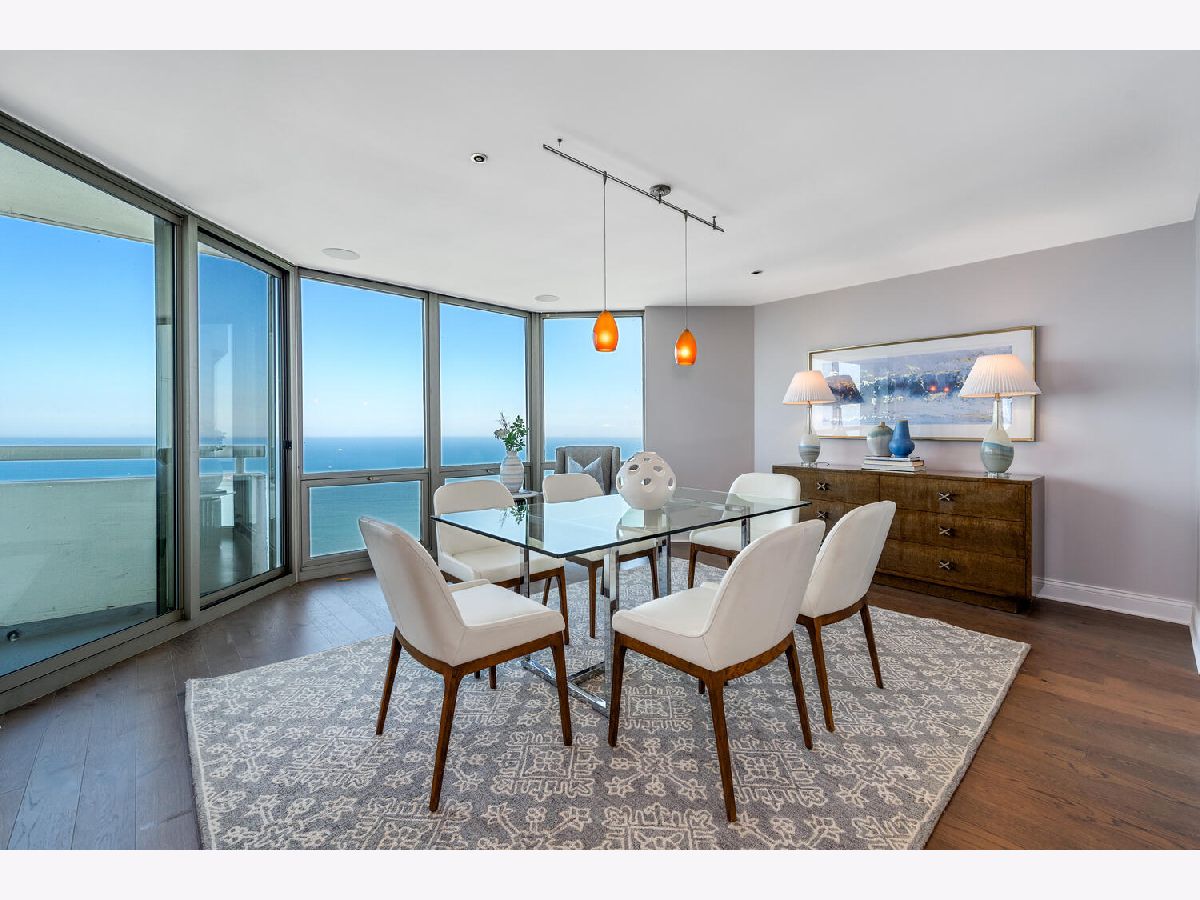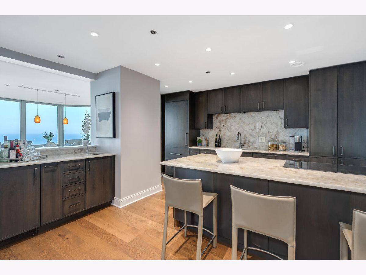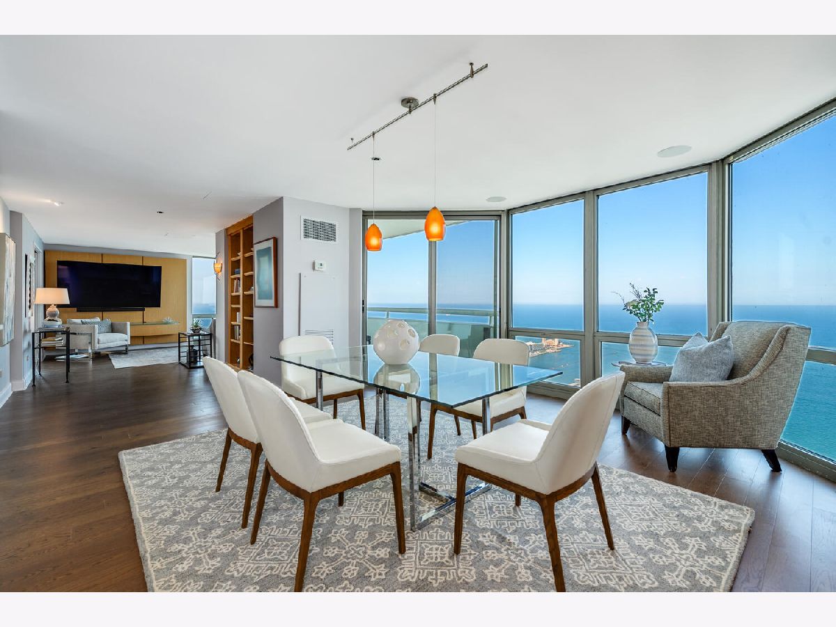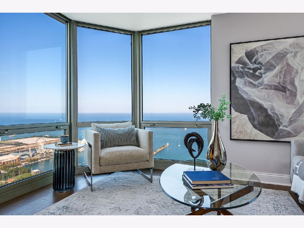Welcome to the pinnacle of luxury living in Lakeshore East's premier 55th-floor penthouse at the Park Shore, a newly renovated masterpiece offering 2,650 square feet of exquisite living space. This stunning 3-bedroom, 2.5-bathroom corner unit is a rare find, featuring a private balcony and two heated garage parking spaces. From every room, you'll be captivated by unobstructed 180-degree views of Navy Pier, Lake Michigan, and the Chicago skyline, framed by expansive windows that flood the home with natural light. The gourmet kitchen, designed for both casual dining and grand entertaining, boasts quartzite countertops and backsplash, custom Omega cabinetry with walnut drawers, and professional-grade Wolf, Subzero, and Bosch appliances. The oversized peninsula with a breakfast bar, along with a built-in wet bar featuring a wine fridge and filtered water tap, make this kitchen a true chef's delight. Adjacent to the kitchen is a spacious dining area and a separate living room with custom built-ins, offering direct access to the balcony, perfect for morning coffee or sunset cocktails. The luxurious primary suite, expanded by an additional 450 square feet acquired from another unit, is a serene retreat with French doors leading from the bedroom to an oversized family room and office space, which can be converted into a fourth bedroom if desired. The spa-like en-suite bathroom features a dual vanity, soaking tub, and walk-in shower, while the suite also includes a kitchenette, full laundry room with sink, and a second private entrance, offering flexibility for guests or in-law quarters. Two additional bedrooms, including one with its own en-suite bath, a half bath, and Sonos ceiling speakers complete this magnificent residence. As part of a full-amenity building, you'll enjoy 24 hour door staff, an outdoor pool, sundeck, grills, indoor spa, fitness center with Pilates studio, tennis, bocce ball and pickleball courts, a dog park, cleaners, and valet parking for guests. With convenient access to the lakefront, Millennium Park, and the vibrant dining and shopping scene of Lakeshore East, this penthouse is a truly unparalleled offering.