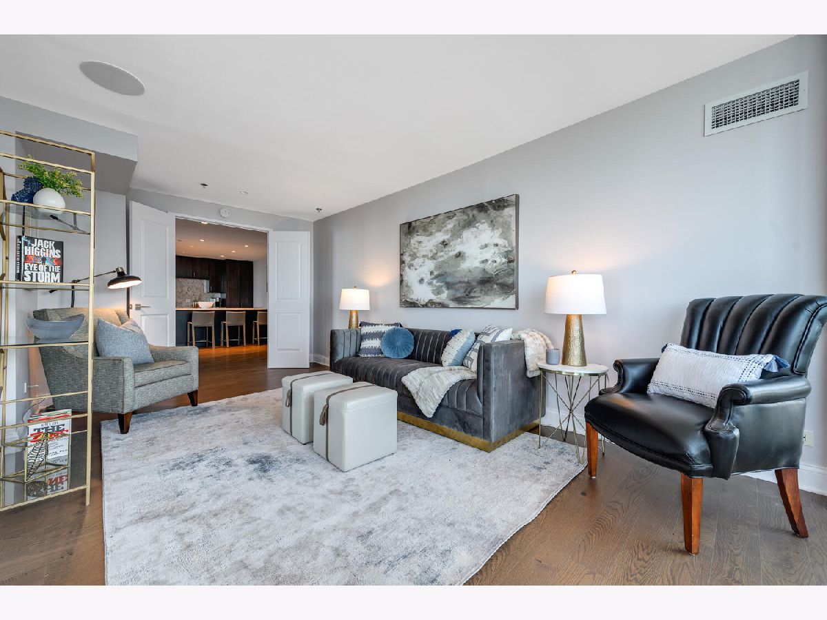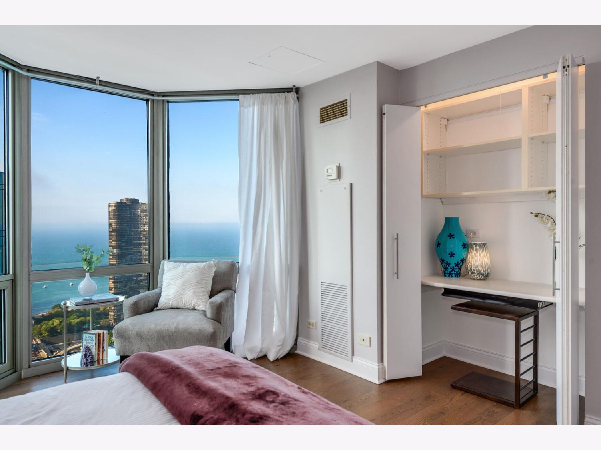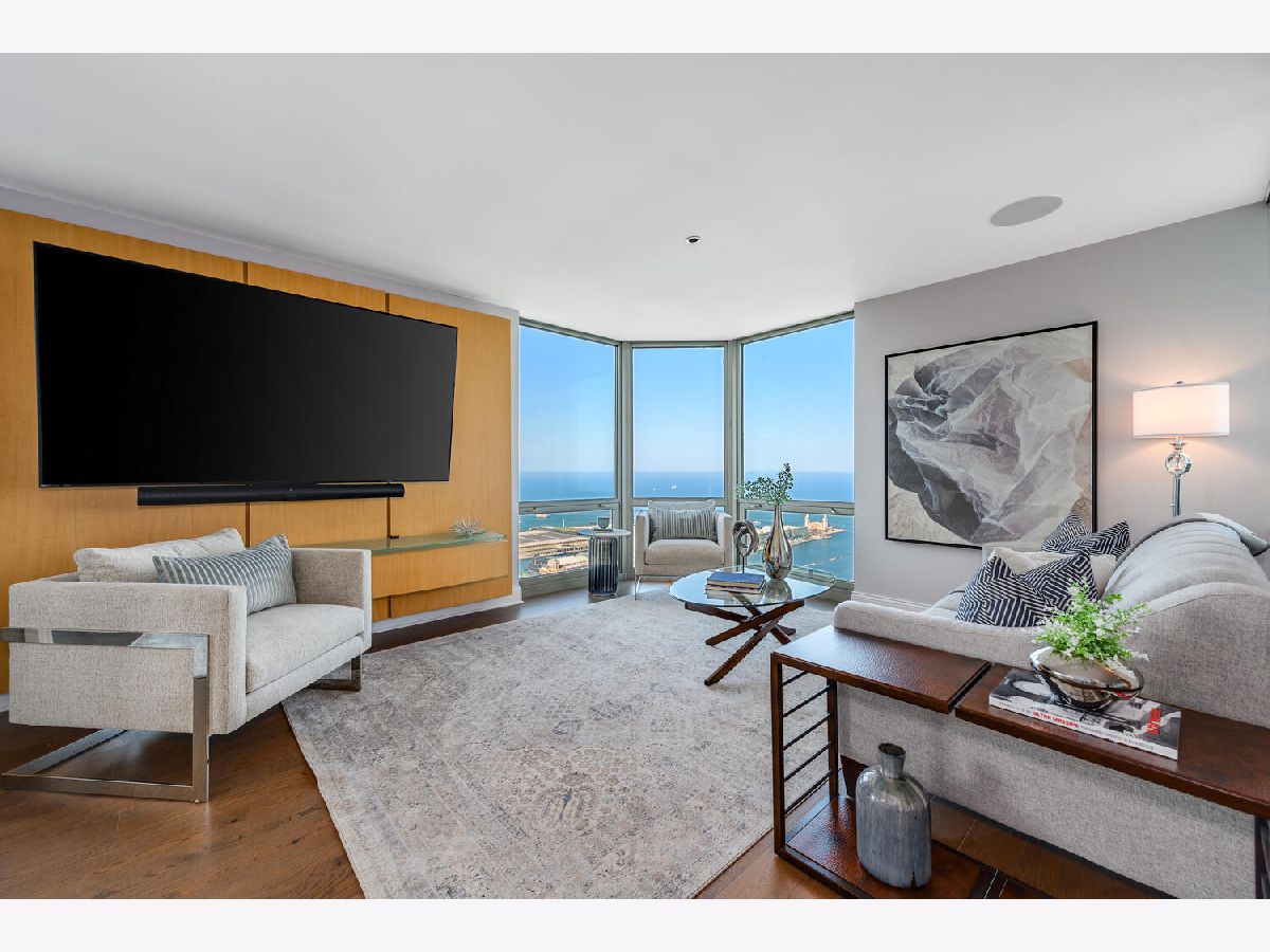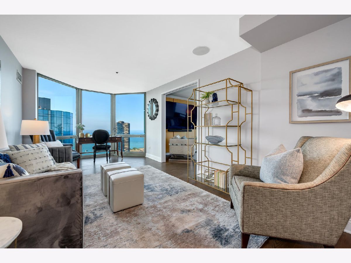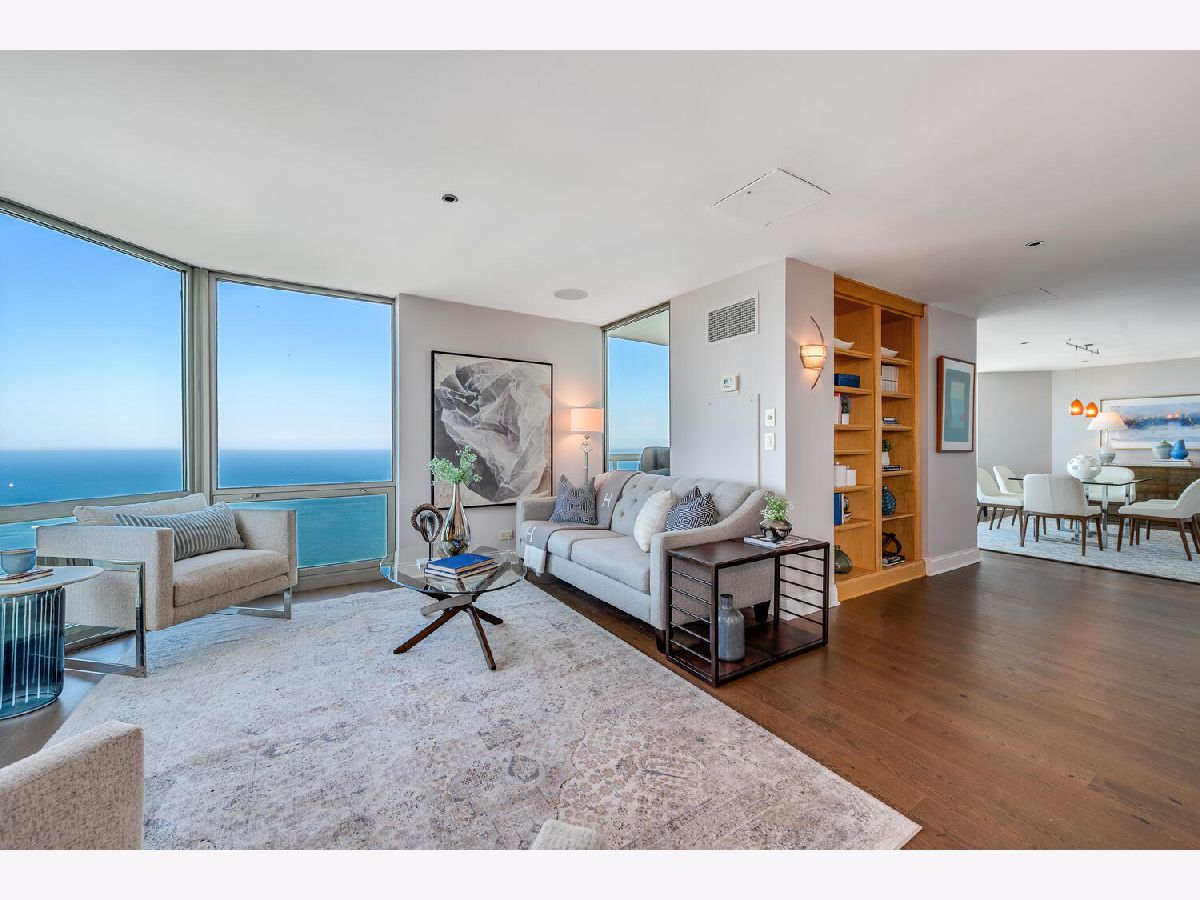 Welcome to the pinnacle of luxury living in Lakeshore East's premier 55th-floor penthouse at the Park Shore, a newly renovated masterpiece offering 2,650 square feet of exquisite living space. This stunning 3-bedroom, 2.5-bathroom corner unit is a rare find, featuring a private balcony and two heated garage parking spaces. From every room, you'll be captivated by unobstructed 180-degree views of Navy Pier, Lake Michigan, and the Chicago skyline, framed by expansive windows that flood the home with natural light. The gourmet kitchen, designed for both casual dining and grand entertaining, boasts quartzite countertops and backsplash, custom Omega cabinetry with walnut drawers, and professional-grade Wolf, Subzero, and Bosch appliances. The oversized peninsula with a breakfast bar, along with a built-in wet bar featuring a wine fridge and filtered water tap, make this kitchen a true chef's delight. Adjacent to the kitchen is a spacious dining area and a separate living room with custom built-ins, offering direct access to the balcony, perfect for morning coffee or sunset cocktails. The luxurious primary suite, expanded by an additional 450 square feet acquired from another unit, is a serene retreat with French doors leading from the bedroom to an oversized family room and office space, which can be converted into a fourth bedroom if desired. The spa-like en-suite bathroom features a dual vanity, soaking tub, and walk-in shower, while the suite also includes a kitchenette, full laundry room with sink, and a second private entrance, offering flexibility for guests or in-law quarters. Two additional bedrooms, including one with its own en-suite bath, a half bath, and Sonos ceiling speakers complete this magnificent residence. As part of a full-amenity building, you'll enjoy 24 hour door staff, an outdoor pool, sundeck, grills, indoor spa, fitness center with Pilates studio, tennis, bocce ball and pickleball courts, a dog park, cleaners, and valet parking for guests. With convenient access to the lakefront, Millennium Park, and the vibrant dining and shopping scene of Lakeshore East, this penthouse is a truly unparalleled offering.