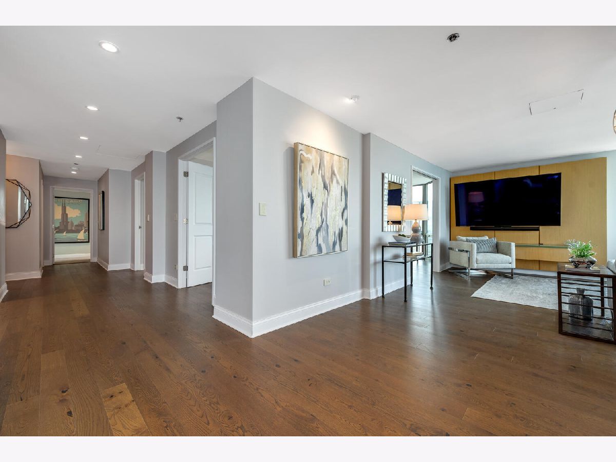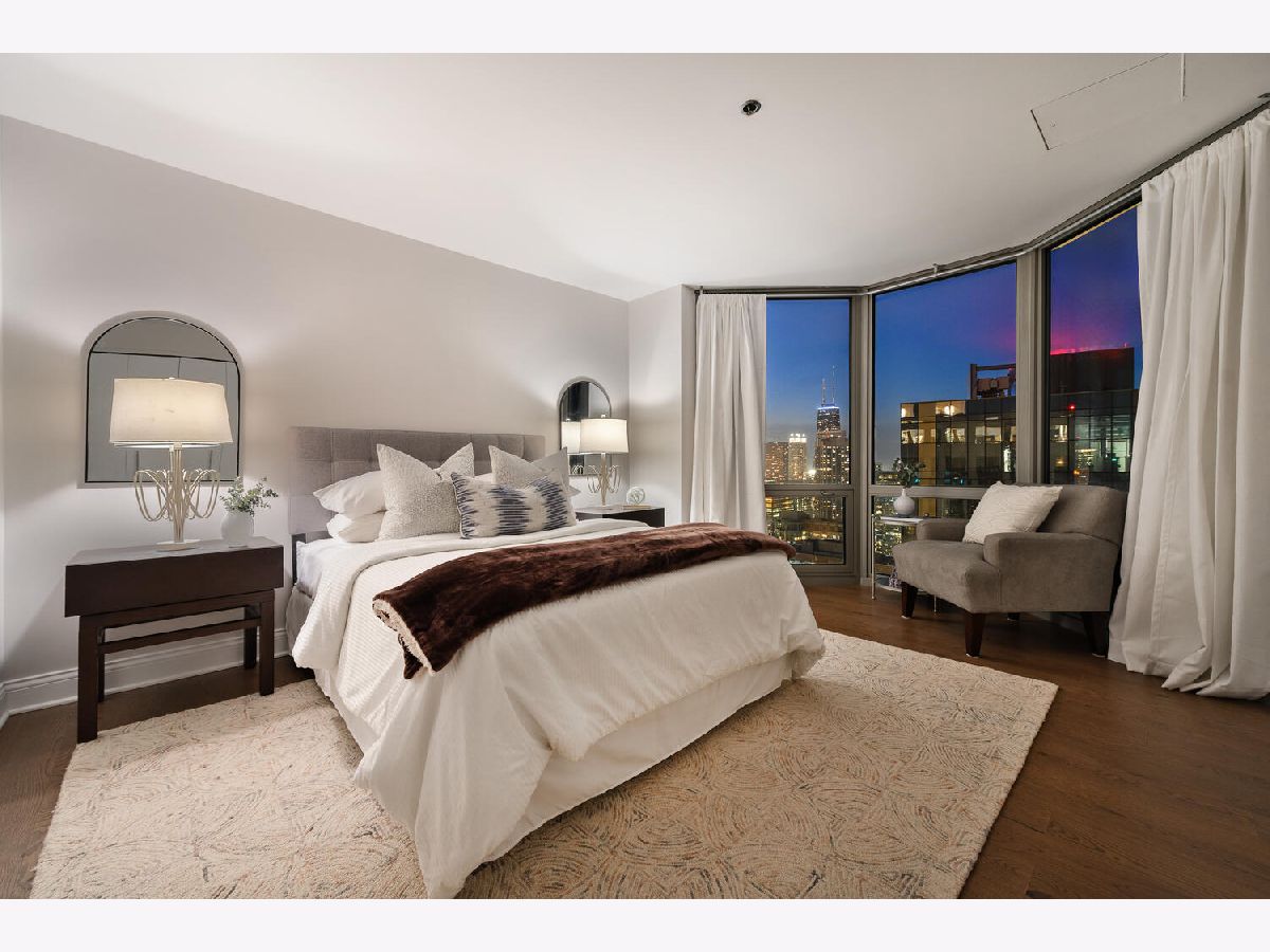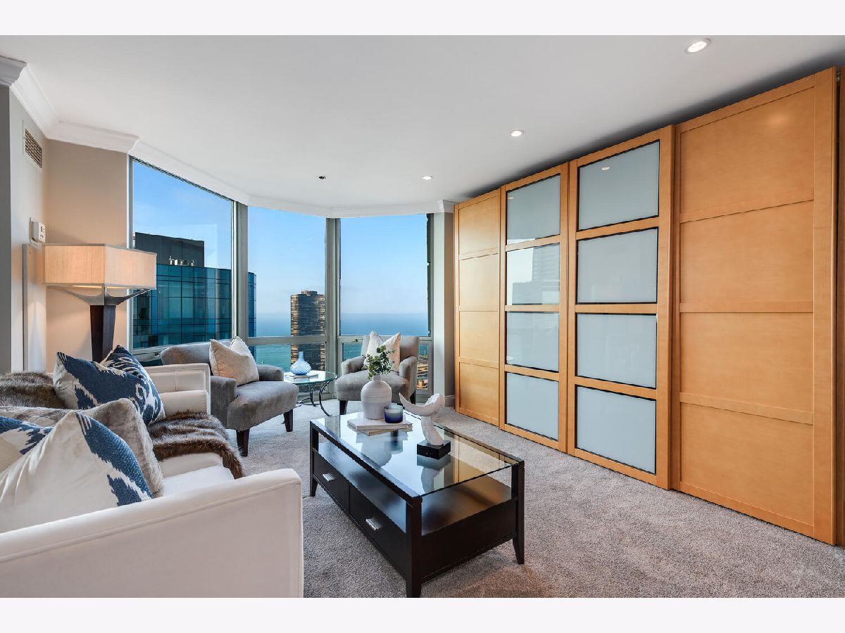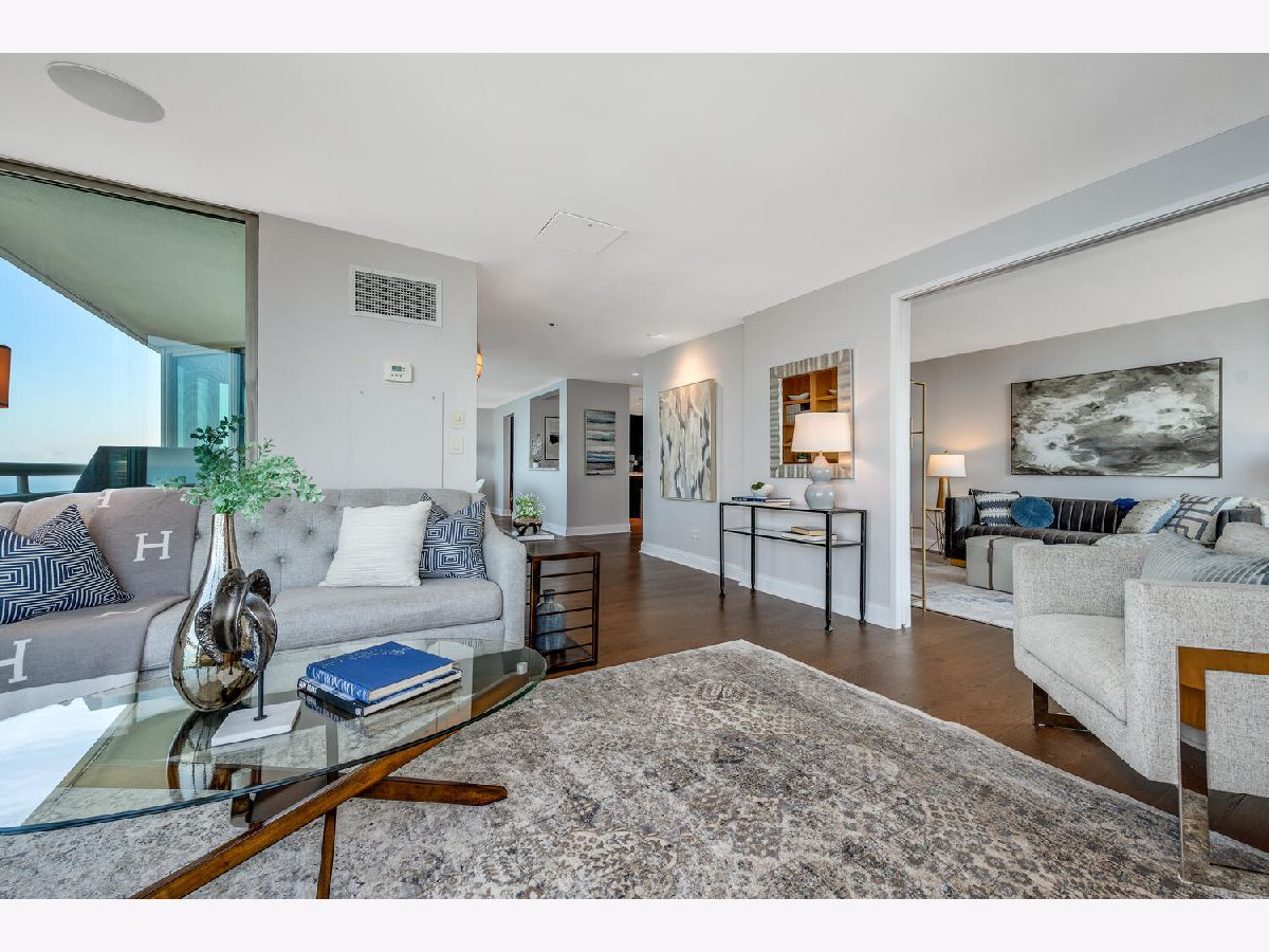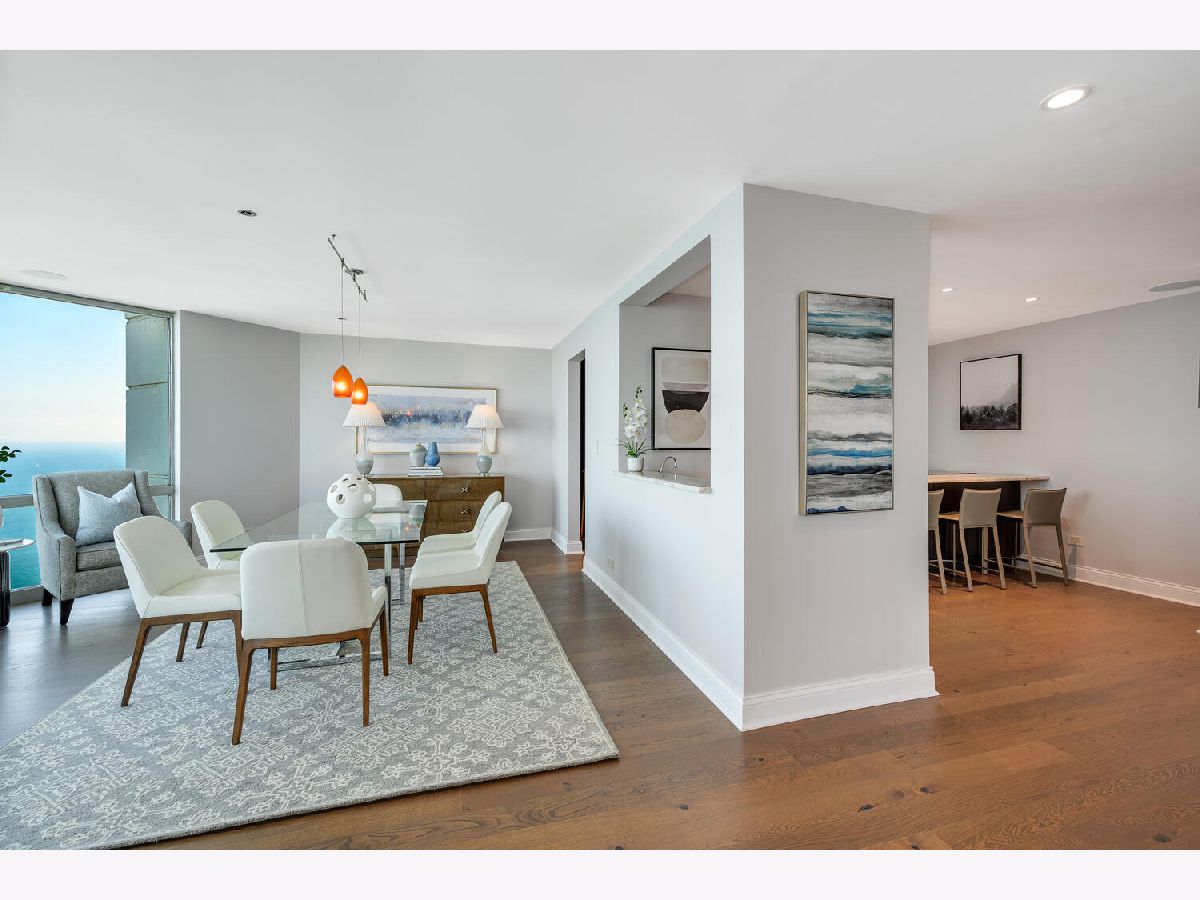 Welcome to the pinnacle of luxury living in Lakeshore East's premier 55th-floor penthouse at the Park Shore, a newly renovated masterpiece offering 2,650 square feet of exquisite living space. This stunning 3-bedroom, 2.5-bathroom corner unit is a rare find, featuring a private balcony and two heated garage parking spaces. From every room, you'll be captivated by unobstructed 180-degree views of Navy Pier, Lake Michigan, and the Chicago skyline, framed by expansive windows that flood the home with natural light. The gourmet kitchen, designed for both casual dining and grand entertaining, boasts quartzite countertops and backsplash, custom Omega cabinetry with walnut drawers, and professional-grade Wolf, Subzero, and Bosch appliances. The oversized peninsula with a breakfast bar, along with a built-in wet bar featuring a wine fridge and filtered water tap, make this kitchen a true chef's delight. Adjacent to the kitchen is a spacious dining area and a separate living room with custom built-ins, offering direct access to the balcony, perfect for morning coffee or sunset cocktails. The luxurious primary suite, expanded by an additional 450 square feet acquired from another unit, is a serene retreat with French doors leading from the bedroom to an oversized family room and office space, which can be converted into a fourth bedroom if desired. The spa-like en-suite bathroom features a dual vanity, soaking tub, and walk-in shower, while the suite also includes a kitchenette, full laundry room with sink, and a second private entrance, offering flexibility for guests or in-law quarters. Two additional bedrooms, including one with its own en-suite bath, a half bath, and Sonos ceiling speakers complete this magnificent residence. As part of a full-amenity building, you'll enjoy 24 hour door staff, an outdoor pool, sundeck, grills, indoor spa, fitness center with Pilates studio, tennis, bocce ball and pickleball courts, a dog park, cleaners, and valet parking for guests. With convenient access to the lakefront, Millennium Park, and the vibrant dining and shopping scene of Lakeshore East, this penthouse is a truly unparalleled offering.