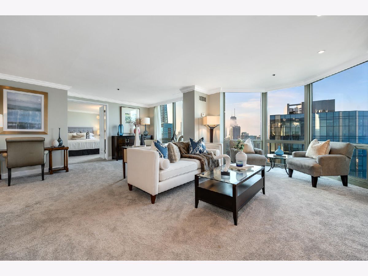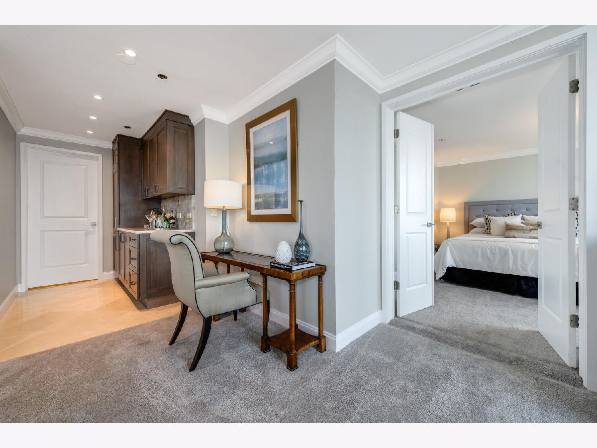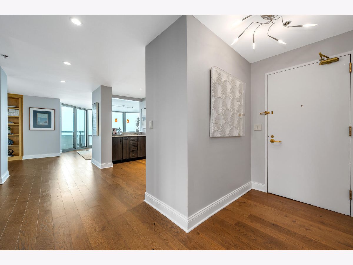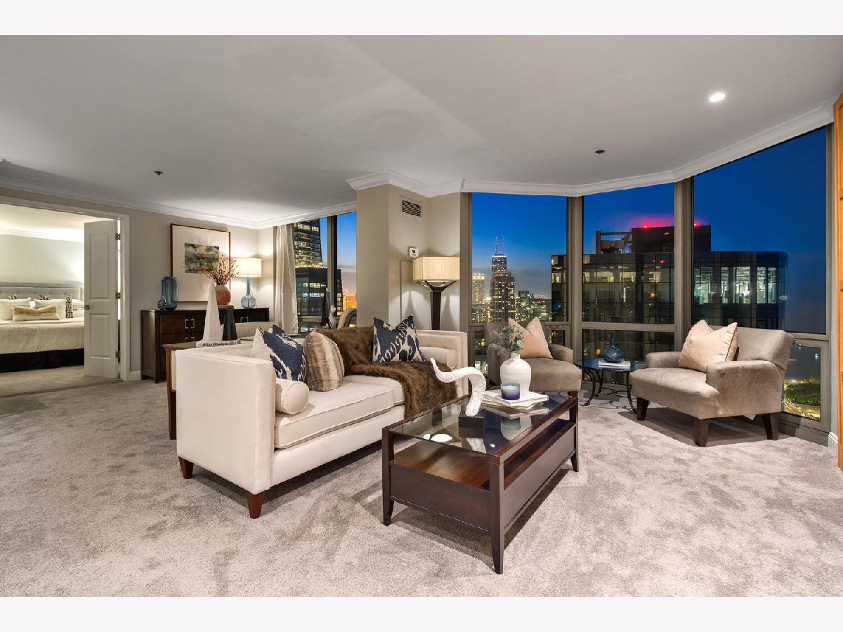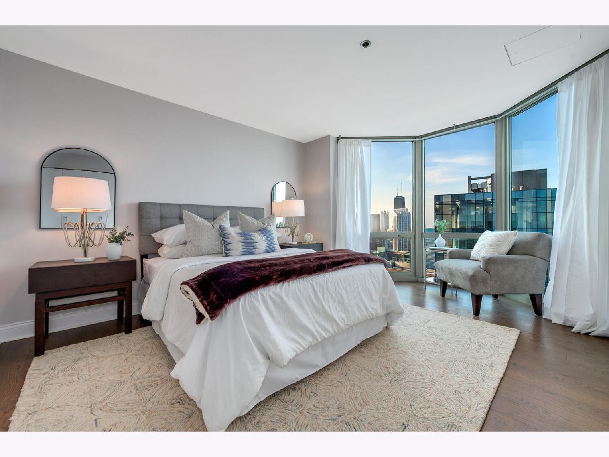 Welcome to the pinnacle of luxury living in Lakeshore East's premier 55th-floor penthouse at the Park Shore, a newly renovated masterpiece offering 2,650 square feet of exquisite living space. This stunning 3-bedroom, 2.5-bathroom corner unit is a rare find, featuring a private balcony and two heated garage parking spaces. From every room, you'll be captivated by unobstructed 180-degree views of Navy Pier, Lake Michigan, and the Chicago skyline, framed by expansive windows that flood the home with natural light. The gourmet kitchen, designed for both casual dining and grand entertaining, boasts quartzite countertops and backsplash, custom Omega cabinetry with walnut drawers, and professional-grade Wolf, Subzero, and Bosch appliances. The oversized peninsula with a breakfast bar, along with a built-in wet bar featuring a wine fridge and filtered water tap, make this kitchen a true chef's delight. Adjacent to the kitchen is a spacious dining area and a separate living room with custom built-ins, offering direct access to the balcony, perfect for morning coffee or sunset cocktails. The luxurious primary suite, expanded by an additional 450 square feet acquired from another unit, is a serene retreat with French doors leading from the bedroom to an oversized family room and office space, which can be converted into a fourth bedroom if desired. The spa-like en-suite bathroom features a dual vanity, soaking tub, and walk-in shower, while the suite also includes a kitchenette, full laundry room with sink, and a second private entrance, offering flexibility for guests or in-law quarters. Two additional bedrooms, including one with its own en-suite bath, a half bath, and Sonos ceiling speakers complete this magnificent residence. As part of a full-amenity building, you'll enjoy 24 hour door staff, an outdoor pool, sundeck, grills, indoor spa, fitness center with Pilates studio, tennis, bocce ball and pickleball courts, a dog park, cleaners, and valet parking for guests. With convenient access to the lakefront, Millennium Park, and the vibrant dining and shopping scene of Lakeshore East, this penthouse is a truly unparalleled offering.