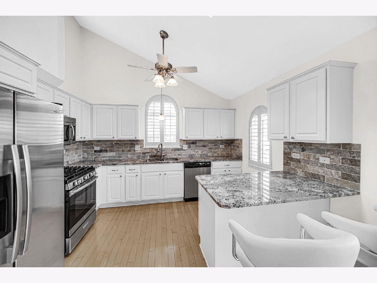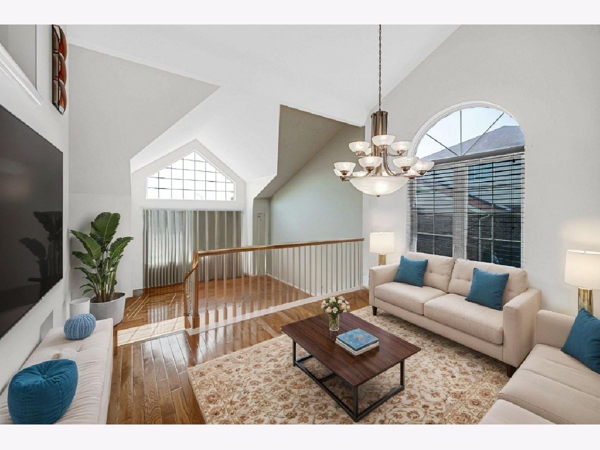 Step into this spectacular, immaculately maintained white brick Forrester Quad located in a quiet, desirable, subdivision. From the moment you enter, you're welcomed by a dramatic open floor plan featuring a sunken living room, soaring cathedral ceilings, loft overlook, and a split staircase that adds architectural elegance. The main level offers a rare additional bedroom and full bath-ideal for guests or multigenerational living. The expansive family room with a cozy fireplace flows seamlessly into a chef's dream kitchen, complete with granite countertops, stone backsplash, skylights, custom wood shutters, and a breakfast nook overlooking the spacious layout. Gleaming oak hardwood floors run throughout the home, including the oversized finished basement that offers generous recreational space and a dedicated theater area-perfect for entertaining or relaxing nights in. Retreat to the luxurious master suite featuring a spa-inspired bath, walk-in closet, and tranquil ambiance. Step outside to your private two-tier deck, tailor-made for hosting and outdoor enjoyment. Just minutes from expressways, shopping, and dining. Immediate occupancy upon closing. Easy to show-don't miss this rare opportunity!