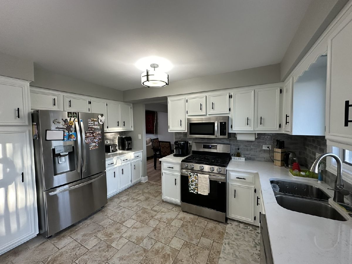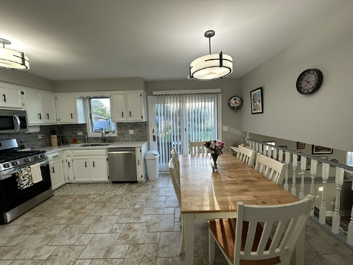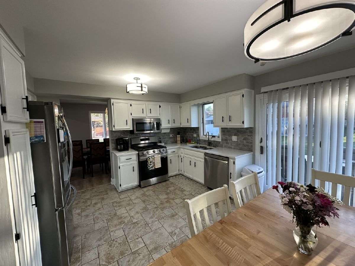 Nestled in the heart of Mokena, this renovated and well maintained split level has 4 bedrooms, 3 full bathrooms in highly sought-after Green Meadows sub division. When you first walk in, you'll be greeted with newer ceramic tile in the foyer. Beautiful luxury vinyl flooring in the main and lower levels. The large eat in kitchen boasts new SS appliances, quartz counter tops with tasteful back splash. Very bright home with extra canned lighting in the main and lower levels. Upstairs you'll find 3 freshly painted bedrooms, full updated hall bath, primary bedroom with updated private bath, new vanity and fixtures. The lower level is complete with family room, cozy fireplace with gas logs that can be turned back to a wood burner, laundry, another bedroom for guests or office, a third full bathroom, drywalled garage with hanging storage, sub-basement with tons of room for storage. Oversized yard with plenty of room for entertaining! Close to shopping, parks, schools, train, dining, etc... Great location! Truly a must see! This home was very well cared for and all the big ticket items have been done! Roof and skylight in '07, windows in '09, A/C & Furnace '14, whole house humidifier and sump pump '14, water heater '11, front door '21, exterior siding stained in '22. Welcome home!