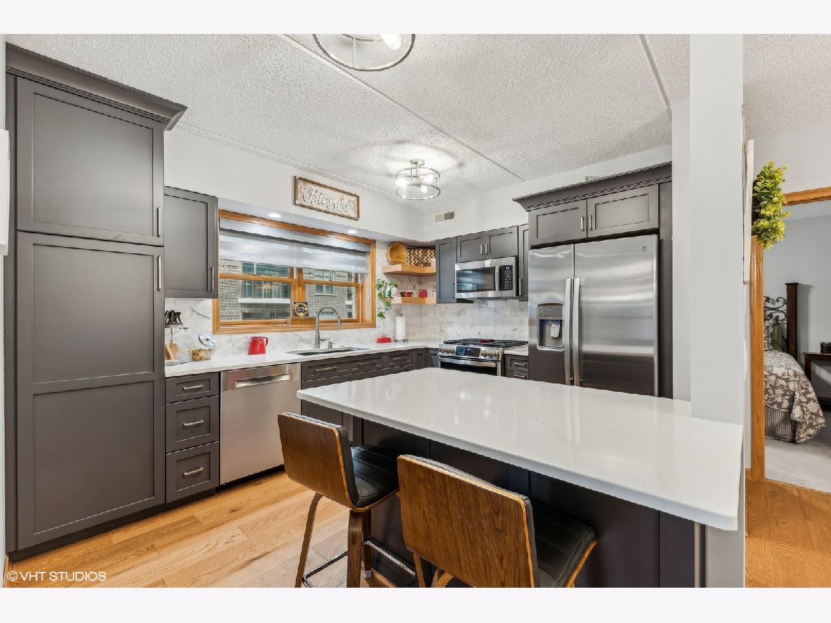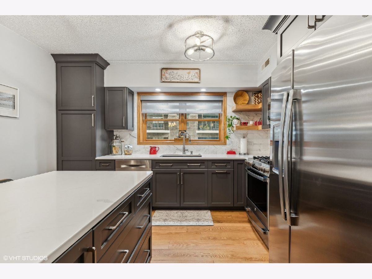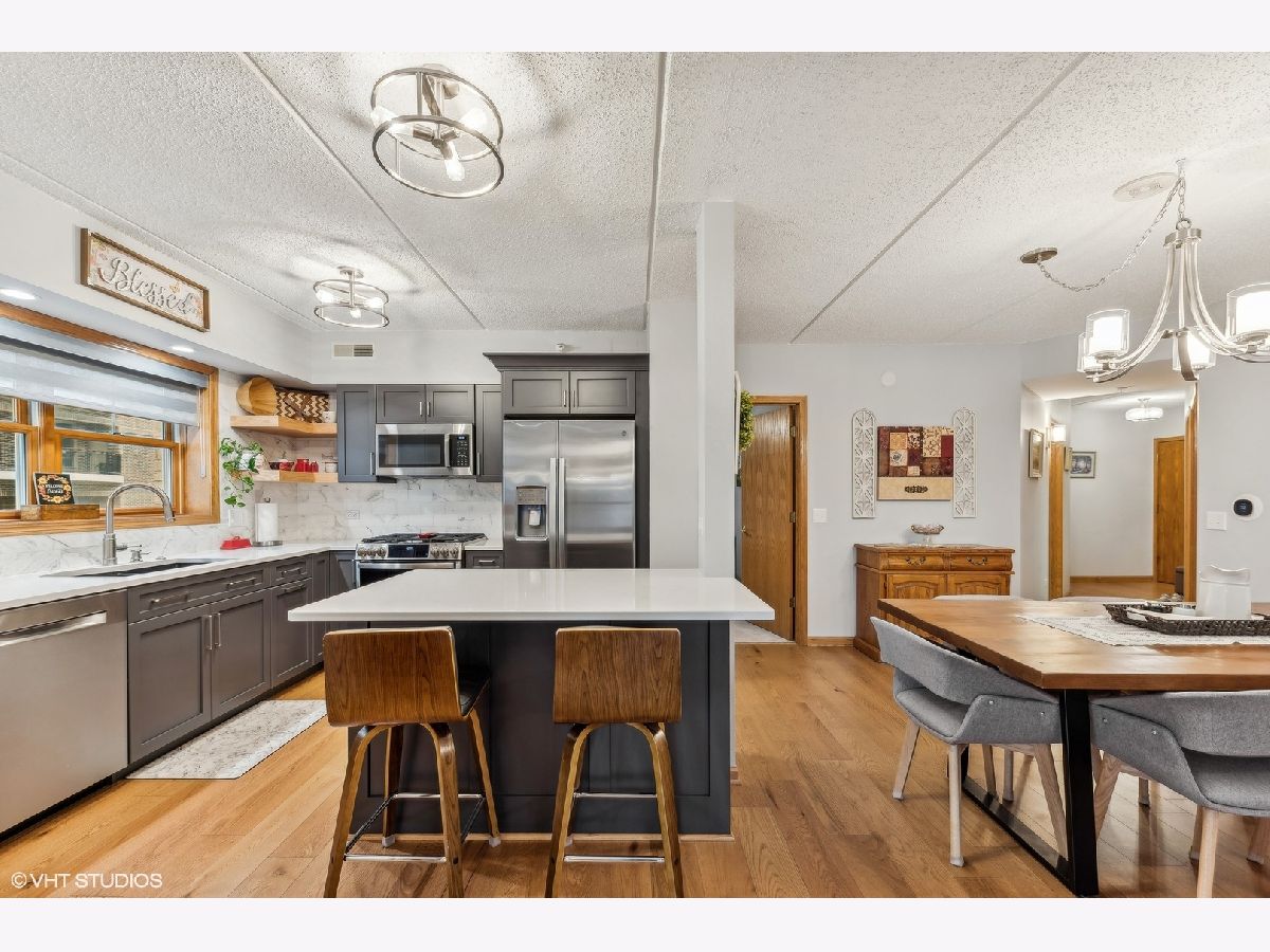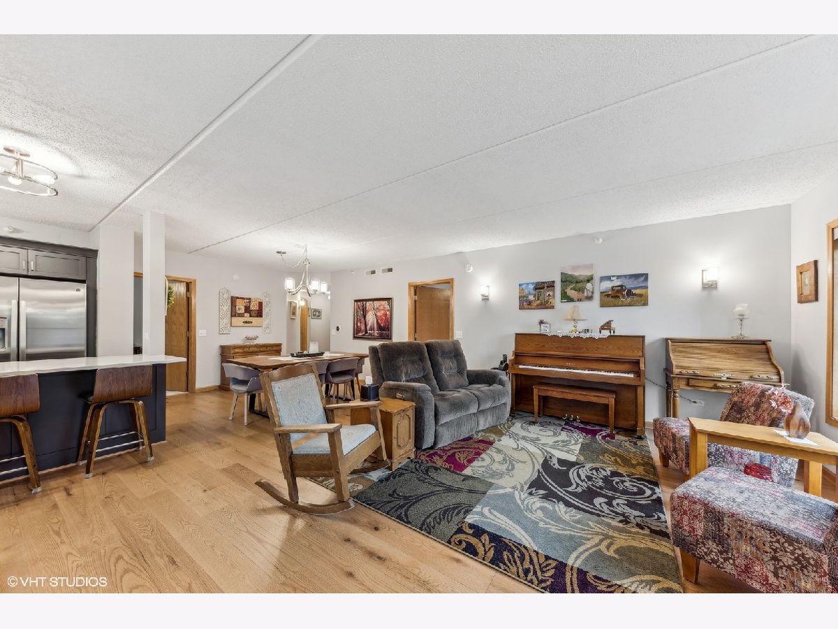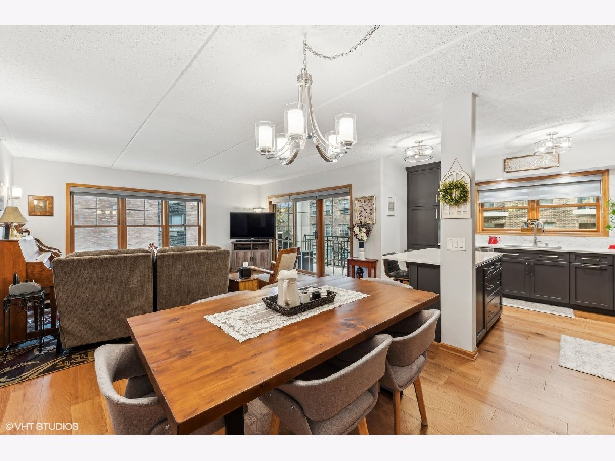 Welcome to highly desirable 200 West Campbell located in the heart of wonderful downtown Arlington Heights. Fabulous corner unit with open concept design. Special features include rich wide plank hardwood floors, custom window treatments throughout and remote controlled window treatments off the private balcony. This great floor plan allows you to prep in your stunning kitchen and converse with those in the living/dining room. The kitchen has been totally remodeled with walls removed to create a light and spacious open space. Highlights include custom high end cabinetry, quartz counter tops, eye catching backsplash and stainless steel appliances (2021). Two large bedrooms, the primary has a large walk-in closet with closet organizers and private bath. In-unit laundry room. Radiant heated floors. Heated garage and good sized storage unit. This corner unit is also located at one of the quietest spots of the building and overlooks the lovely courtyard. Great location, just steps from the Metra, shopping, restaurants, entertainment and all that wonderful downtown Arlington Hts has to offer.