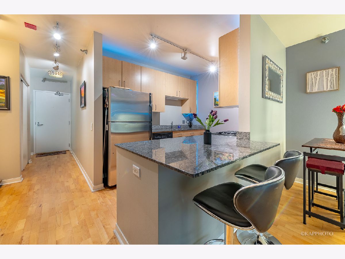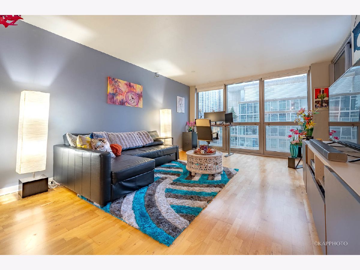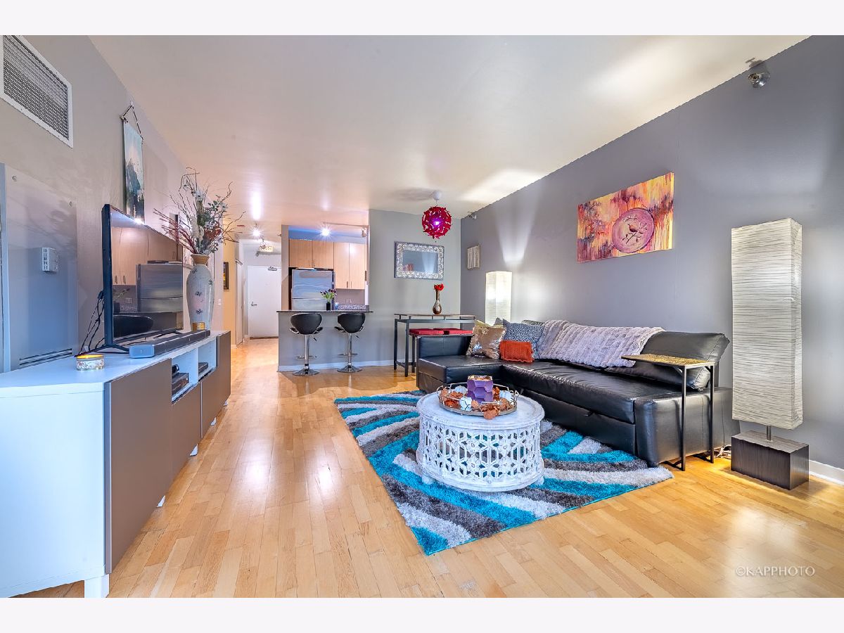 Welcome home to this spacious 1 bed/1 bath condo just on the border of Fulton River District, River West, & River North! This unit is the preferred tier in the building with a layout that maximizes space. The wide living room has floor-to-ceiling windows & access to the private balcony. South-facing exposure with breathtaking city views that span east & west, truly allows you to soak up the sun all day - even in the winter! Open concept with room for a full living area, work from home space, dining area, & an eat-in kitchen island. The kitchen is fully equipped with cabinetry, dishwasher, & stainless steel appliances. The in-unit laundry has been recently updated. There are updated fixtures throughout that really set this unit apart - bathroom vanity, cabinet storage, thoughtful light fixtures, & built-in organization systems in the walk-in closet. Featuring hardwood floors throughout the living area & a large entry foyer! The bedroom can comfortably host a king-size bed & more! The building features 24/7 doorstaff, elevators, bike storage, a fitness center, & a common patio deck with furniture & incredible views. The HOA fee covers gas, water, trash, DirectTV, internet, security, building maintenance, fitness center, & outdoor patio. You are steps away from multiple trains & bus stops, as well as local shops, restaurants, groceries, the river, & a dog park! There is also assigned garage parking sold separately for $35,000. Easy access to schedule a showing - hope to see you soon!