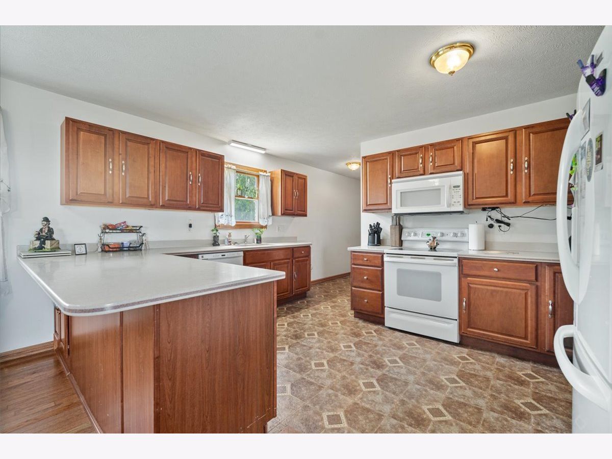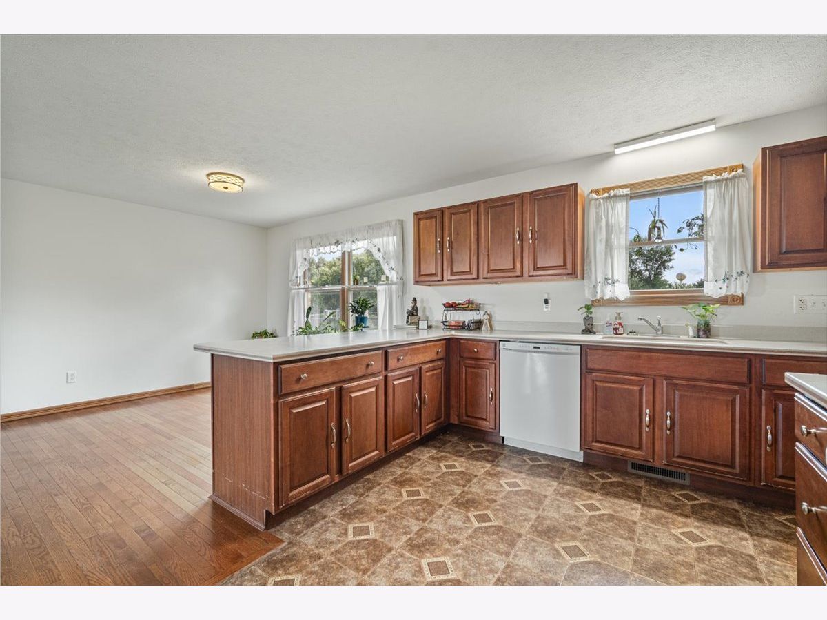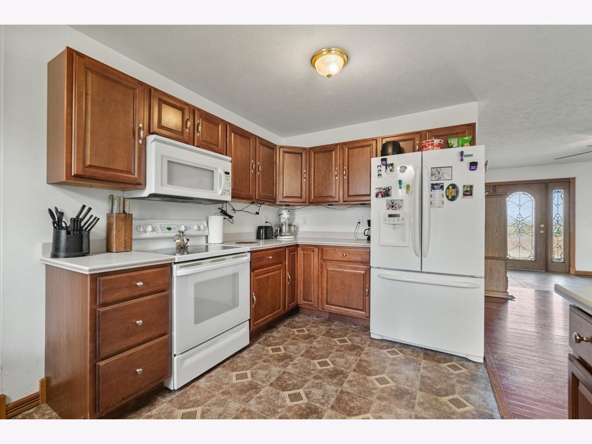 All-Brick Ranch on a Private Lot with Open-Concept Living! Welcome home to this beautifully maintained all-brick ranch, set on a peaceful and private lot. A full-length 8x60 covered front porch with stamped concrete welcomes you inside, where the spacious open living room greets you with gleaming hardwood floors and abundant natural light. The dining area flows seamlessly into a classic kitchen featuring oak cabinetry, Corian countertops, a convenient peninsula, and a complete appliance package-perfect for both everyday living and entertaining. The primary suite offers a comfortable retreat with a walk-in closet and a private bath, recently updated with a new walk-in shower, soaking tub, and ceramic tile floors. Two additional bedrooms, each with lighted ceiling fans, share a full hall bath. Original woodwork and Anderson windows add timeless quality throughout the home. Main floor conveniences include a laundry room and access to the expansive full basement with soaring 9' ceilings-ready for your finishing touch. Enjoy outdoor living with a concrete patio and the efficiency of geothermal heating, a dewatering system, and solar panels. All electric household with the monthly bill less than $20. The oversized 2-car garage (24x30) includes double doors in front and a handy single door at the back for easy access. 3 addtl lots to the East of the home (to the brush line) are included. This home combines comfort, quality, and energy efficiency in a serene setting-don't miss the chance to make it yours!