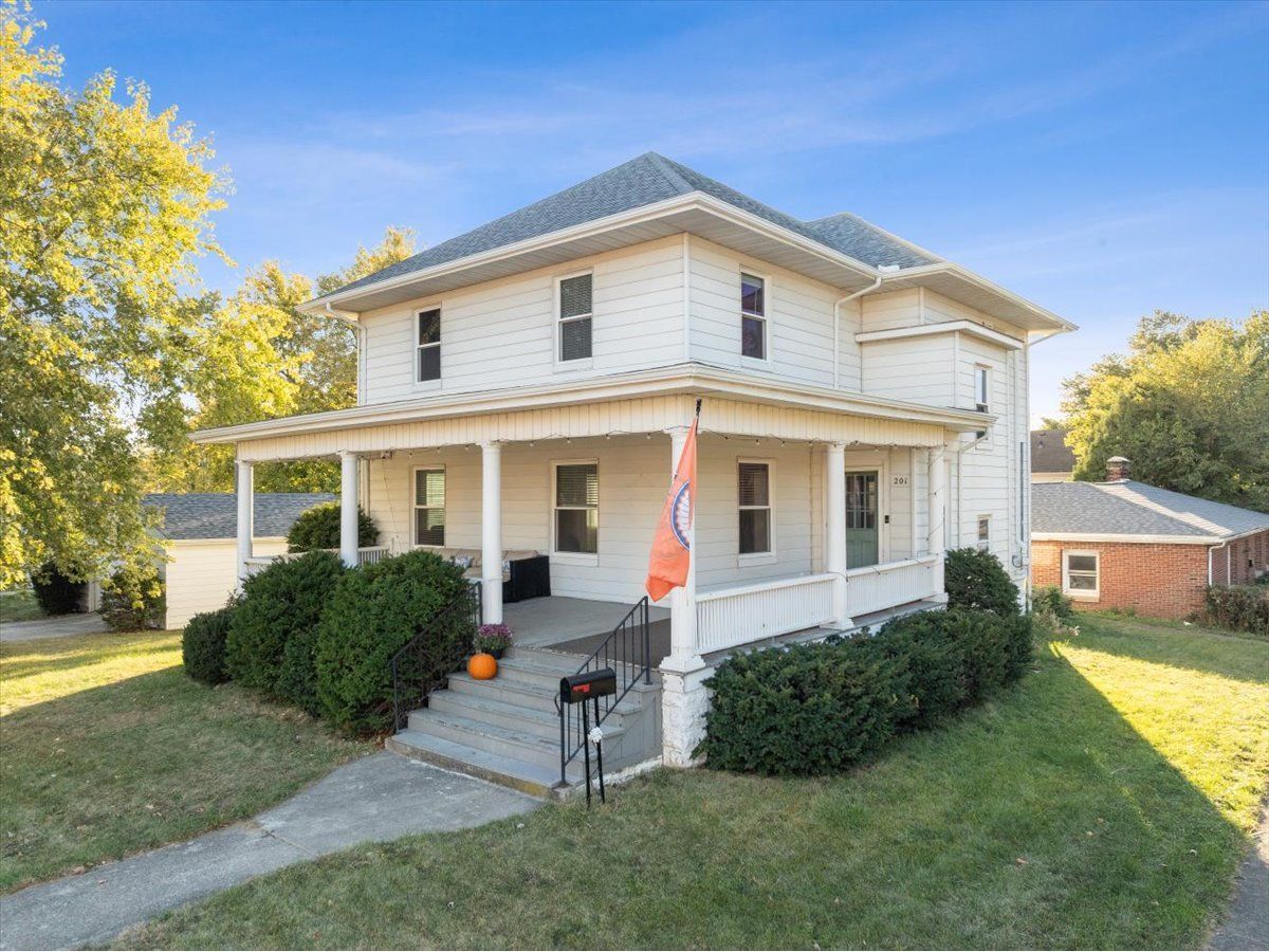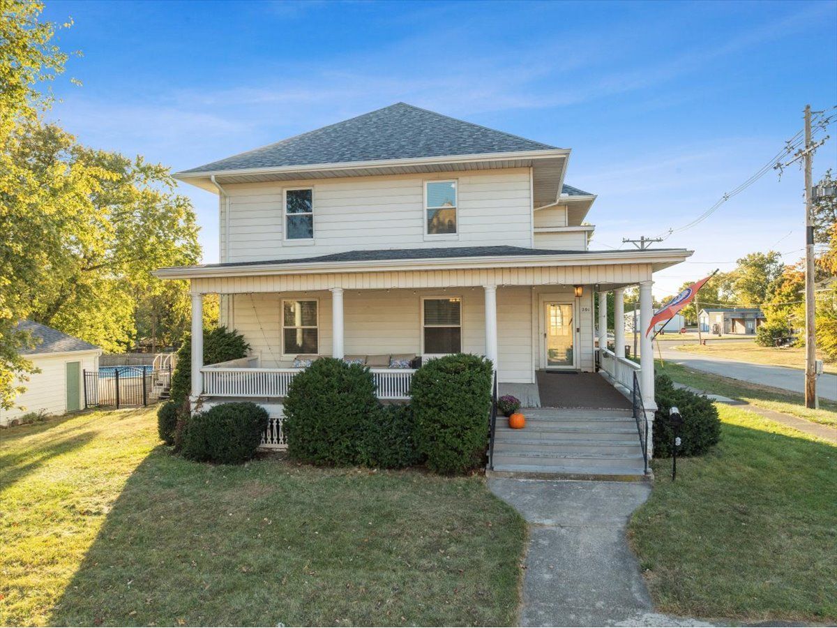 Start building your porch swing to fully enjoy the charm of this 1904 front porch. Step through the front door to a large living room, big enough to split into 2 rooms. The formal dining leads to the kitchen featuring a breakfast bar. From the kitchen window, you can look out to the backyard and 24' above ground pool, perfect for those summer days! The pool is conveniently located behind the 2 car garage with plenty of room to store your pool accessories. There is also a main floor office that could be used as a bedroom. Up the wide staircase, are 4 generously sized bedrooms, each boasting 2 windows for natural light and the original hardwood floors. Laundry hookups are located on the second floor or in the basement. Ascend up the stairs to the walk-up attic and imagine how cool this attic space can be finished off! No old dungeon basement here, the finished basement offers a full bath, large living room and a rec room that could also be another bedroom. The windows were replaced in 2022 along with the back porch. HVAC 2017 and a radon mitigation system has been installed. Summer of 2023, new roof, downspouts and gutters.