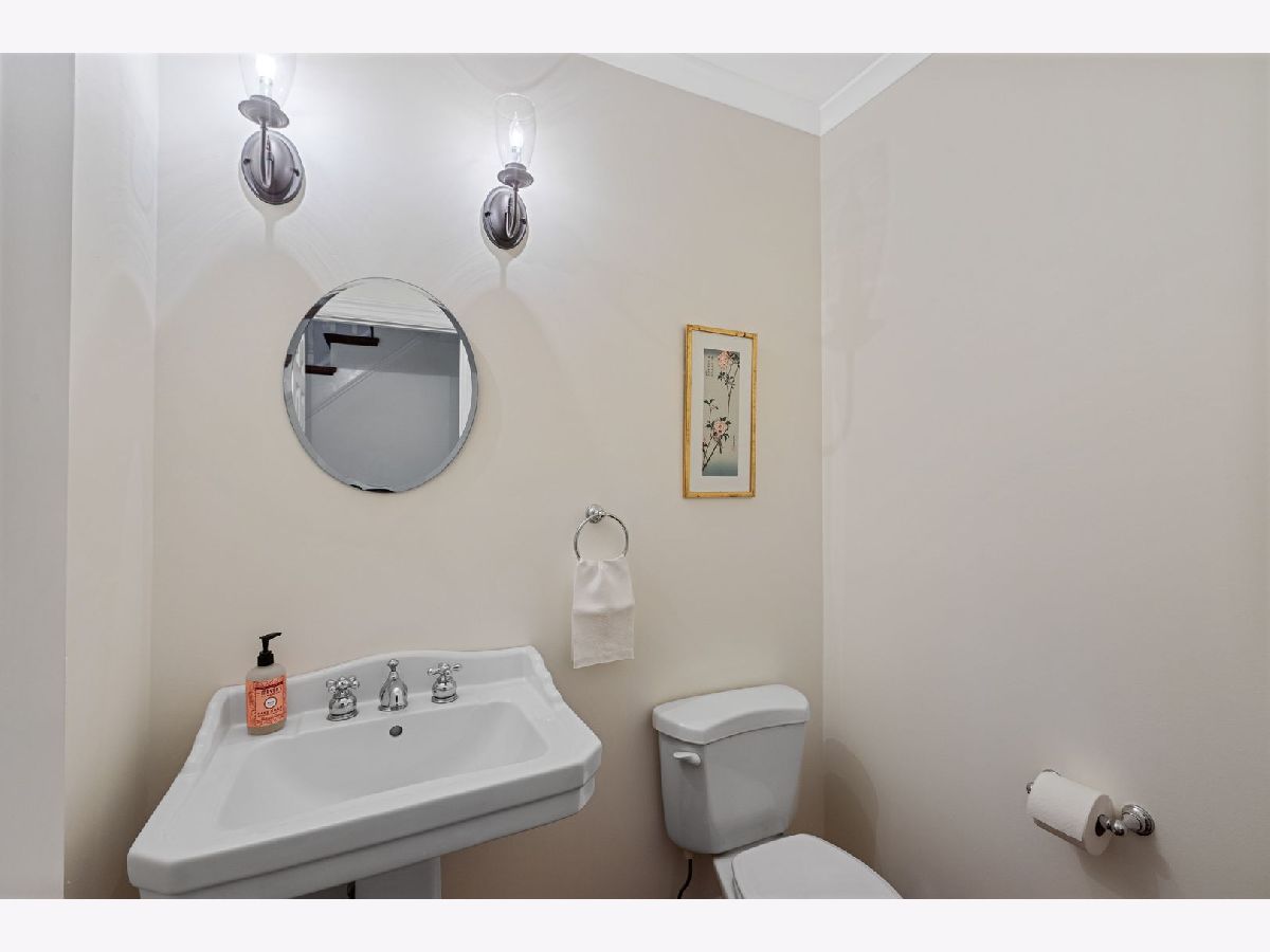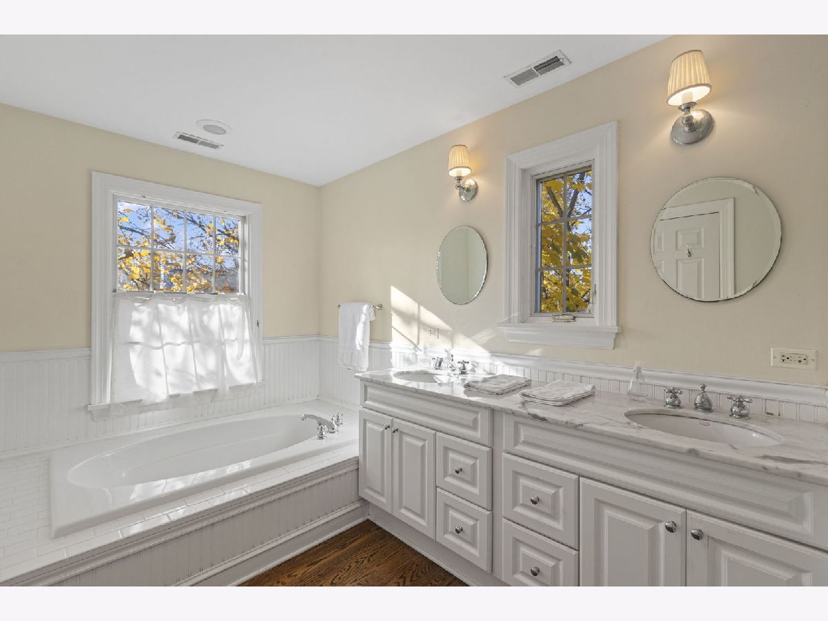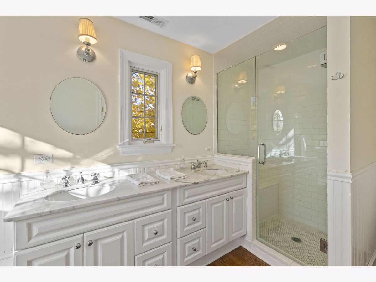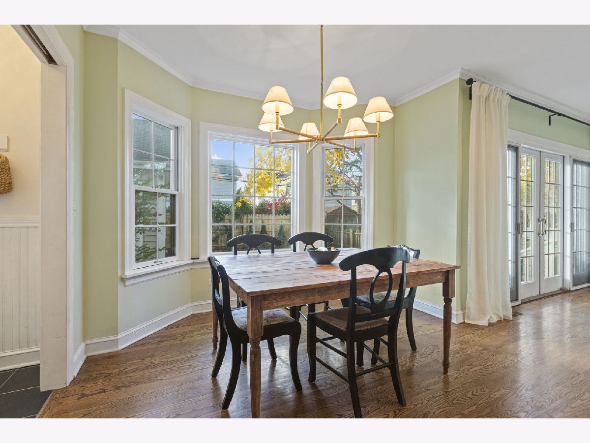 Expanded center entry colonial located in the extremely desirable Swainwood area, centrally located between downtown Glenview/Metra train station and Roosevelt Park, pool, tennis courts, and ballfield. To the right is a spacious living room with hardwood floors, center wood-burning fireplace, bay window, crown molding, and a set of French doors flanked by bookshelves leading into the addition. To the left of the foyer is the formal dining room with hardwood floors, chair rail, Serena and Lily light fixtures, pretty bay window, crown molding, and built-in corner buffet cabinets. A butler pantry with white cabinetry with glass fronts and granite countertops leads into the main hub of the home consisting of the kitchen, breakfast room, and family room. The white kitchen includes granite countertops, a center island, and stainless-steel appliances including two ovens. The breakfast room area is surrounded by windows for natural light with a pretty Serena and Lily chandelier. The hardwood floors flow into a spacious family room with lots of natural light, overhead lighting, ceiling fan, and sliding doors out to the deck. Completing this area is a mudroom space with beadboard walls, large closet, and a side door entrance to the driveway/garage. Conveniently located powder room with a Kohler pedestal sink and pretty wall sconces. The second level of the home has four bedrooms and two full bathrooms beginning with a large primary bedroom with hardwood floors, vaulted ceiling, and his and hers walk-in closets. The stunning en-suite bathroom includes a shower with a bench, separate soaking tub, and a double sink vanity with marble countertop. Three additional bedrooms all have hardwood floors and ample amounts of closet space. These bedrooms share a full hall bathroom with a tub/shower, beadboard walls, and a pedestal sink. Further expanding the living space is the lower level which includes a second family room with wood laminate floors, a powder room, laundry/storage room, and tons of additional storage in the cement crawl space. Over-sized custom detached two car garage with additional floored storage above.