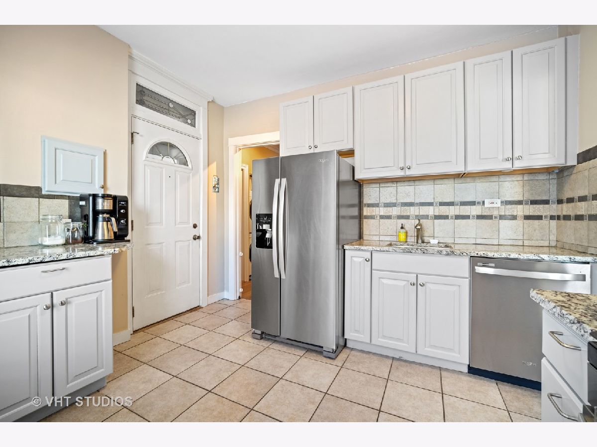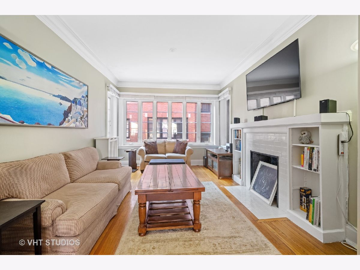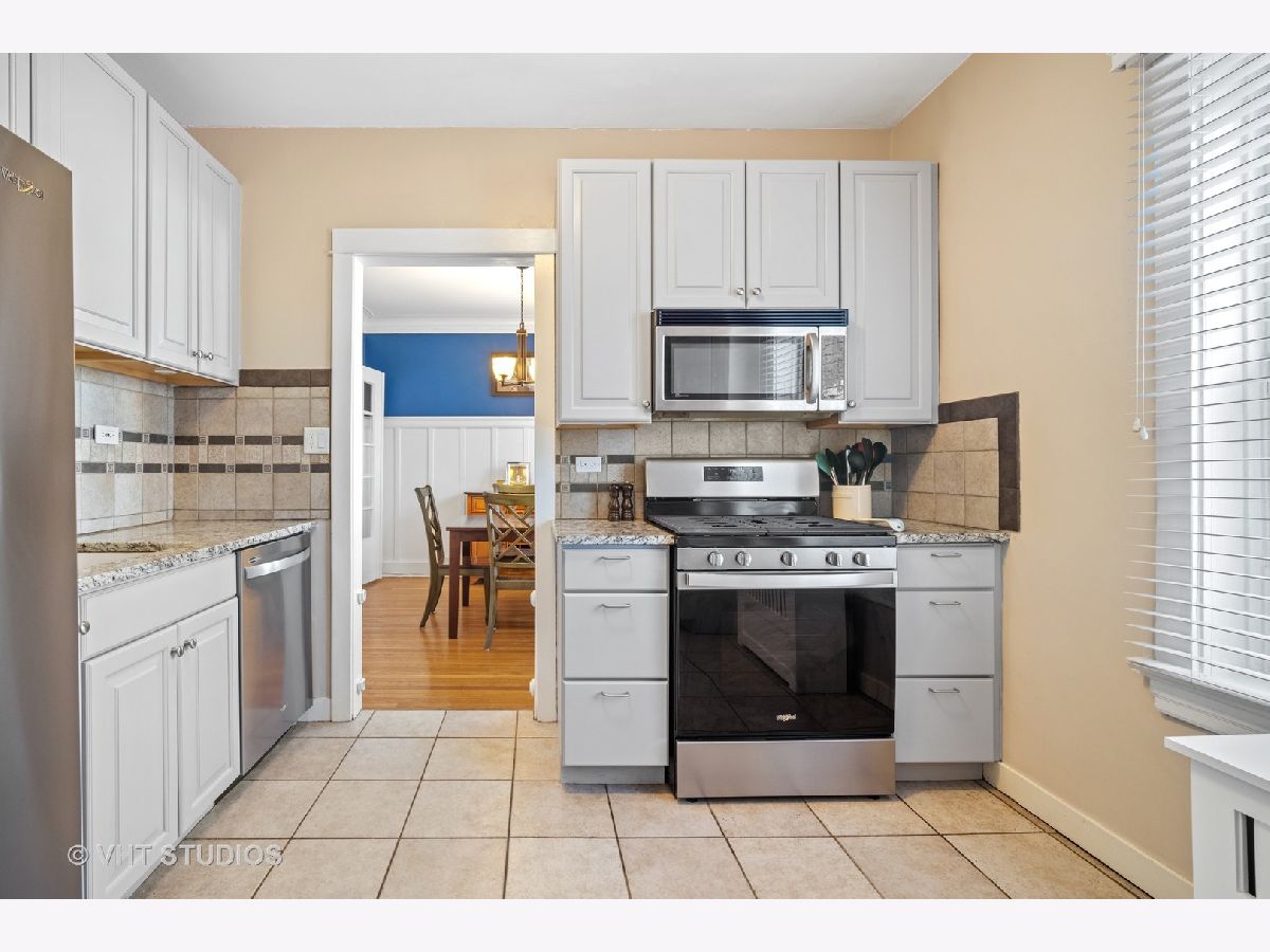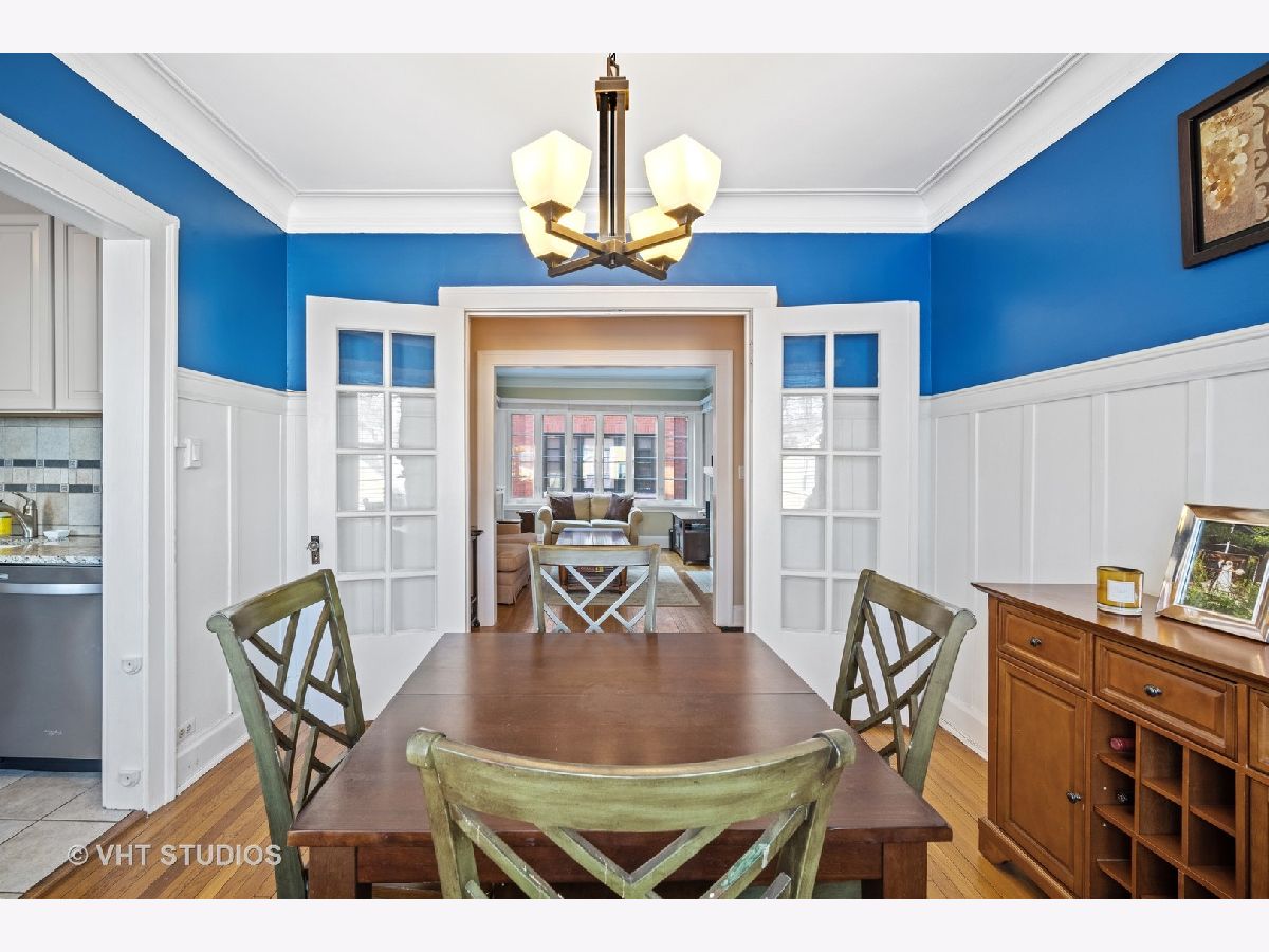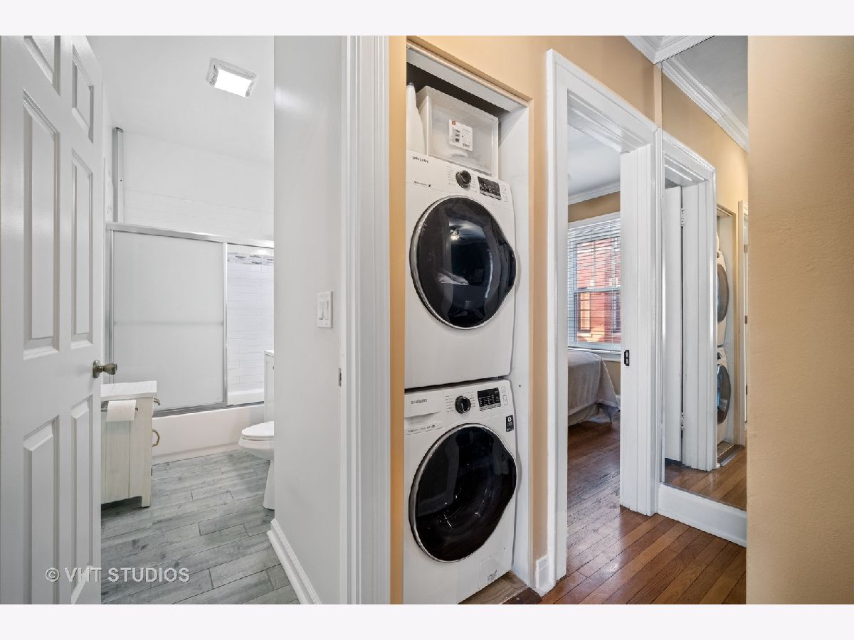 Vintage second floor 2 bedroom, 1 bath condo with beautiful hard wood floors. Charming living room with decorative fireplace surrounded by built in book cases. Dining room with wainscoting, french doors and vintage hardware. Kitchen featuring freshly painted wood cabinets, brand new stainless steel appliances and granite counter tops. Renovated bath including bathtub/shower with beautiful tile surround. Owners have added convenient in unit laundry. Largest of the two bedrooms is currently being used as a den. New windows throughout installed 2017. Terrific location with close proximity to the EL, Metra and downtown Evanston. Northwestern campus is just 2 blocks East.