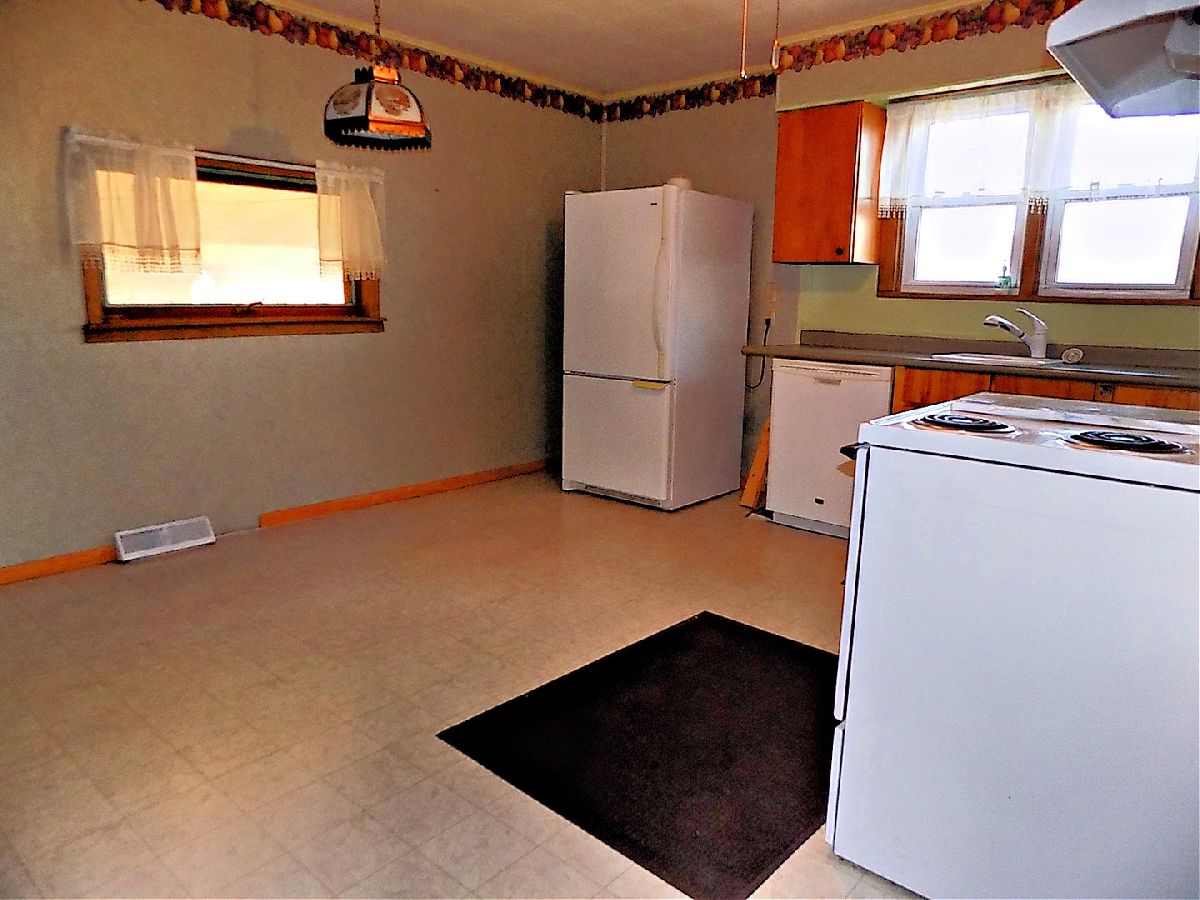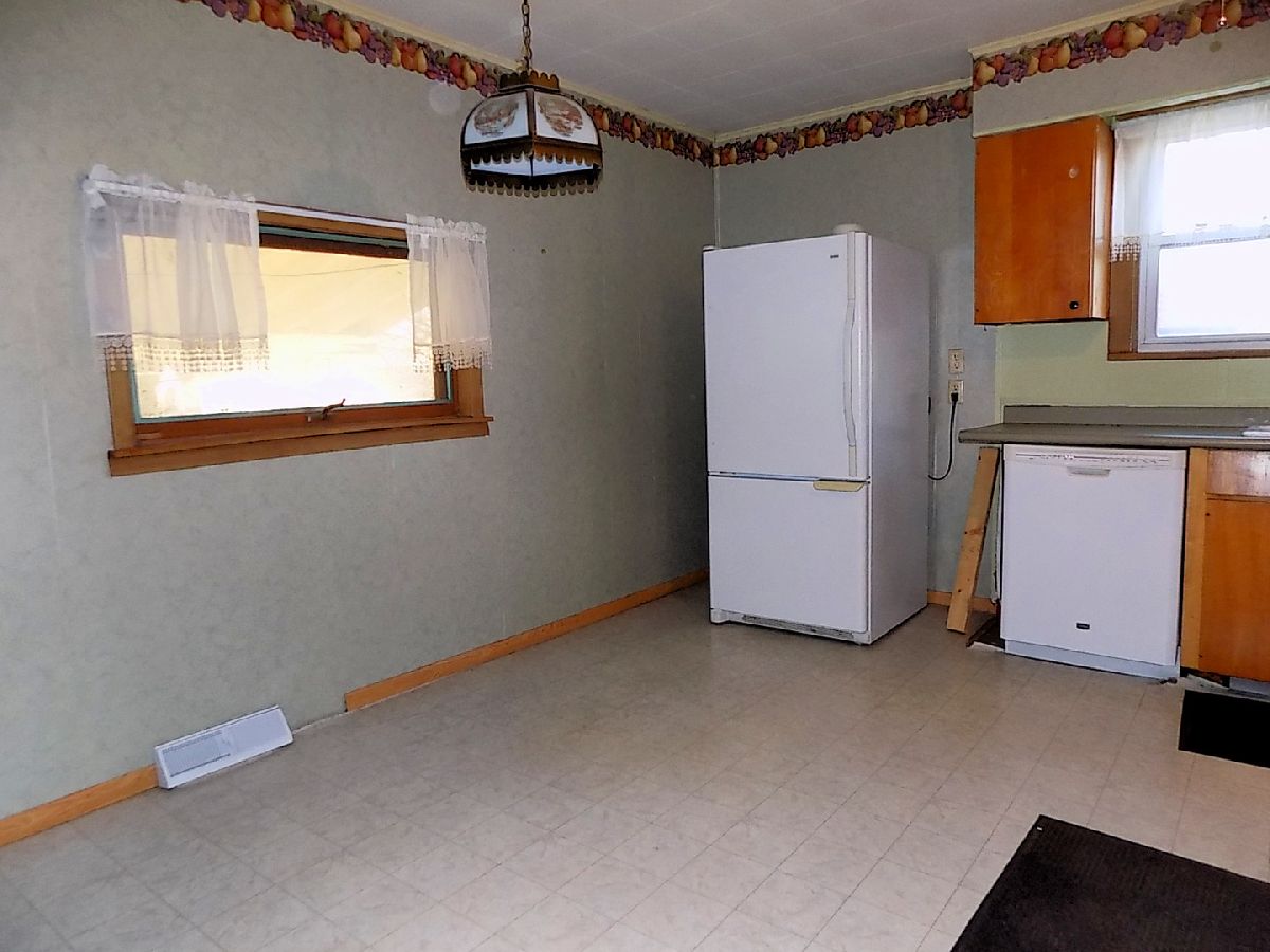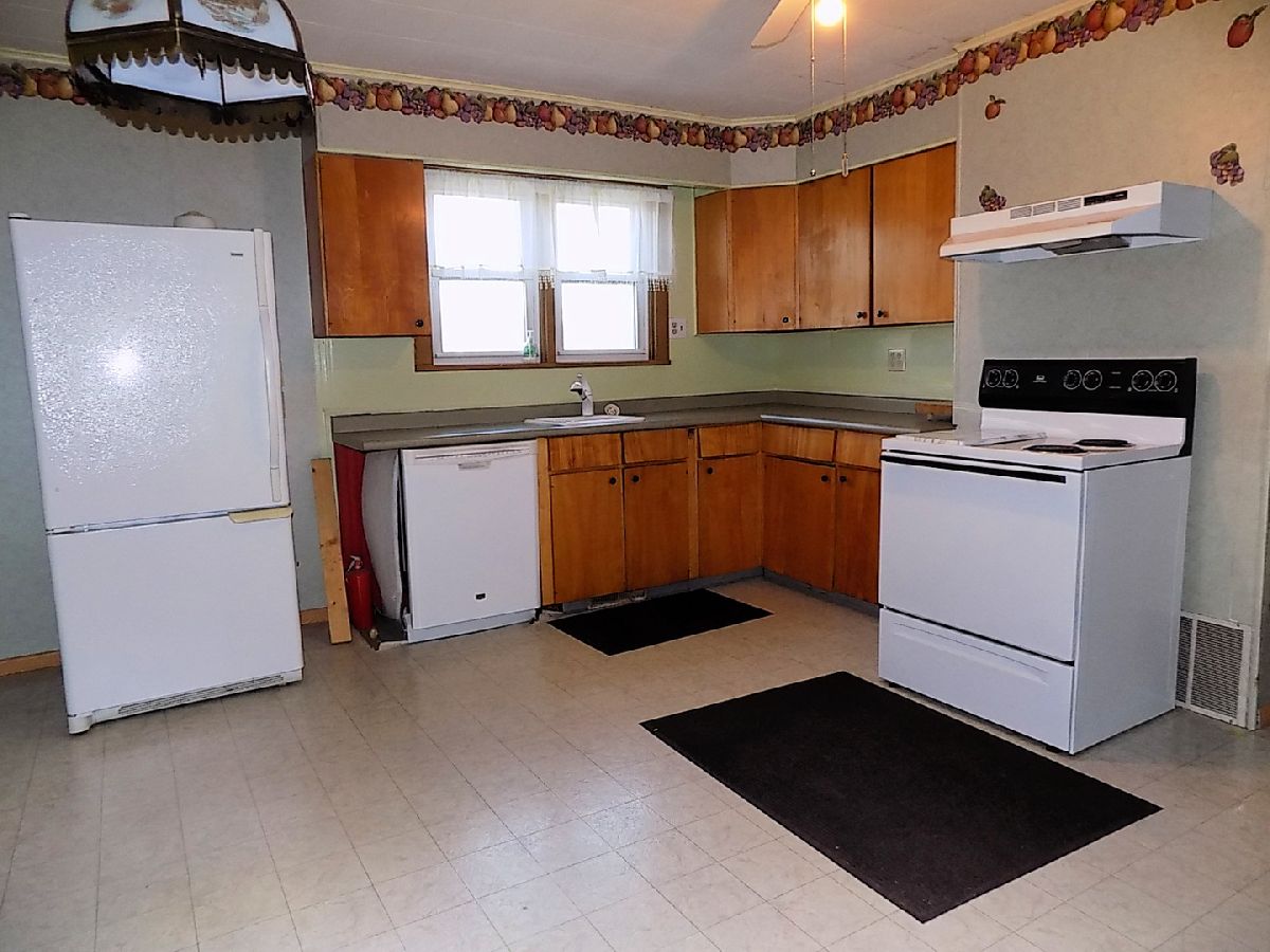 A move in ready, possibly 2 bedroom home with lots of square footage (1230 square feet). The living room is L-shaped so a portion of it (11X9) could be walled off for the 2nd bedroom. Eat in kitchen with dishwasher, refrigerator and stove. Main bathroom has a jetted tub and stackable washer and dryer. A second bathroom is in the full basement with a shower. Newer central a/c and gas forced air furnace. Carport at the back of the house plus a wide concrete driveway that is oversized for plenty of parking. Sits on a corner lot. Sold as is.