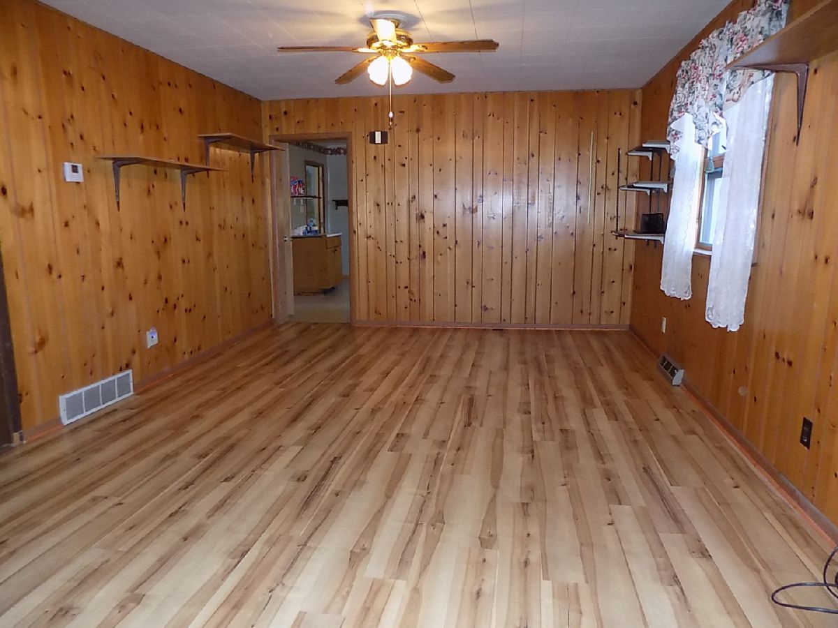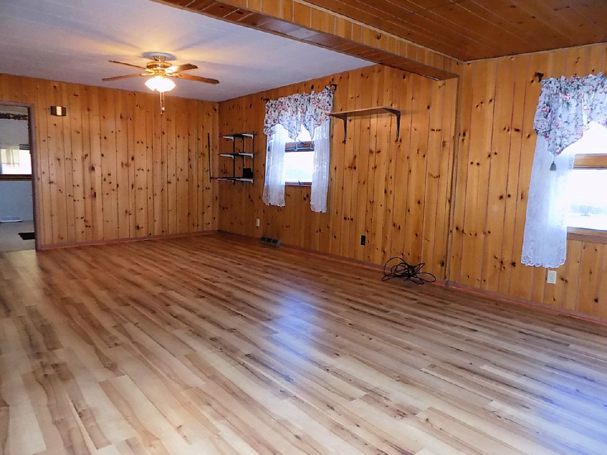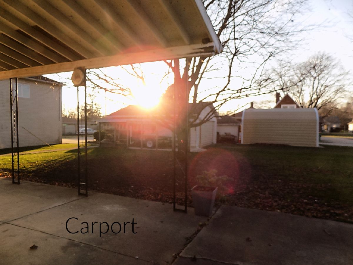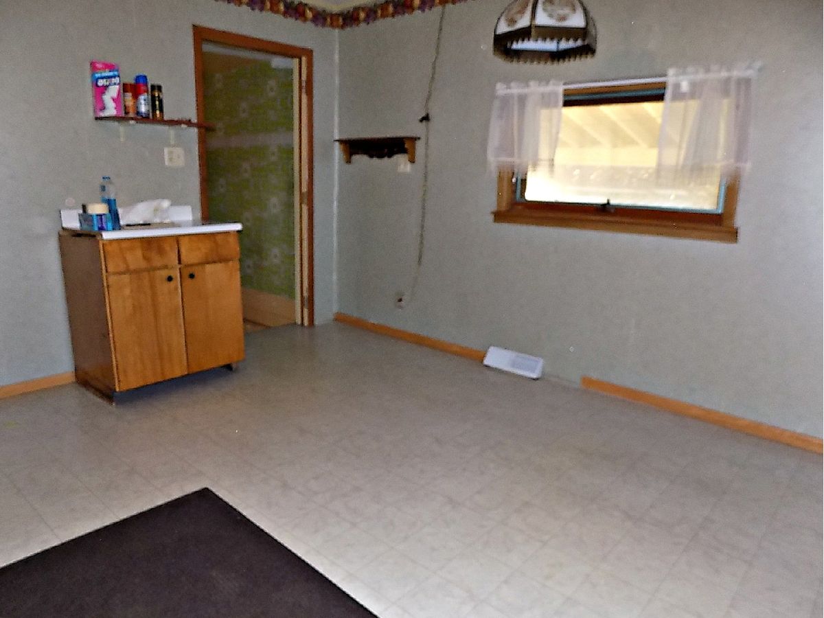 A move in ready, possibly 2 bedroom home with lots of square footage (1230 square feet). The living room is L-shaped so a portion of it (11X9) could be walled off for the 2nd bedroom. Eat in kitchen with dishwasher, refrigerator and stove. Main bathroom has a jetted tub and stackable washer and dryer. A second bathroom is in the full basement with a shower. Newer central a/c and gas forced air furnace. Carport at the back of the house plus a wide concrete driveway that is oversized for plenty of parking. Sits on a corner lot. Sold as is.