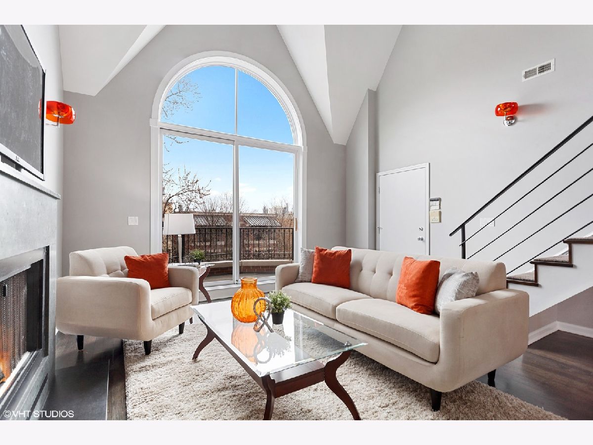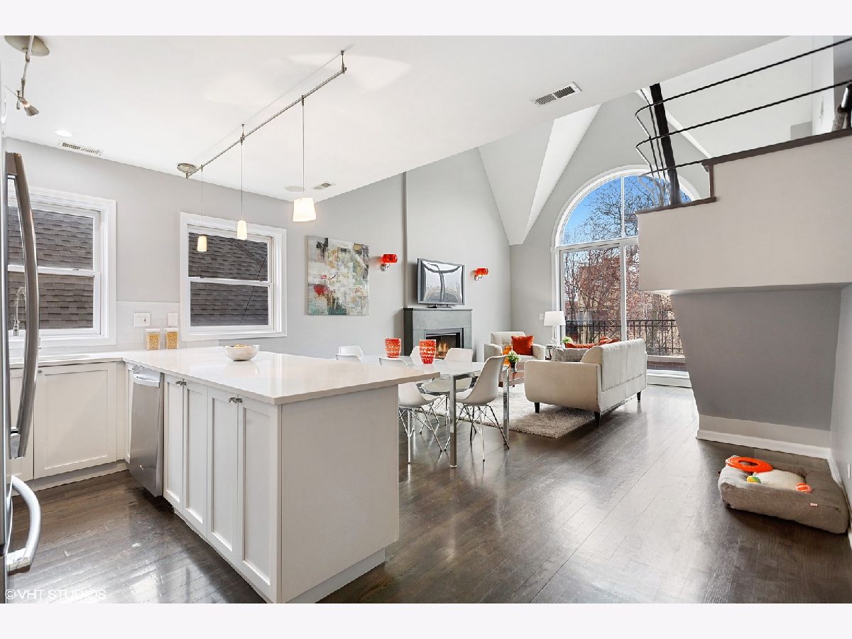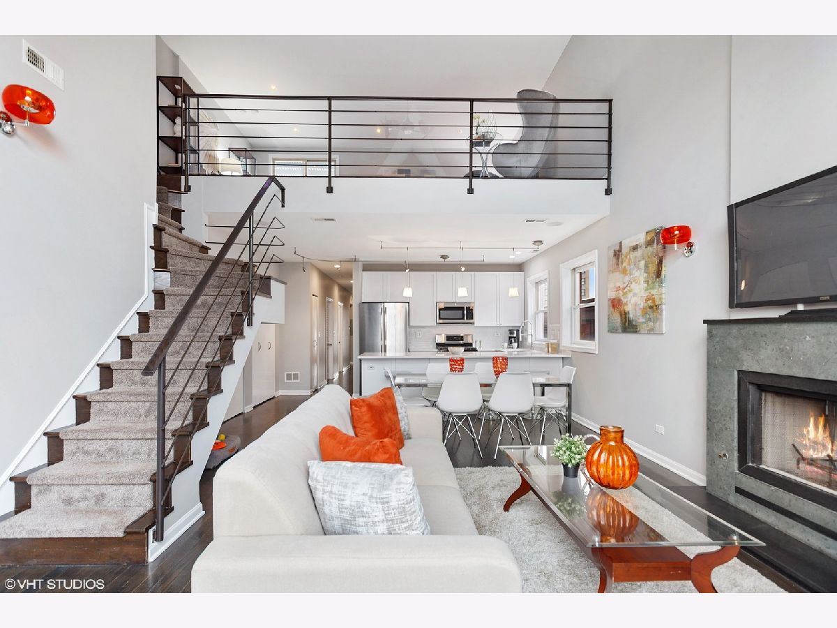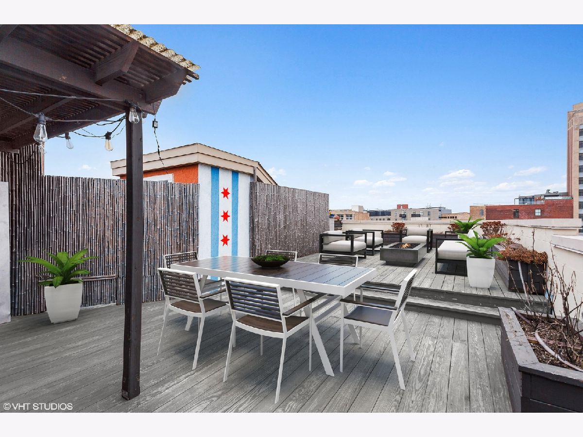 NOT YOUR COOKIE CUTTER PENTHOUSE! RARELY AVAILABLE MODERN DUPLEX-UP w/ 3 OUTDOOR SPACES & MASSIVE PRIVATE ROOF-TOP DECK IN HOT WICKER PARK IS AN ENTERTAINER'S DREAM HOME! ***Unit is Vacant & cleaned & can be shown now! Spacious renovated 3 bed, 2 bath + lofted family room penthouse in extra-wide building is move-in ready. Unique duplex-up with open floor plan features 18 ft. cathedral ceilings and south facing floor-to-ceiling windows provide an abundance of natural light all day long! Outdoor oasis with 3 private outdoor spaces including terrace off main living area, balcony of master suite & huge walk-out roof-top deck with pergola located right off 2nd level family room. Main level features all 3 bedrooms, white chef's kitchen, separate living room & dining room spaces, dark stained solid hardwood flooring and wood burning gas fireplace with marble surround. Front terrace off living room overlooks quiet one-way tree lined street and is perfect for grilling. Remodeled white kitchen (in March 2020) with quartz countertops, glass tile backsplash, stainless steel appliances and huge breakfast-bar overhang for up to 5 bar stools. Large Master suite has high ceilings, can easily fit a king-size bed, 2 large dressers, has double closets and a private balcony. Master bathroom features white double vanity with granite counters and "European" frameless glass shower and whirlpool tub. 2nd and 3rd bedrooms are spacious and have ample closet space. Second level offers a large lofted second living space overlooking main level....great for a family room plus office or play area and walk right out to the expansive 20' x 34' built-out roof top deck with pergola, planters and lighting for night-time entertainment. Tons of storage throughout, side by side washer/dryer in laundry room, and 1 gated and secure parking space included. Prime Wicker Park location, just minutes to the North/Damen Blue Line EL, Big Star, six-corners, retail dining, shopping and nightlife! MUST SEE ALL PICS!