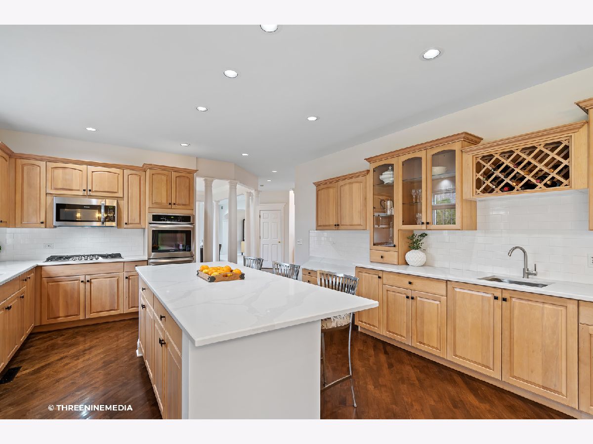 Welcome to this beautifully updated 4 bedroom / 5 bathroom home on a corner lot in the Golf Course community of White Eagle! This custom home offers a grand 2-story foyer with a gold plated 60 bulb Wilshire chandelier, a 2-story family room with a fireplace and large windows, 70 Marvin Windows, and fresh paint on the interior and exterior! The gourmet kitchen was just completed with quartz countertops, a new white subway backsplash, 2 stainless steel sinks, wine rack, and brand new stainless steel appliances including a 27" double oven and gas stove top, with glass doors leading onto the FIRST back patio. The separate dining room, perfect for entertaining, provides an open concept into the two-story family room, with sliding doors onto the SECOND patio. There is also a large blue stone patio between the two concrete patios. The first floor den with double French doors is the perfect size for your work from home space, and next to the office is a full bathroom with a standing shower. Head upstairs, where the second floor features four large bedrooms with vaulted and cathedral ceilings, connected by a sprawling hallway overlooking the two-story family room and foyer. Take the double doors into the master bedroom, which includes your extra large walk in closet, and an en suite bathroom, featuring a corner Kohler Tub and double vanity, feeling like a true spa. The second bedroom also includes an en suite bathroom. All bathrooms feature porcelain tile imported from Spain. The fully finished basement offers a full kitchen with a fridge, full size electric stove, and microwave, as well as a full bathroom for TOTAL live-in privacy. Set up a home theater, a gym, and a game room space all in one! This is an environmentally efficient, green EIFS home, which will lower your heat and A/C bills each month! This 100% custom built home with a new (2019) DaVinci Bellaforte European SLATE roof (hail, wind, and fireproof with lifetime limited ownership transferrable to new owner) and attached side-load 3 car garage is being sold by the ORIGINAL owner, and has been meticulously maintained. Play in the backyard with a private berm on side and rear, providing total privacy, or shoot some hoops on the Goalrilla 72" clear in-ground basketball hoop. 15 zone in-ground sprinkler system. 2 brand new HVACs and a new sump pump! Extra dry storage also available in the basement. Walk to the golf club, school, shopping, and parks. White Eagle is a 24/7 monitored and patrolled community with a pool and tennis courts!