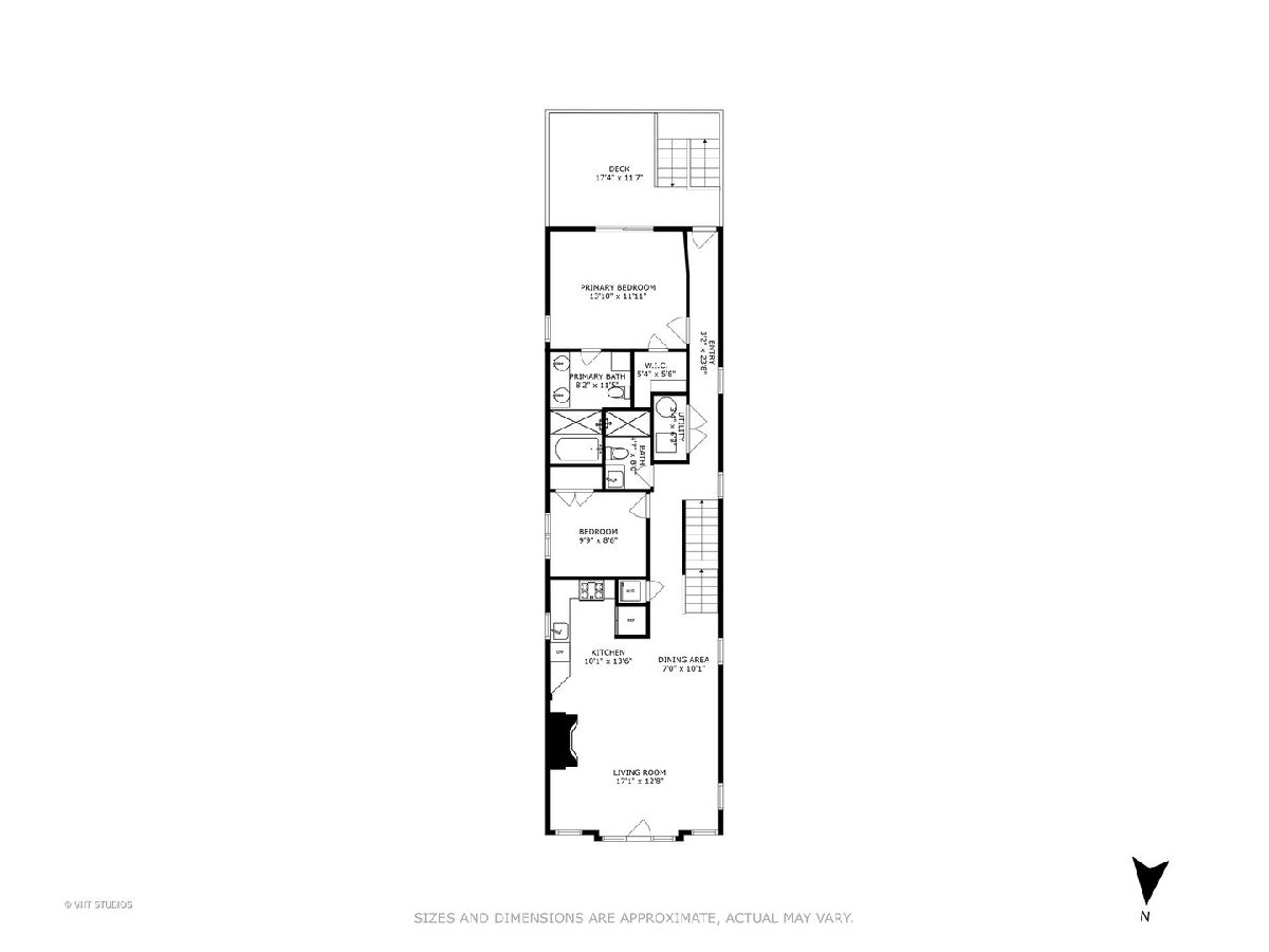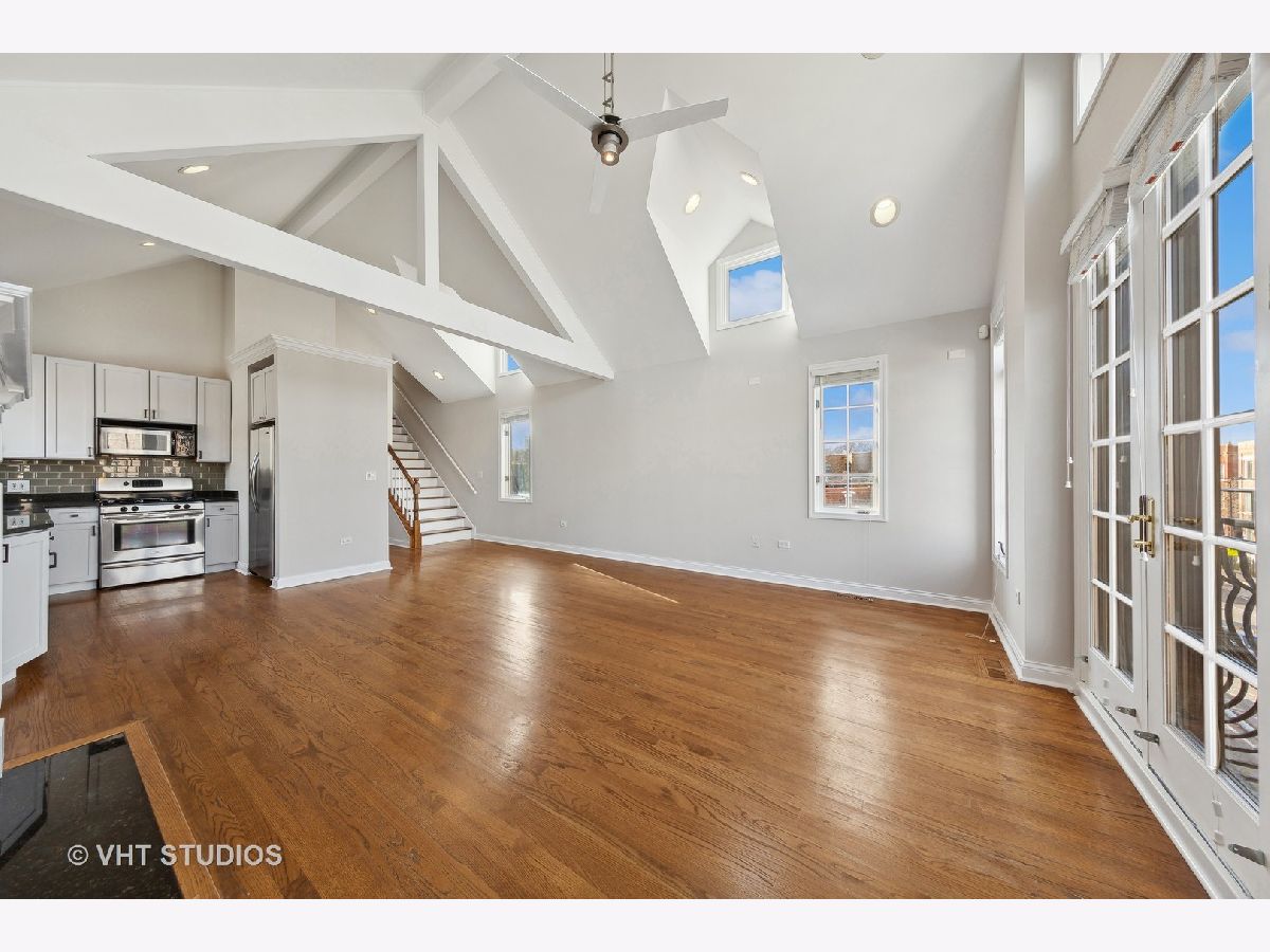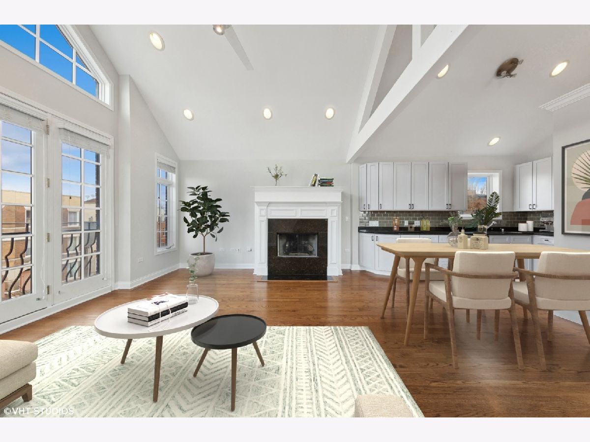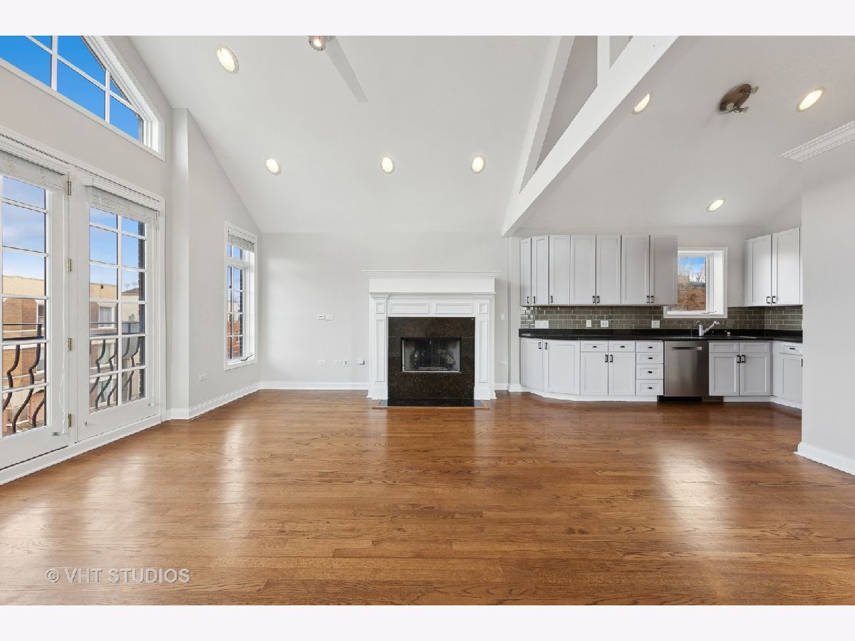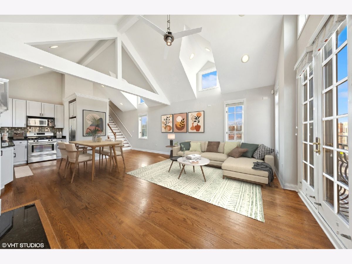 Freshly updated and READY TO GO! Spacious Top-Floor Duplex with Abundant Natural Light, Cathedral Ceilings, Skylights, and Two Private Outdoor Spaces, including a Spectacular Roof-Deck with Skyline Views. This unit features a generously sized kitchen including granite counters, stainless steel appliances, modern shaker cabinetry and a stylish glass-tile backsplash. Enjoy the warmth of a wood-burning fireplace (WBFP) in the extra large living/dining space. The large master suite includes a spa-like bath and ample storage, walk in closets and vaulted ceilings. Newly updated second bathroom has the look and feel you and your guests will enjoy. Bonus second floor vaulted loft works perfectly as a third bedroom, secluded office, additional family room or entertainment space and has it's own dedicated outdoor patio. This home is conveniently located between Division and Chicago Avenue, in the vibrant East Village; you can easily walk to diverse dining, shopping, nightlife and more. Garage parking is included for added convenience. Don't miss your opportunity to live in this fantastic unit in a burgeoning community.
