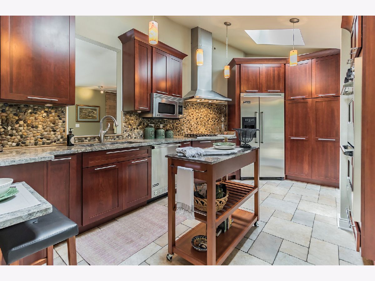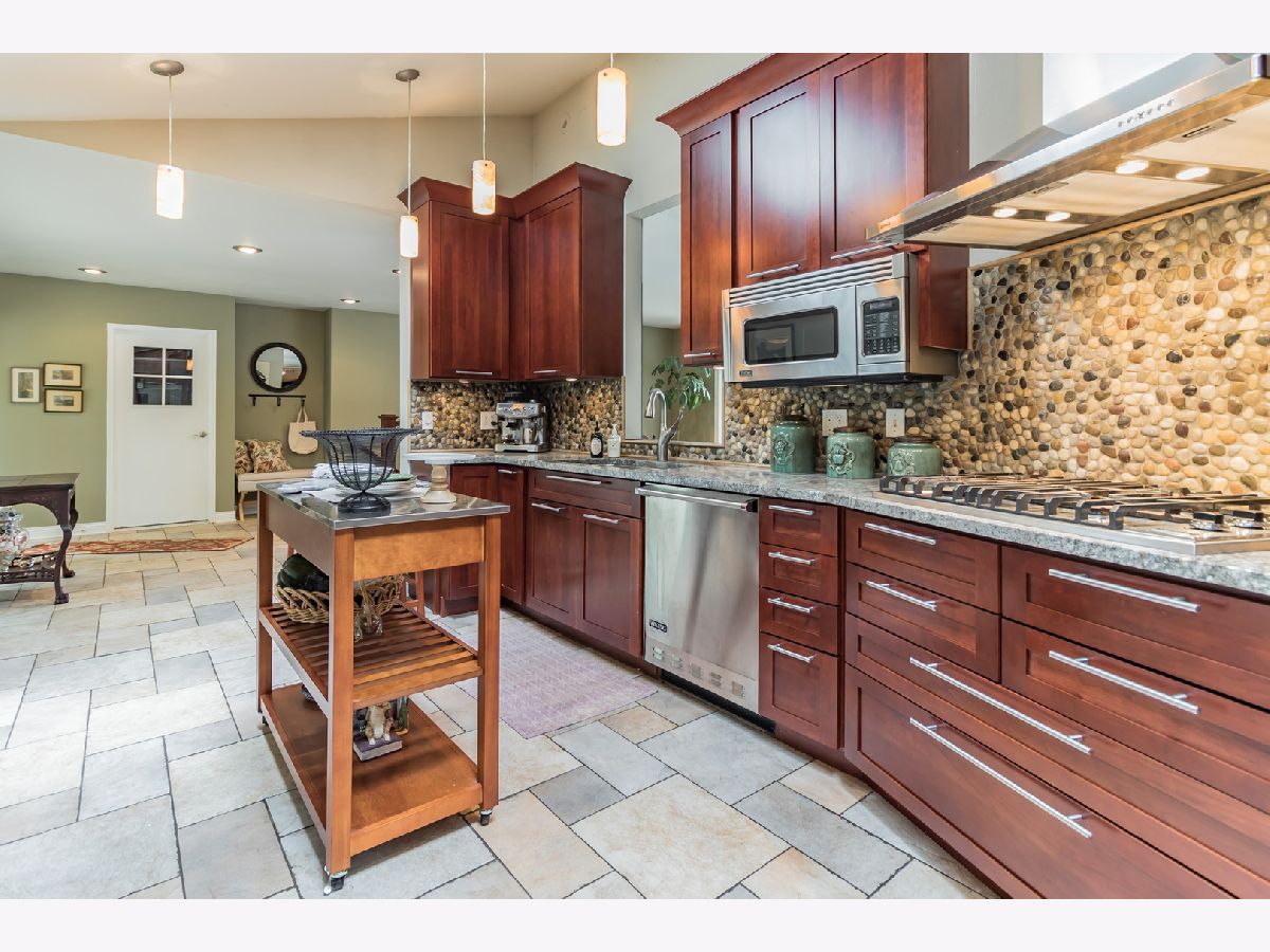 Beautifully maintained mid-century modern walk-out ranch situated on a high lot right on the Fox River. Spectacular views of the river from every room! Terrific curb appeal. All brick & masonry construction surrounded by mature trees. Entry way w/ a flag stone patio. Open floor plan. Hardwood floors & decorative ceramic tile throughout. Two stone fireplaces. Recessed lighting. Updated kitchen w/ vaulted ceilings, skylights, garden window, granite counter tops, stone backsplash, & Viking SS appliances. Living room leads you out to a beautiful balcony overlooking the river. Updated bathrooms w/ Kohler fixtures, double bowl sinks, & jetted soaking tub. Walk-out lower level features a large family room w/ wet bar, French doors out to a screened in porch, third bedroom, game room, full bathroom, & a cedar walk-in closet. Newer Anderson doors & windows throughout. Recently replaced roof & AC. 125 foot of river front w/ pier & boat lift. Deck & fire pit near the pier. Truly a must see!