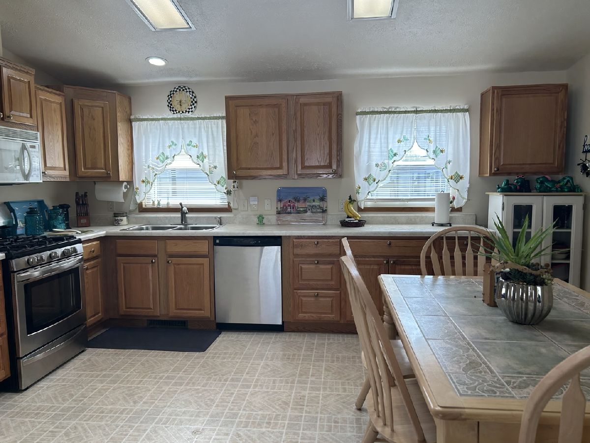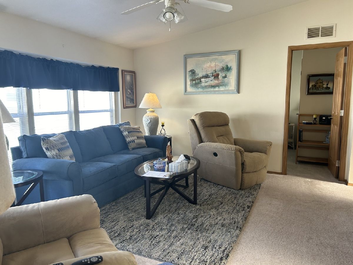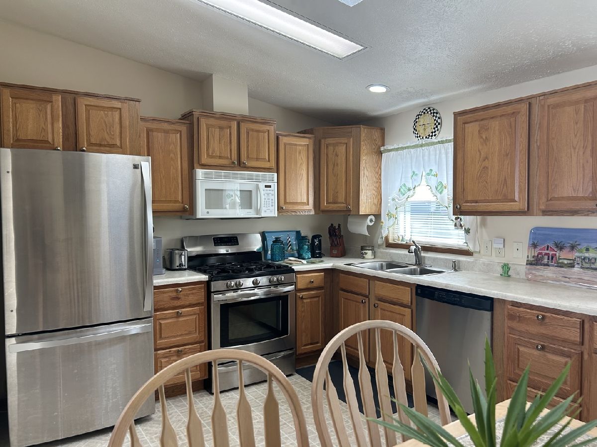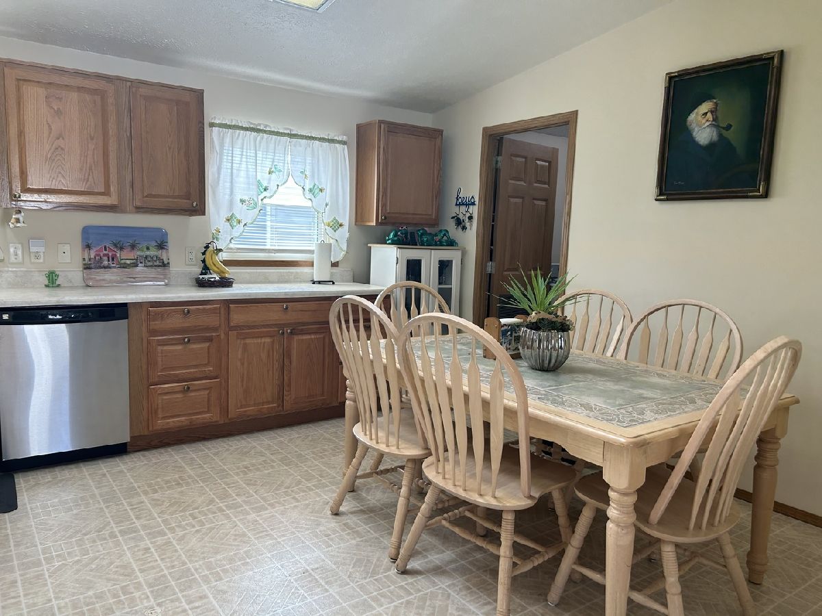 Experience the comfort of home in this move-in ready mobile home. The spacious great room seamlessly opens to a large, eat-in kitchen featuring abundant countertop space-perfect for all your culinary needs. Two bedrooms and a full bath are located on one side, while the primary suite includes a full bath with a step-in shower on the other side. The laundry room comes equipped with a washer, dryer, and water softener. Outside, you'll find a large attached garage complete with a workbench and toolbox,plus a cozy patio for outdoor relaxation. Enjoy the peace of mind of a new roof installed in 2022. Located in Four Seasons Mobile Home Park, where amenities include a pool,playground, and easy access to main roads for your convenience