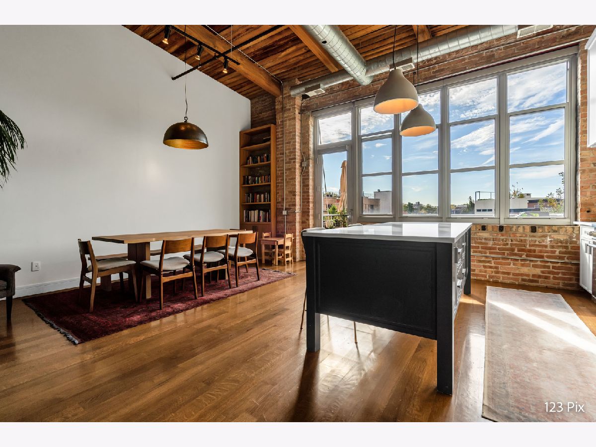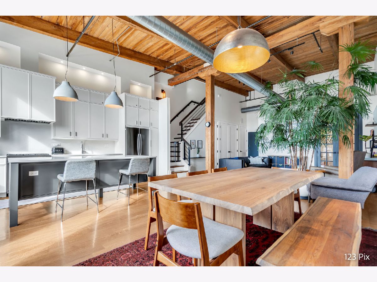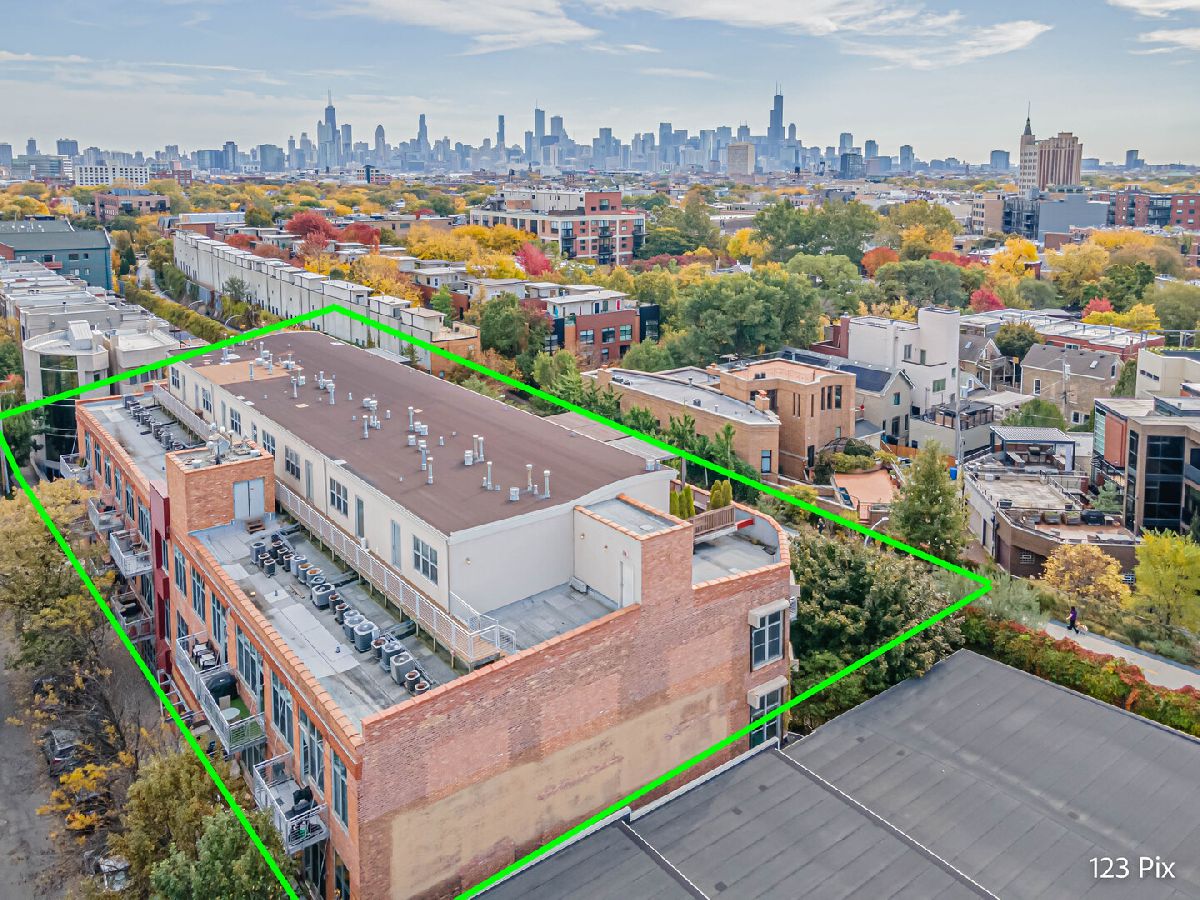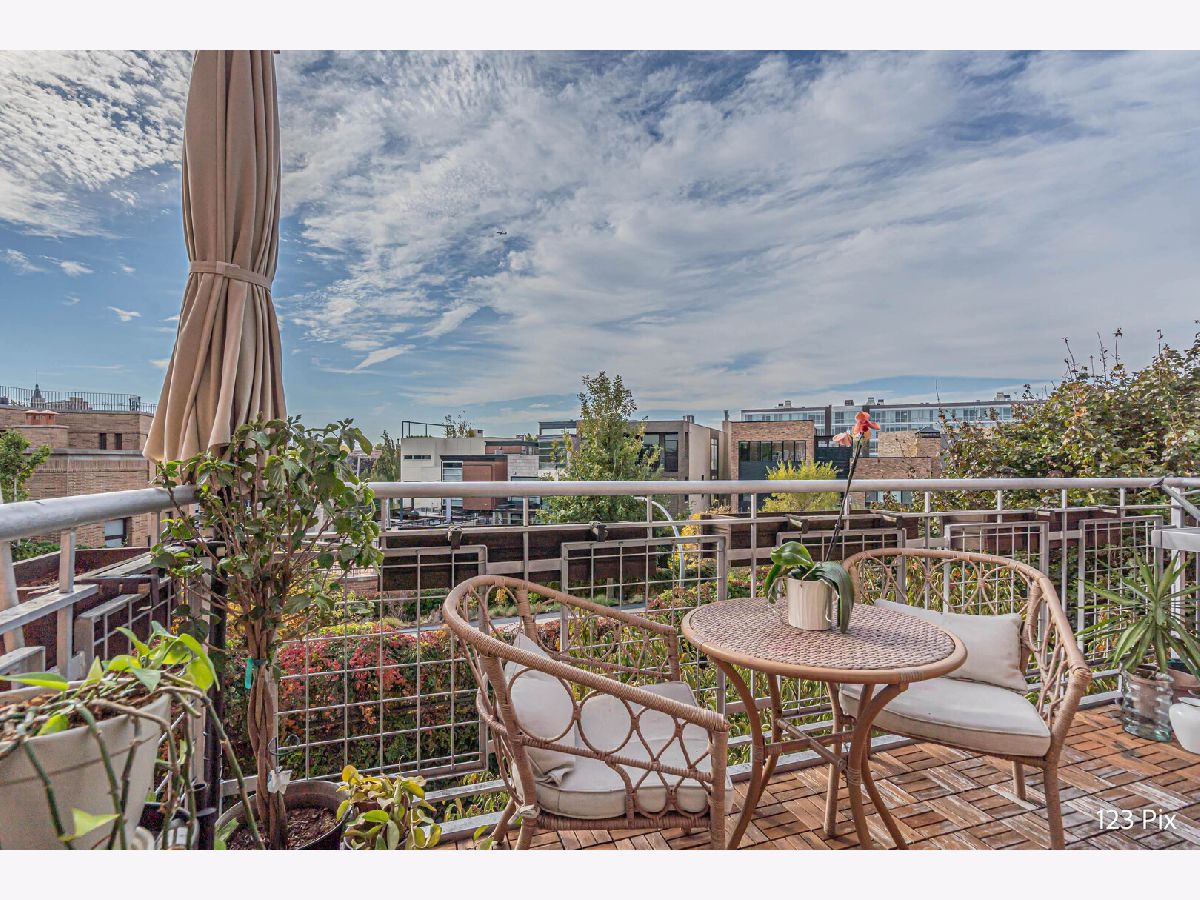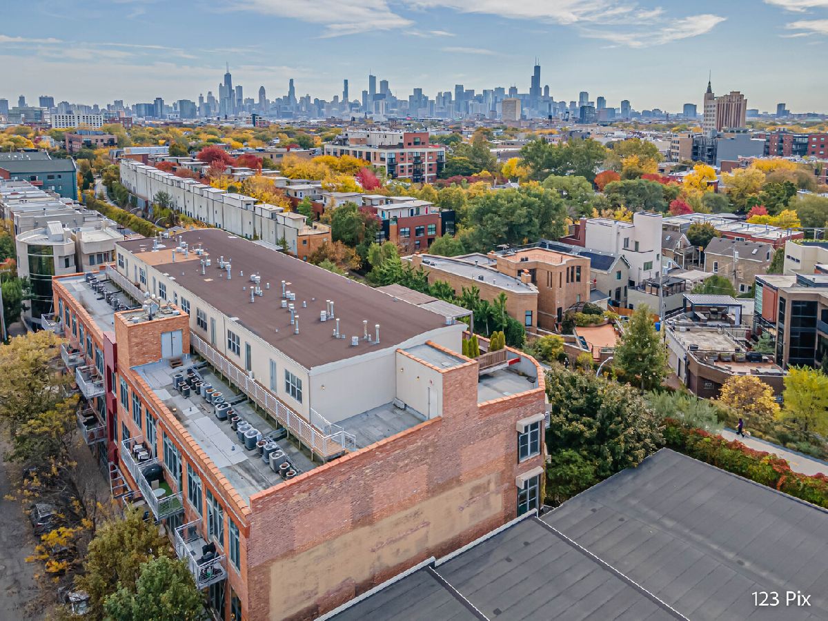 Welcome to a stunning, fully renovated two-story penthouse loft in the heart of Bucktown. The open-concept main level features 18-foot ceilings, douglas fir beams, new white oak hardwood floors, and huge southern facing windows that flood the space with natural light. The kitchen has newer stainless steel appliances, tons of cabinet space, and a large island for cooking and entertaining. The dining, kitchen, and living area leads to a private balcony directly over the 606 trail and has a gas grill / seating area / planters. In addition, the first floor has a built-in bookshelf, walk-in pantry, large closet, bathroom, and dedicated work from home space. On the second floor, there are two light-filled bedrooms. Each has a bathroom and walk-in closet.The master bath is en-suite with a freestanding tub, Italian marble shower, custom-built dual-vanity with Grohe fixtures, inset medicine cabinets, heated floors, and heated towel rack. The hallway has a third walk-in closet, deep linen closet, and laundry area. Lastly, step outside to the furnished rooftop patio with a panoramic view of Chicago. Additional features include an indoor parking spot, elevator, shared (building) guest parking, and ample free outdoor parking (no more driving around looking for spots!). The building is steps from Damen Avenue, Wicker Park, and Logan Square, with easy access to a variety of restaurants, shops, grocery, daycares, and parks/playgrounds.