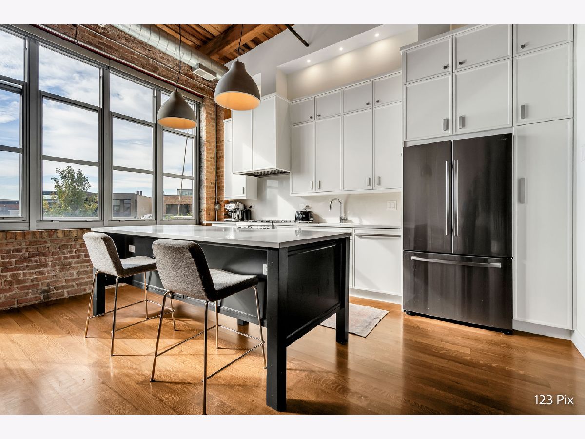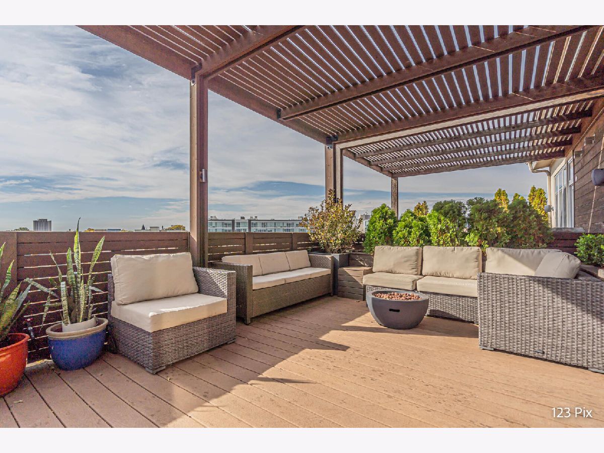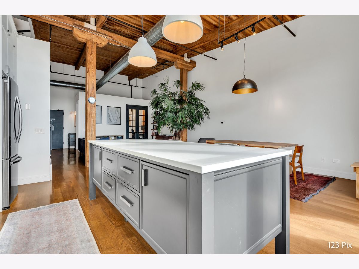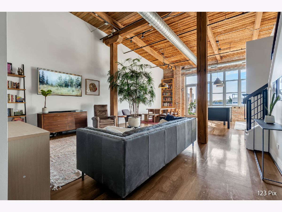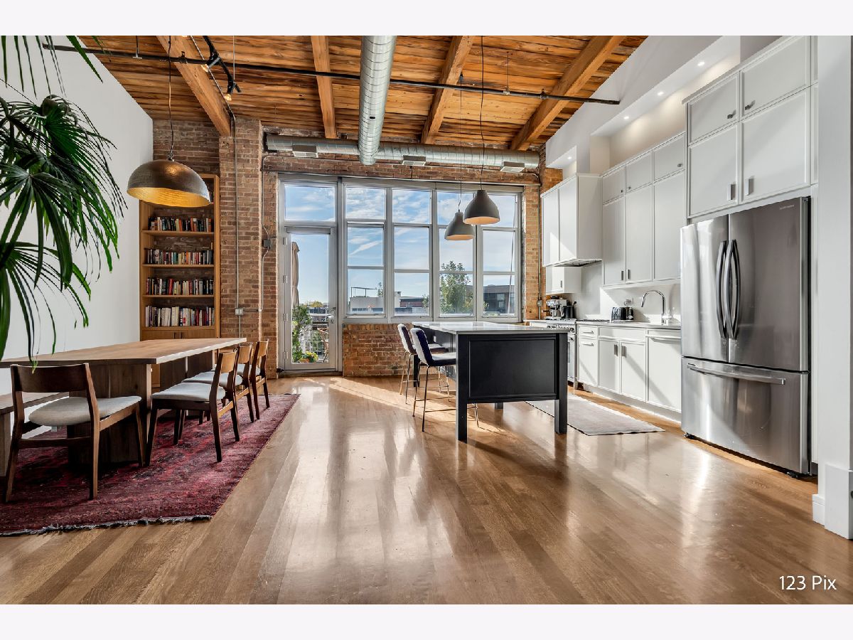 Welcome to a stunning, fully renovated two-story penthouse loft in the heart of Bucktown. The open-concept main level features 18-foot ceilings, douglas fir beams, new white oak hardwood floors, and huge southern facing windows that flood the space with natural light. The kitchen has newer stainless steel appliances, tons of cabinet space, and a large island for cooking and entertaining. The dining, kitchen, and living area leads to a private balcony directly over the 606 trail and has a gas grill / seating area / planters. In addition, the first floor has a built-in bookshelf, walk-in pantry, large closet, bathroom, and dedicated work from home space. On the second floor, there are two light-filled bedrooms. Each has a bathroom and walk-in closet.The master bath is en-suite with a freestanding tub, Italian marble shower, custom-built dual-vanity with Grohe fixtures, inset medicine cabinets, heated floors, and heated towel rack. The hallway has a third walk-in closet, deep linen closet, and laundry area. Lastly, step outside to the furnished rooftop patio with a panoramic view of Chicago. Additional features include an indoor parking spot, elevator, shared (building) guest parking, and ample free outdoor parking (no more driving around looking for spots!). The building is steps from Damen Avenue, Wicker Park, and Logan Square, with easy access to a variety of restaurants, shops, grocery, daycares, and parks/playgrounds.