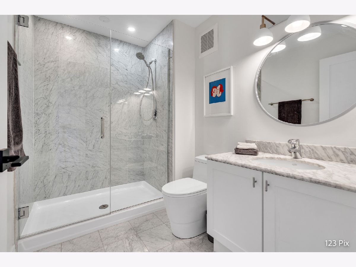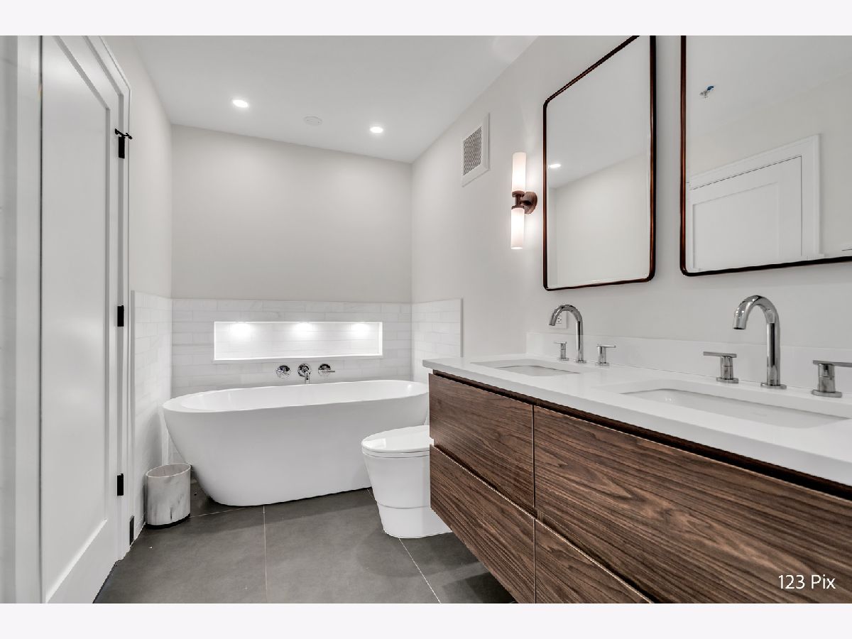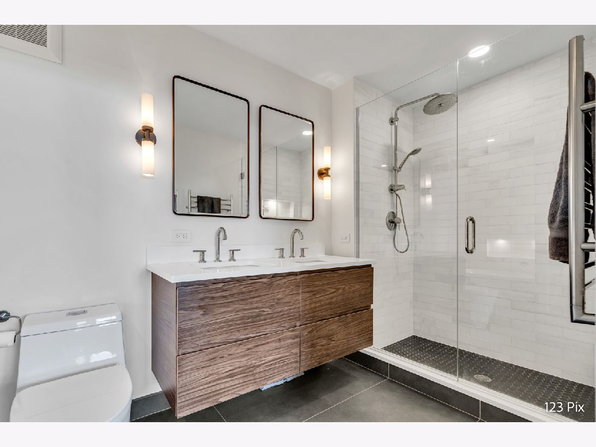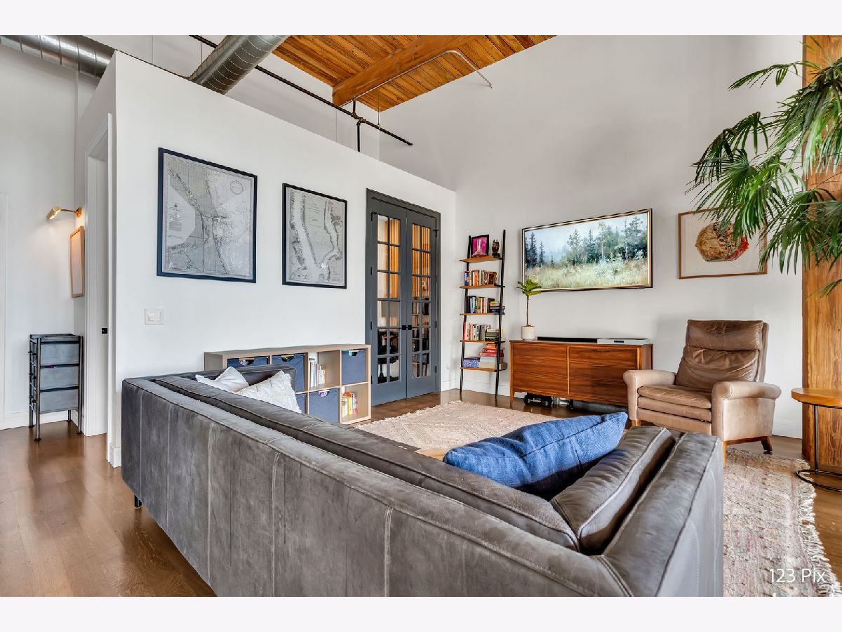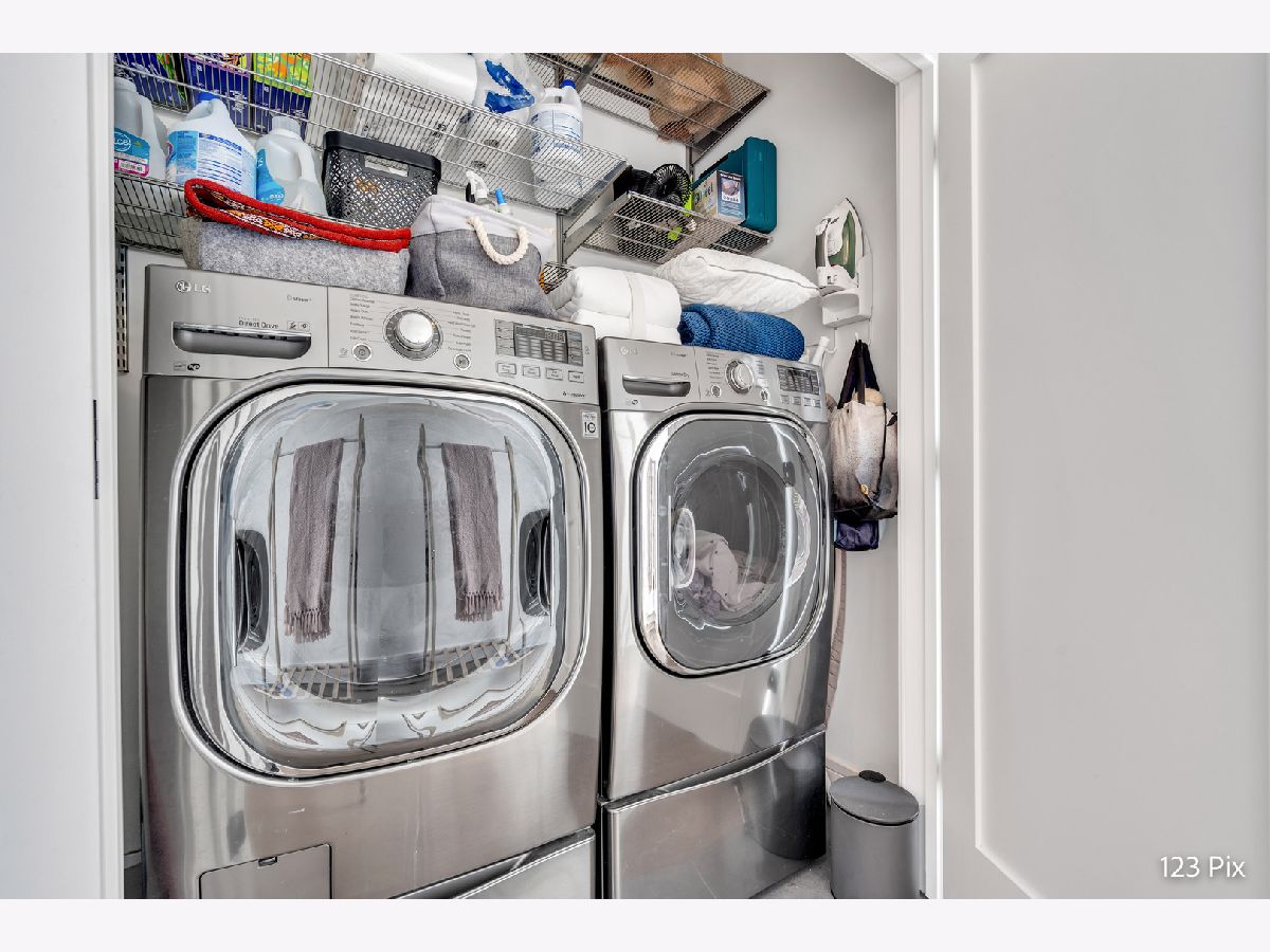 Welcome to a stunning, fully renovated two-story penthouse loft in the heart of Bucktown. The open-concept main level features 18-foot ceilings, douglas fir beams, new white oak hardwood floors, and huge southern facing windows that flood the space with natural light. The kitchen has newer stainless steel appliances, tons of cabinet space, and a large island for cooking and entertaining. The dining, kitchen, and living area leads to a private balcony directly over the 606 trail and has a gas grill / seating area / planters. In addition, the first floor has a built-in bookshelf, walk-in pantry, large closet, bathroom, and dedicated work from home space. On the second floor, there are two light-filled bedrooms. Each has a bathroom and walk-in closet.The master bath is en-suite with a freestanding tub, Italian marble shower, custom-built dual-vanity with Grohe fixtures, inset medicine cabinets, heated floors, and heated towel rack. The hallway has a third walk-in closet, deep linen closet, and laundry area. Lastly, step outside to the furnished rooftop patio with a panoramic view of Chicago. Additional features include an indoor parking spot, elevator, shared (building) guest parking, and ample free outdoor parking (no more driving around looking for spots!). The building is steps from Damen Avenue, Wicker Park, and Logan Square, with easy access to a variety of restaurants, shops, grocery, daycares, and parks/playgrounds.