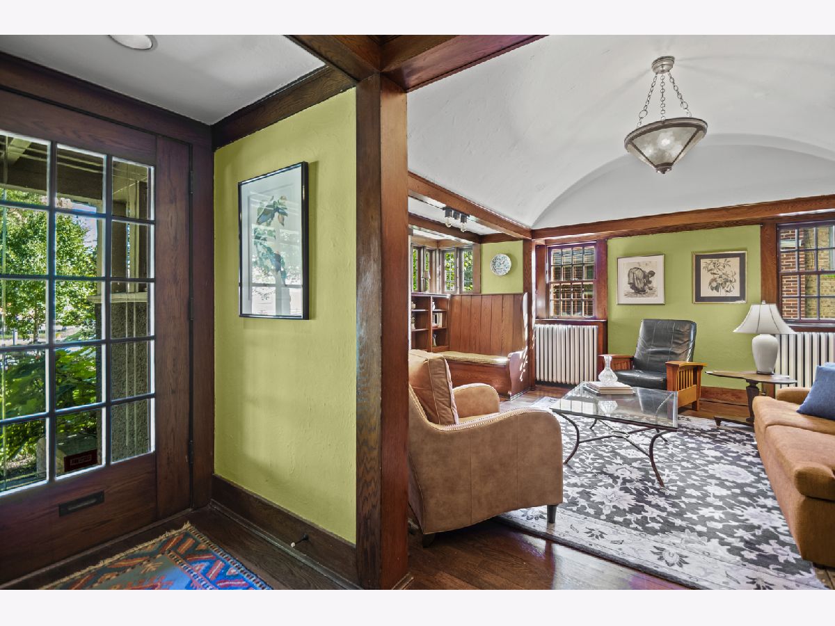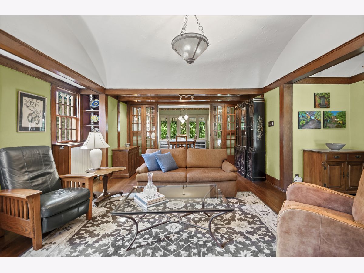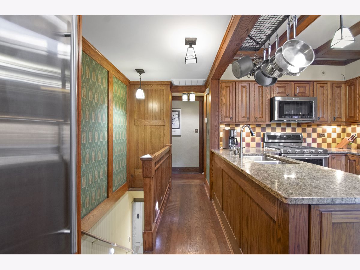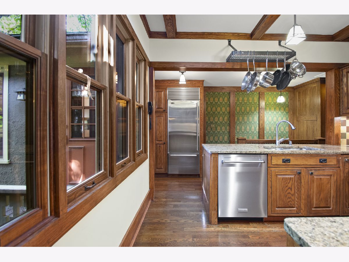 This rare 1911 Craftsman-Style 3 BR / 2 BA bungalow is a true gem in West Ridge, unlike anything else on the Far North Side. Built around a towering red oak tree, this U-shaped stucco home features striking architectural details by renowned architect George W. Maher. Post-and-beam entry porch opens to a barrel-vaulted foyer and living room that make a dramatic first impression with natural oak woodwork, original leaded glass windows and an inglenook gas fireplace with built-in oak benches and bookcases. Separated by French doors, the bright dining room is surrounded on three sides by casement windows, filling the space with abundant natural light. Renovated kitchen offers oak cabinetry with glass-front doors, granite countertops, and a square tile backsplash, complemented by Arts and Crafts inspired pendant lighting and decorative borders, along with a Sub-Zero refrigerator and SS appliances (oven, dishwasher, microwave less than 5 years old). This home was made for entertaining! A back door off the kitchen opens to a generously sized Trex deck (new in 2023) and a beautifully landscaped backyard. The spacious outdoor area features a brick paver patio, tranquil pond, potting shed and a two-car garage - perfect for gatherings or everyday enjoyment. All three bedrooms are generously sized and conveniently located on the first floor, along with a full bathroom - renovated in 2010 to complement the home's vintage charm with the original tub, pedestal sink, classic subway tile, and sconces. Light-filled lower level features an expansive family room w/decorative fireplace and built-in bookshelves (perfect as a home office or additional bedroom), full bath with walk-in shower, large laundry room with chute and ample storage. All big projects are already done for you - roof (2018), water heater (2021), boiler and central air (2022). Only minutes away from Indian Boundary Park, local grocery stores, restaurants, CTA and just 5 blocks to the Metra. This home is meticulously maintained and thoughtfully designed, this remarkable opportunity should not be missed!