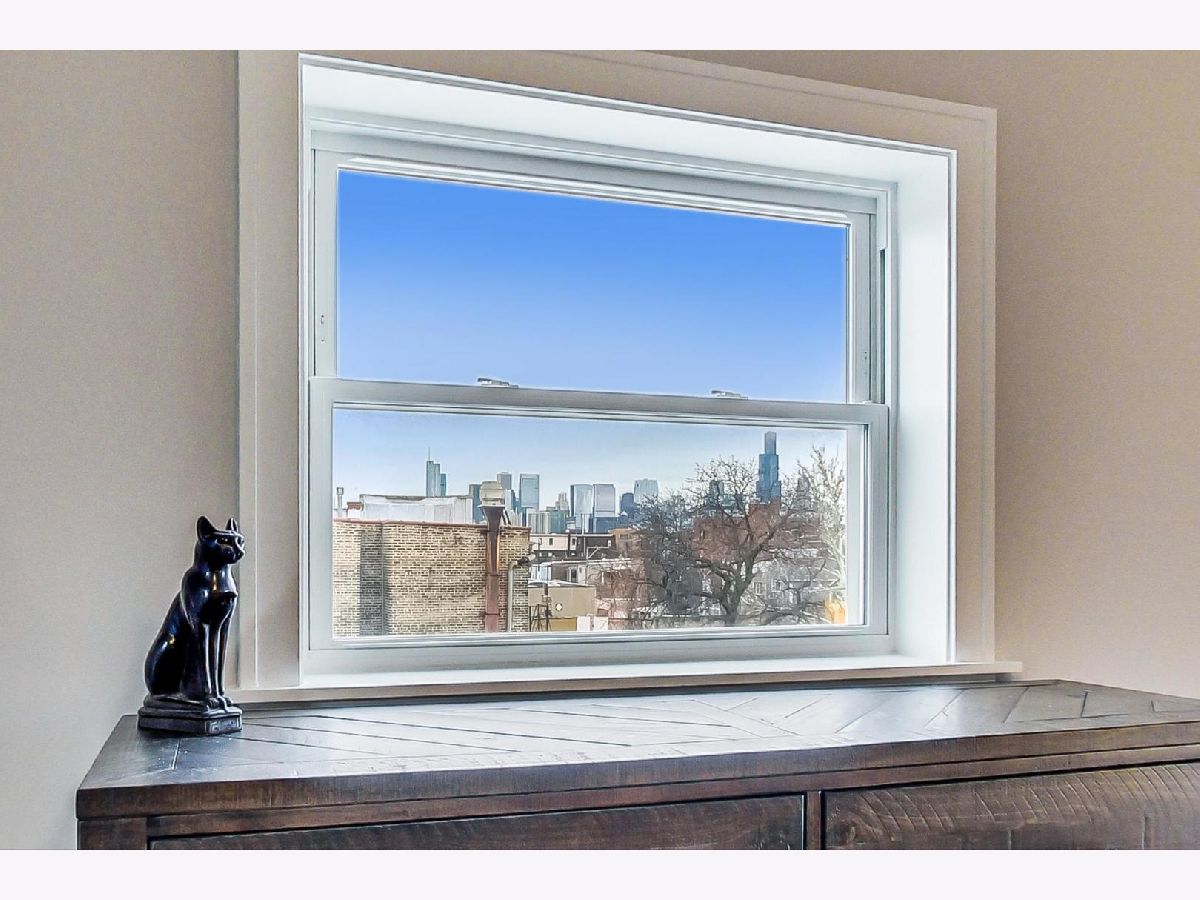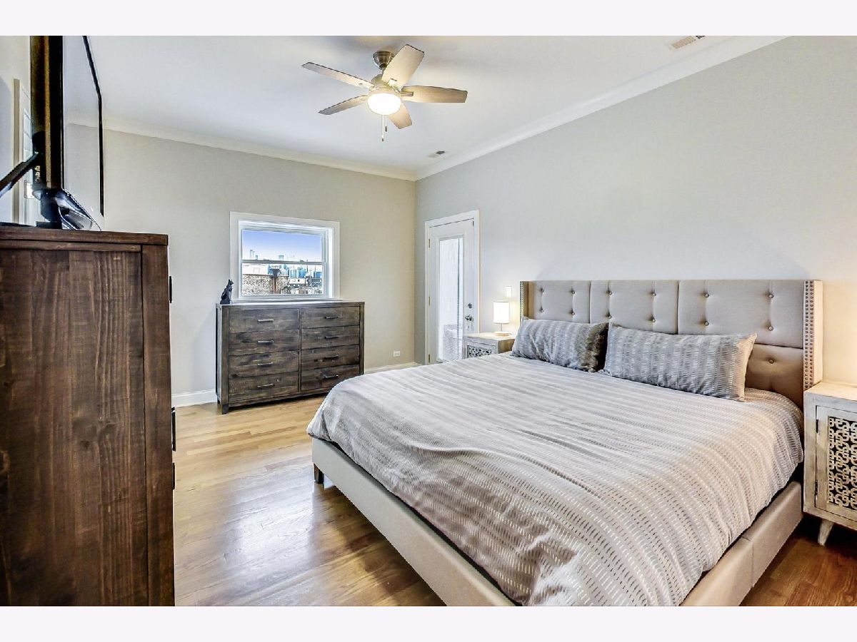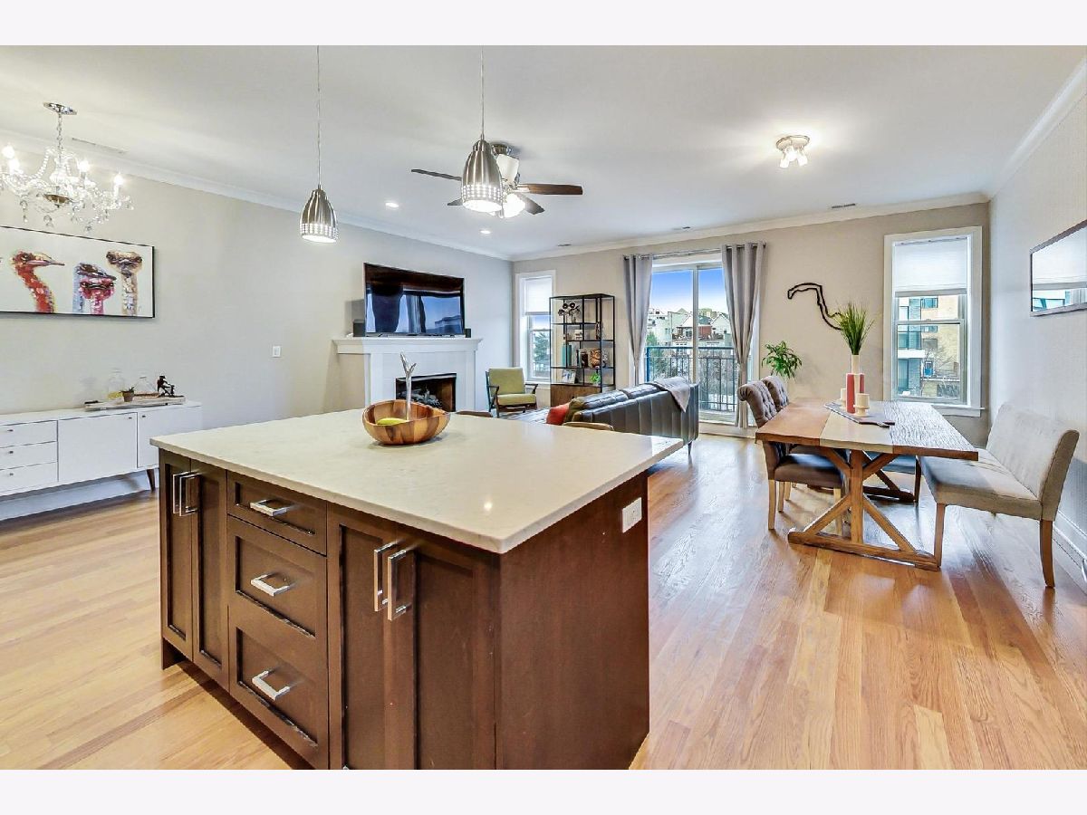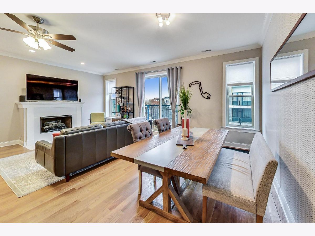 This is the unicorn you've been searching for! Perfect location, immense 1450+ sf floor plan, like-new finishes, and TOP FLOOR. Nothing to do but move in and enjoy! Completely rehabbed in 2017, this sunny penthouse stuns with soaring 9.5ft ceiling, beautiful hardwood floors throughout, cozy gas fireplace, and large dining area. High-end stainless kitchen has 42" cabinets, gorgeous quartz countertops, and island/breakfast bar combo. The extra wide hallway leads to a large 2nd bedroom, beautifully renovated 2nd bath, and your primary suite oasis. The luxurious king-sized suite boasts a spa-like rain shower, huge custom organized walk-in closet, brilliant skyline view, and a private covered patio for enjoying your morning coffee. Have the city at your fingertips with easy access to CTA (Damen and Chicago busses), and walk to parks, cafes, local boutiques, award-winning dining, and grocery. One gated parking space is included in price. Boutique HOA with healthy reserves. This one won't last!