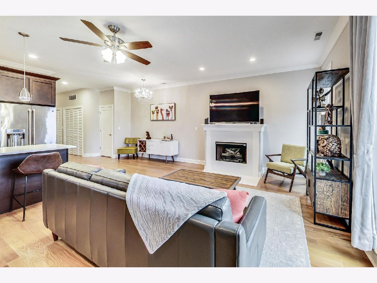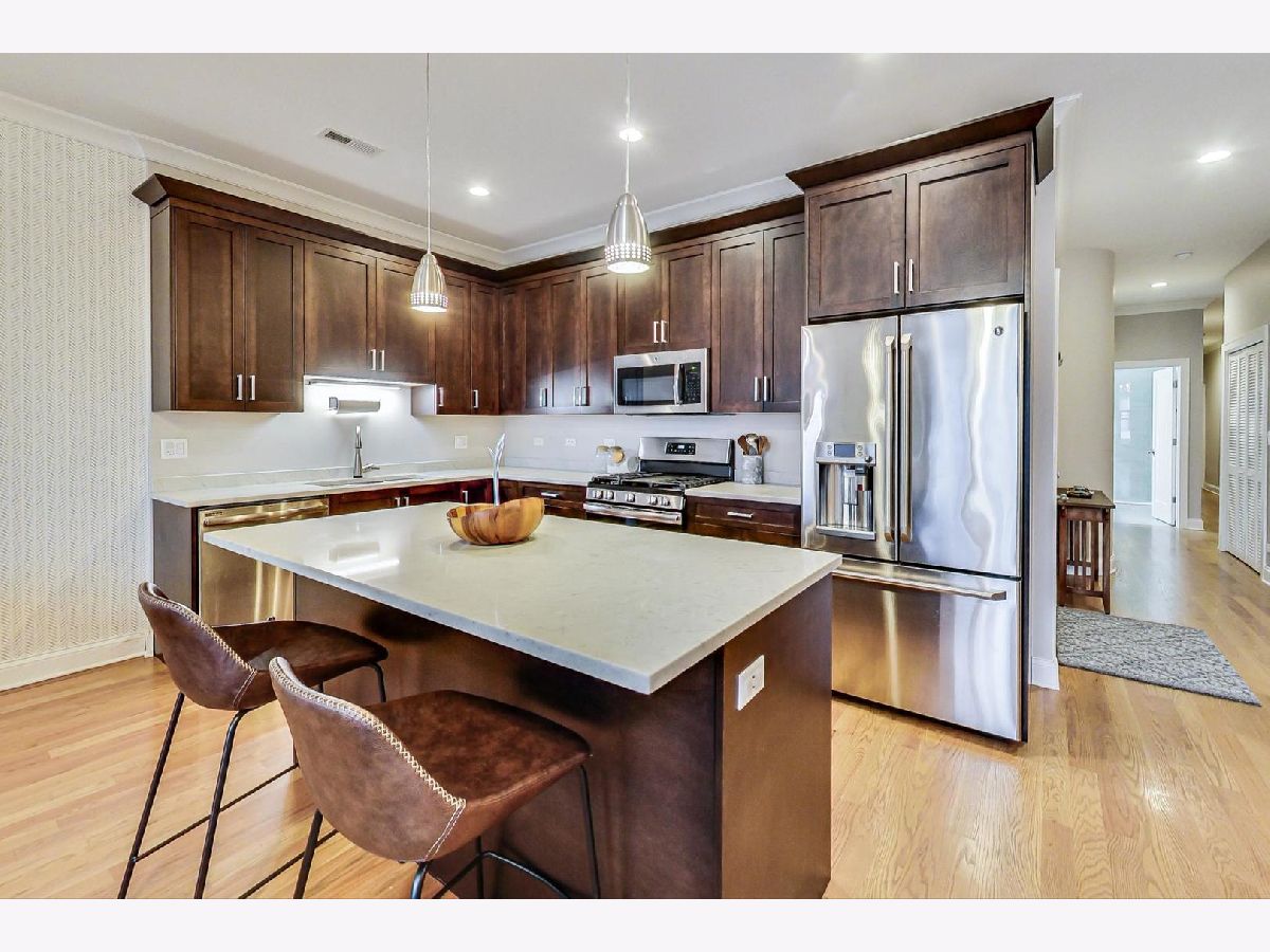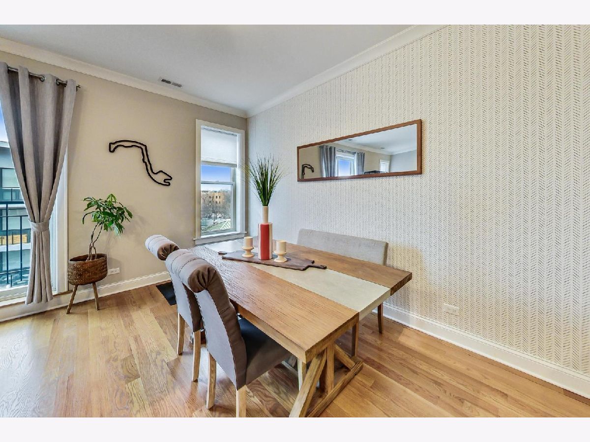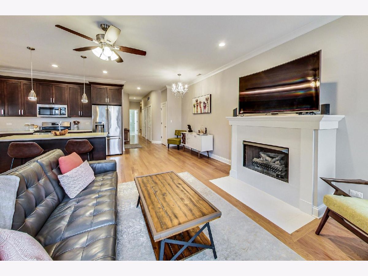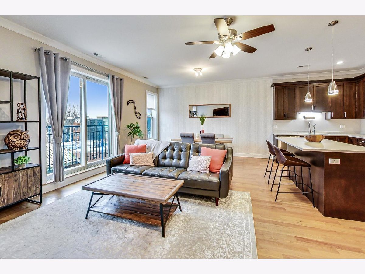 This is the unicorn you've been searching for! Perfect location, immense 1450+ sf floor plan, like-new finishes, and TOP FLOOR. Nothing to do but move in and enjoy! Completely rehabbed in 2017, this sunny penthouse stuns with soaring 9.5ft ceiling, beautiful hardwood floors throughout, cozy gas fireplace, and large dining area. High-end stainless kitchen has 42" cabinets, gorgeous quartz countertops, and island/breakfast bar combo. The extra wide hallway leads to a large 2nd bedroom, beautifully renovated 2nd bath, and your primary suite oasis. The luxurious king-sized suite boasts a spa-like rain shower, huge custom organized walk-in closet, brilliant skyline view, and a private covered patio for enjoying your morning coffee. Have the city at your fingertips with easy access to CTA (Damen and Chicago busses), and walk to parks, cafes, local boutiques, award-winning dining, and grocery. One gated parking space is included in price. Boutique HOA with healthy reserves. This one won't last!