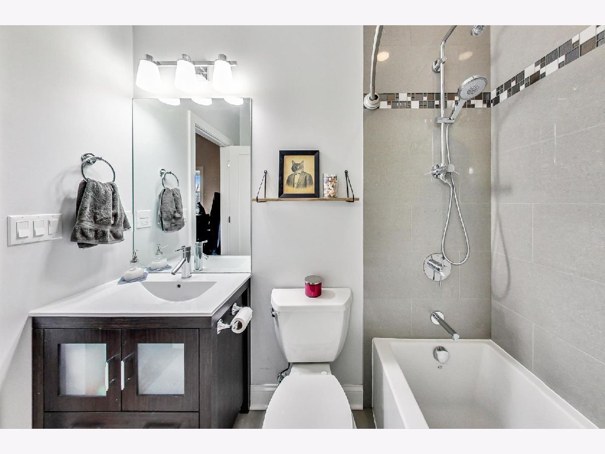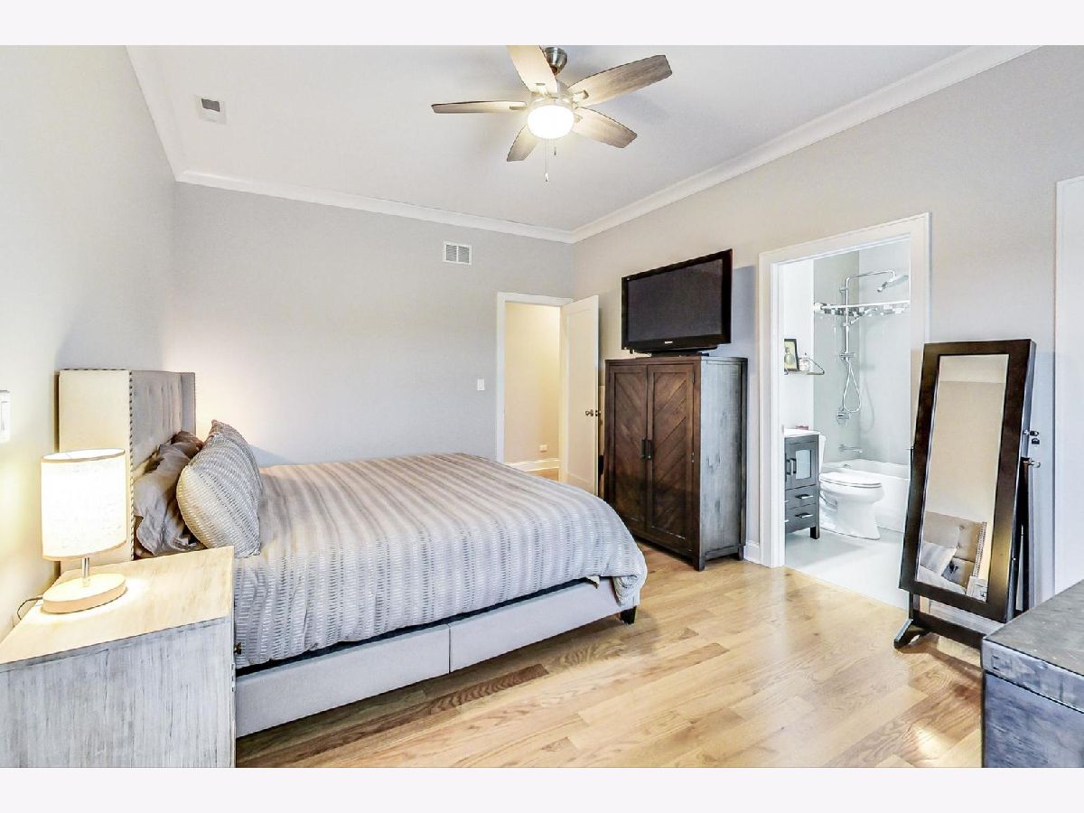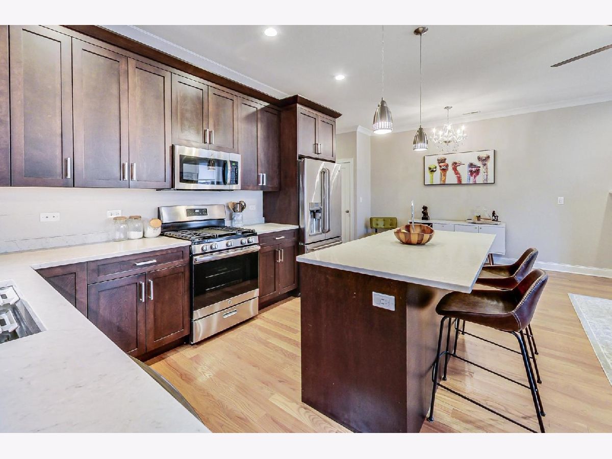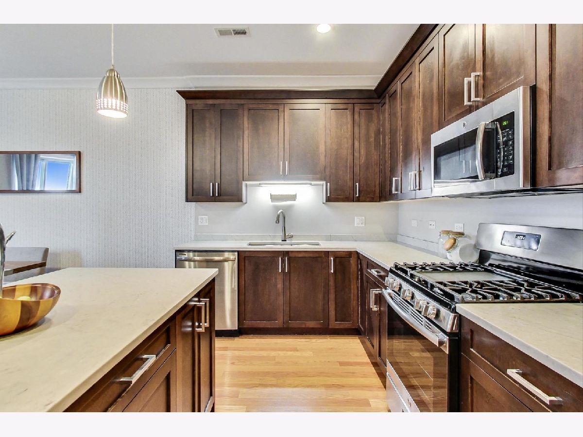 This is the unicorn you've been searching for! Perfect location, immense 1450+ sf floor plan, like-new finishes, and TOP FLOOR. Nothing to do but move in and enjoy! Completely rehabbed in 2017, this sunny penthouse stuns with soaring 9.5ft ceiling, beautiful hardwood floors throughout, cozy gas fireplace, and large dining area. High-end stainless kitchen has 42" cabinets, gorgeous quartz countertops, and island/breakfast bar combo. The extra wide hallway leads to a large 2nd bedroom, beautifully renovated 2nd bath, and your primary suite oasis. The luxurious king-sized suite boasts a spa-like rain shower, huge custom organized walk-in closet, brilliant skyline view, and a private covered patio for enjoying your morning coffee. Have the city at your fingertips with easy access to CTA (Damen and Chicago busses), and walk to parks, cafes, local boutiques, award-winning dining, and grocery. One gated parking space is included in price. Boutique HOA with healthy reserves. This one won't last!