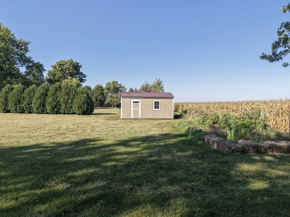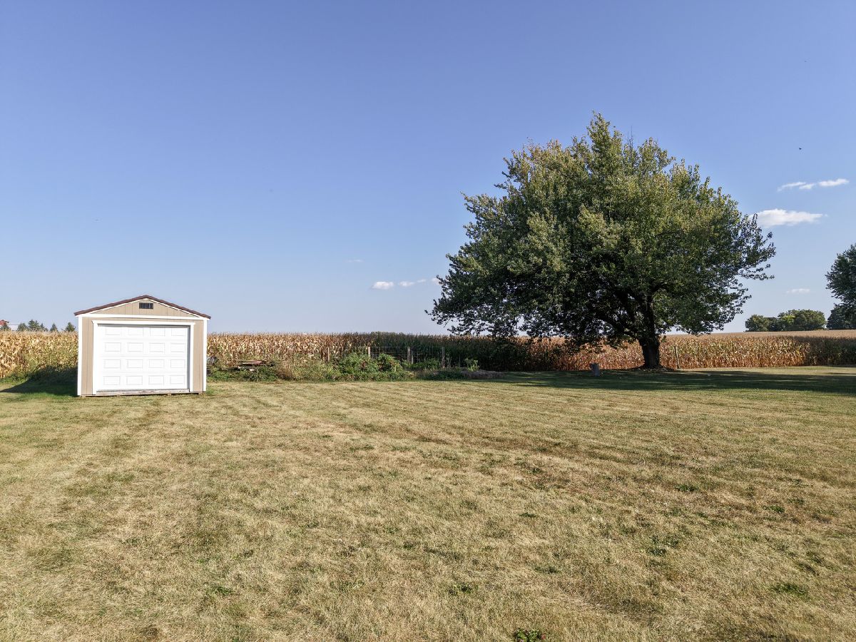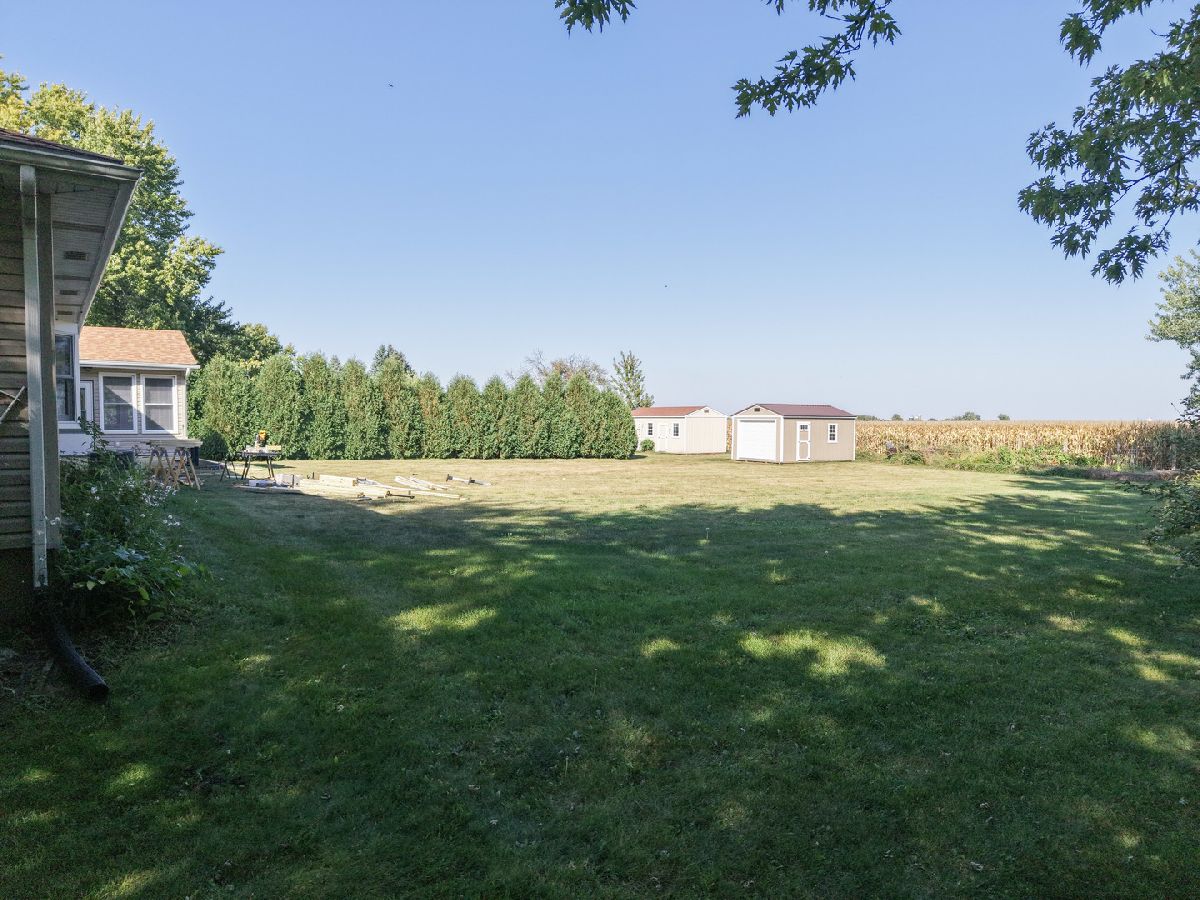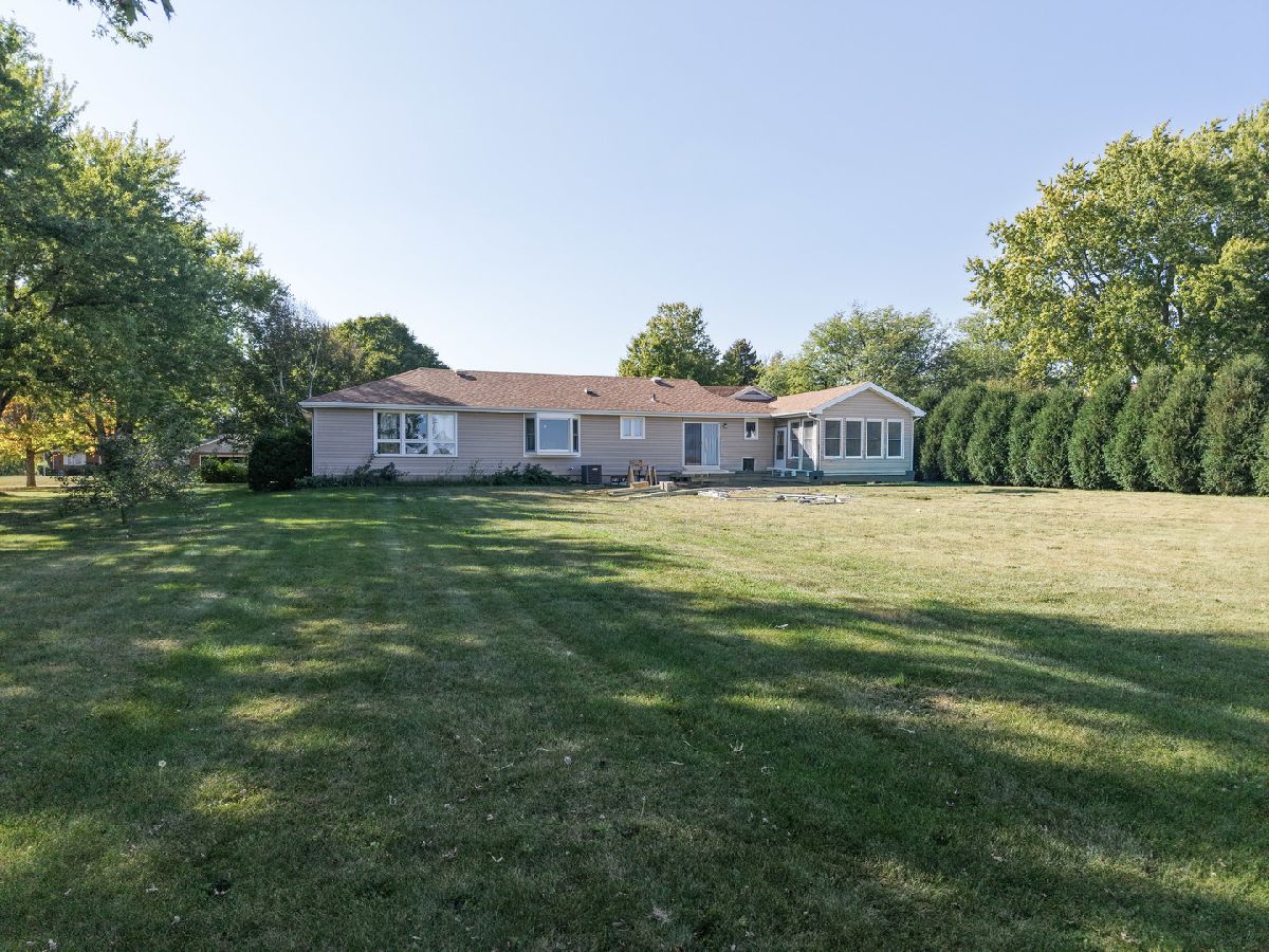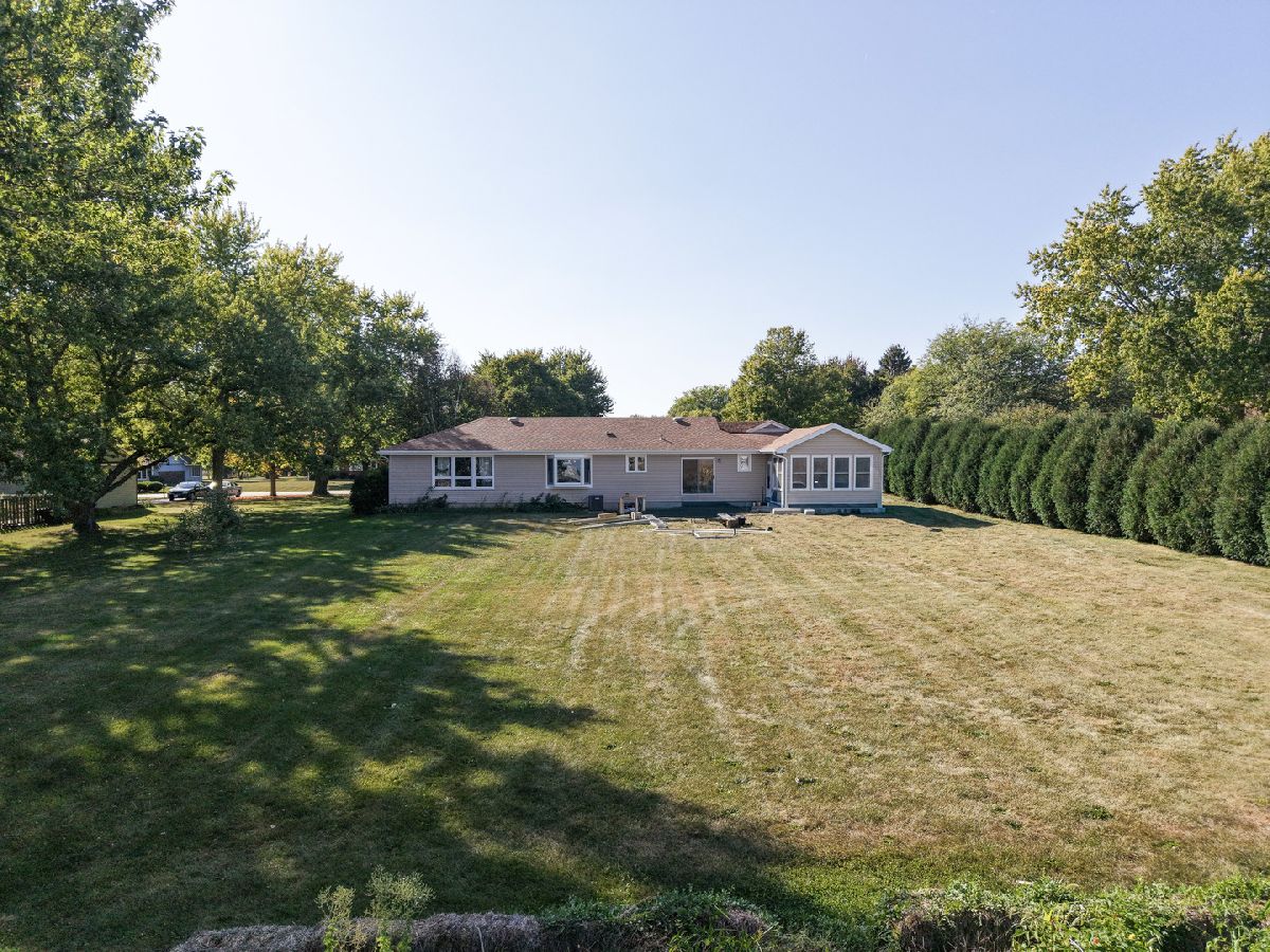 Welcome Home and enjoy the tranquility of this COUNTRY RANCH situated on a.72 acre lot that backs up to a corn field. Enjoy the sunsets from the recently new deck or from the front porch. Enter this three bedroom, 2.5 bath home through the large foyer off the sunken living room with new carpet and a wood burning fireplace. Eat in kitchen with separate dining room overlooking the 3/4 acre back yard with shed. Office/den, powder room of the 1st floor laundry. 3 seasons sun room with bar for entertaining. Pegged hardwood floors in the bedrooms and under carpet in family room with new carpet. Large primary with jaccuzi tub, separate shower and skylight. Oversized 2 car garage. Basement with a newly lined crawl. Enjoy peaceful living and a bit of the country yet close to town with all the amenities. Updates: carpet 2025, deck 2025, powder room, epoxy garage floor, 2 new basement windows, lined the crawl space, stove and dishwasher in 2025, refrigerator in 2024, 2014 roof, furnace and blower in 2014, primary skylight in 2023.