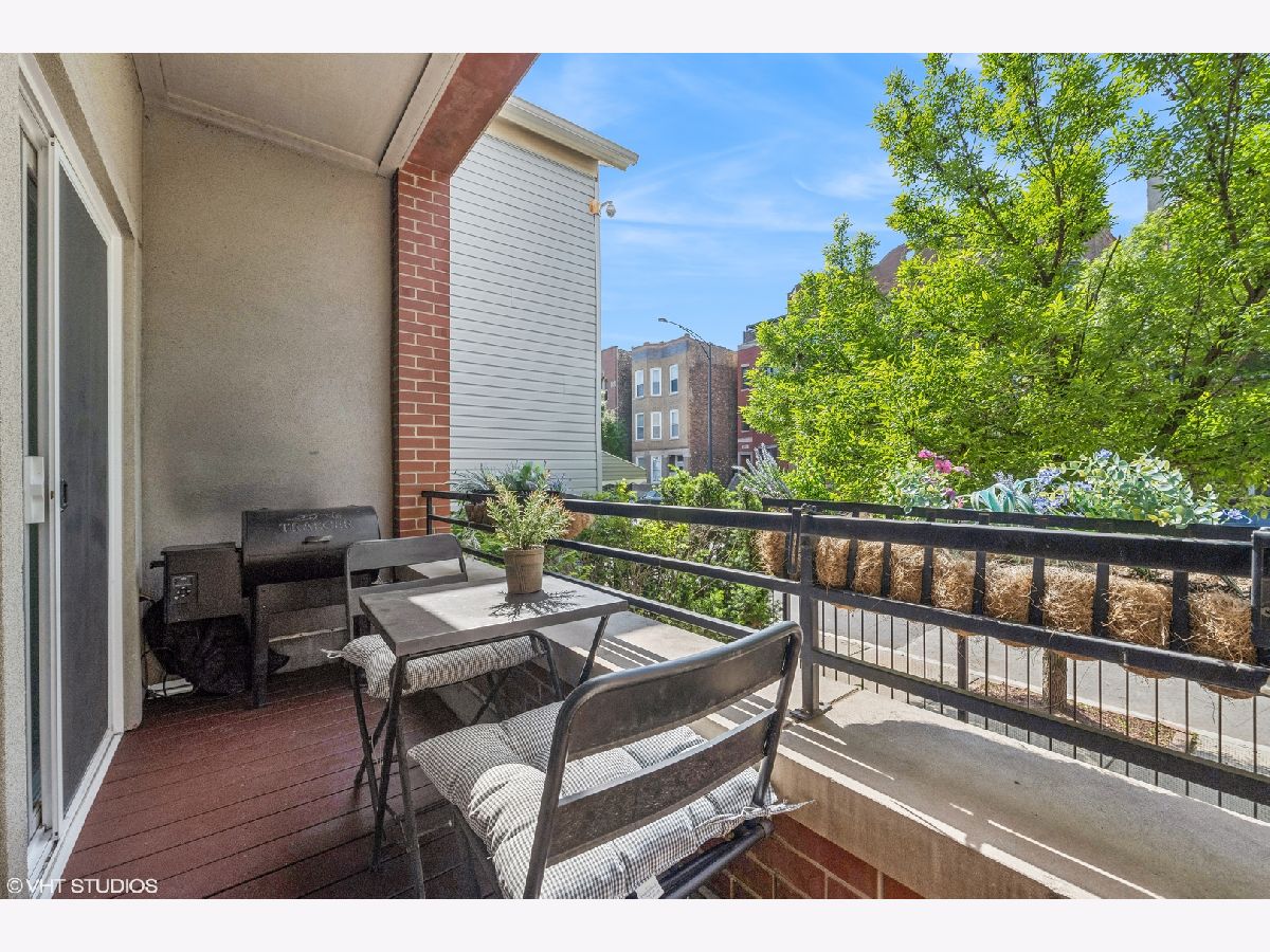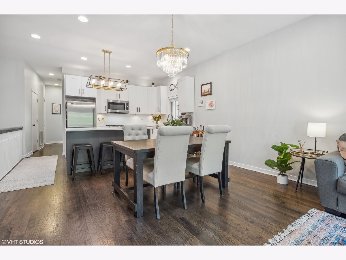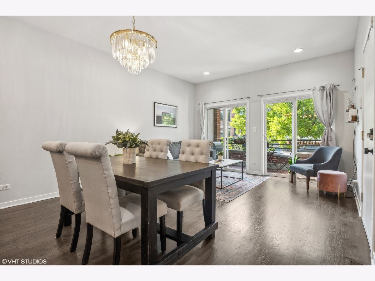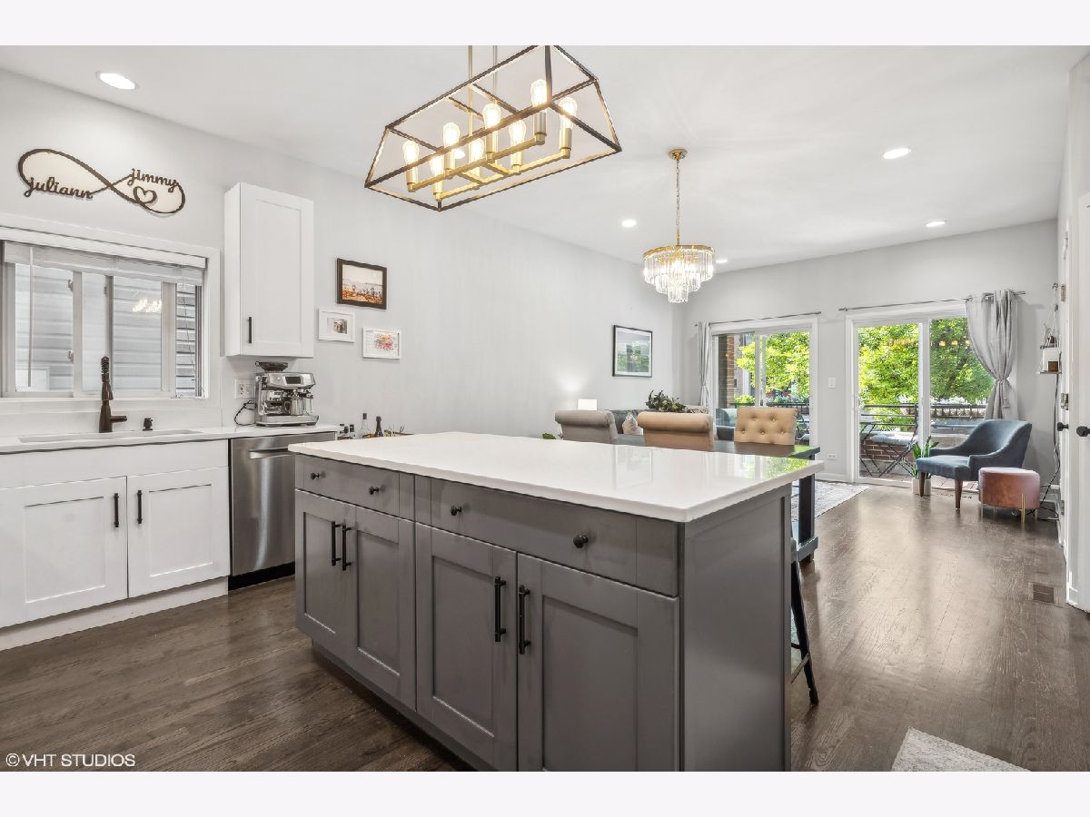 Welcome to this sprawling 3-bedroom, 2.5-bath duplex down with amazing outdoor space in the heart of Bucktown, where modern elegance meets urban convenience. Step inside to discover newly refinished rich oak hardwood floors that flow seamlessly throughout. Updated kitchen is a chef's dream, featuring crisp white cabinetry, quartz countertops, newer stainless steel appliances, and an island with a breakfast bar. Adjacent to the kitchen, the separate dining area and comfortable living room is bathed in natural light from southern-facing wall of patio door windows and leads to a wonderful front deck, perfect for grilling and dining al fresco! King-sized primary suite offers a serene retreat with an en-suite bath and a spacious walk-in closet. Lower level is designed for entertaining and relaxation, featuring a grand recreation room with a beautiful tiled fireplace and an extra large sunken patio. This level also includes two nicely sized bedrooms, another full bath, and a convenient laundry room. Recent updates includes a newer furnace, water heater, and a new roof coming this summer (will be paid prior to closing). With garage parking and abundant storage throughout, this home offers both style and practicality in one of Bucktown's most desirable locations. Walk to everything including restaurants, coffee shops, shopping, Holstein park, the 606, public transit and more!