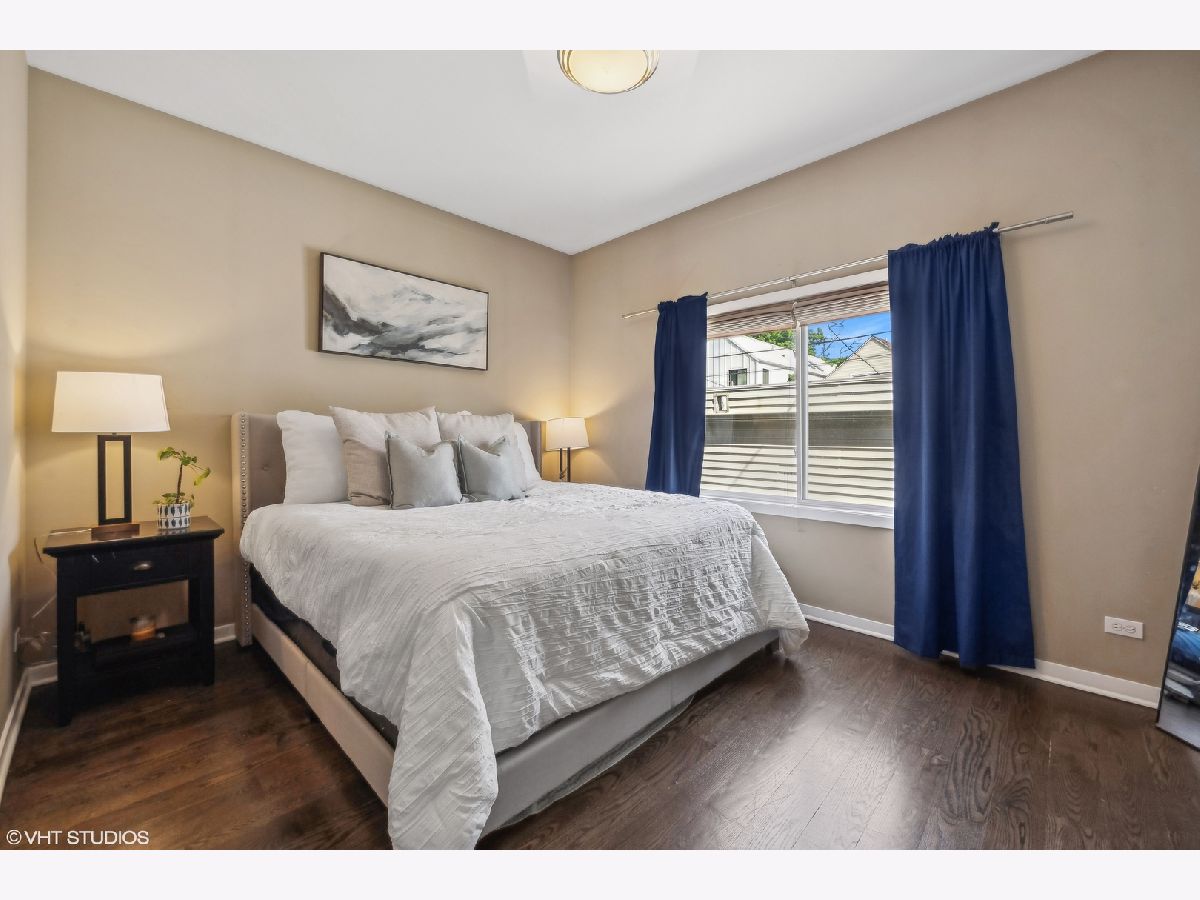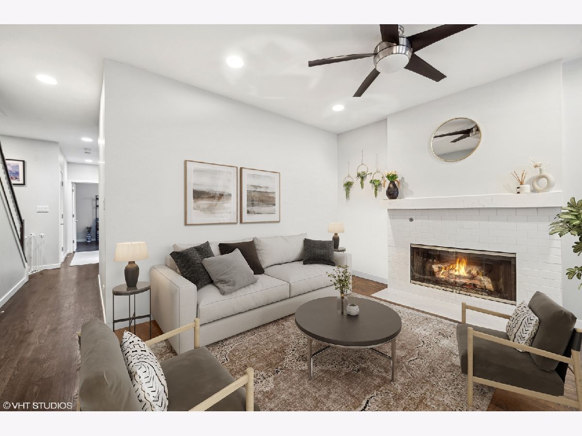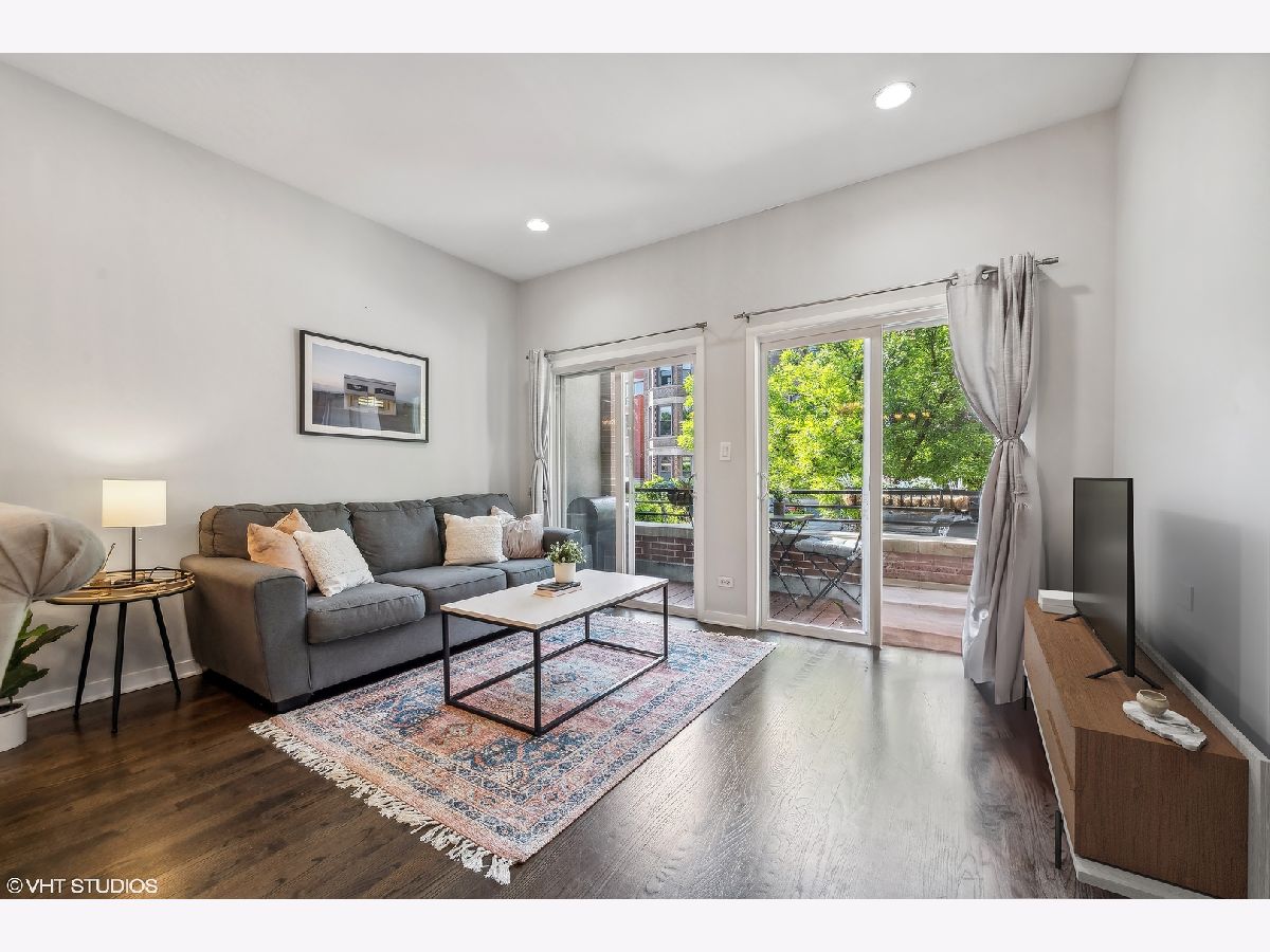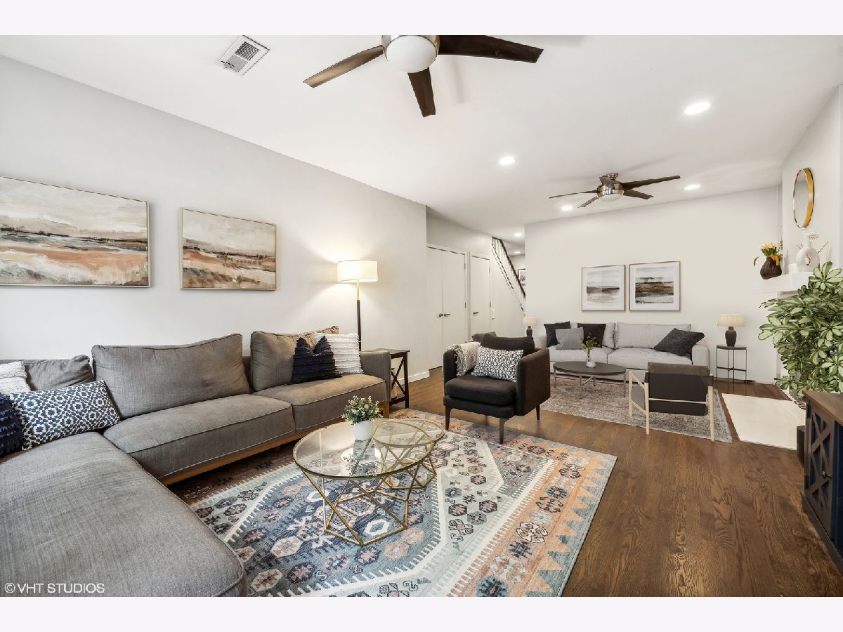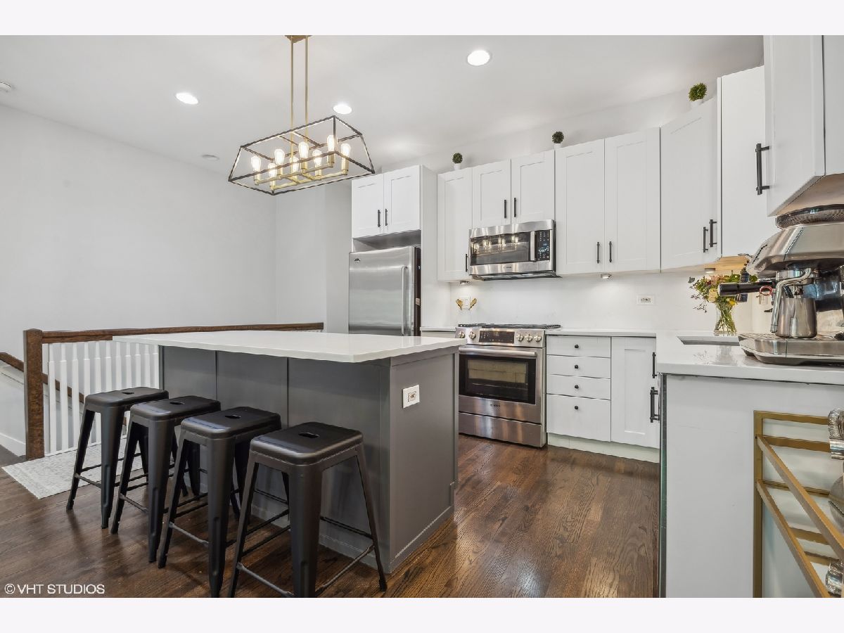 Welcome to this sprawling 3-bedroom, 2.5-bath duplex down with amazing outdoor space in the heart of Bucktown, where modern elegance meets urban convenience. Step inside to discover newly refinished rich oak hardwood floors that flow seamlessly throughout. Updated kitchen is a chef's dream, featuring crisp white cabinetry, quartz countertops, newer stainless steel appliances, and an island with a breakfast bar. Adjacent to the kitchen, the separate dining area and comfortable living room is bathed in natural light from southern-facing wall of patio door windows and leads to a wonderful front deck, perfect for grilling and dining al fresco! King-sized primary suite offers a serene retreat with an en-suite bath and a spacious walk-in closet. Lower level is designed for entertaining and relaxation, featuring a grand recreation room with a beautiful tiled fireplace and an extra large sunken patio. This level also includes two nicely sized bedrooms, another full bath, and a convenient laundry room. Recent updates includes a newer furnace, water heater, and a new roof coming this summer (will be paid prior to closing). With garage parking and abundant storage throughout, this home offers both style and practicality in one of Bucktown's most desirable locations. Walk to everything including restaurants, coffee shops, shopping, Holstein park, the 606, public transit and more!