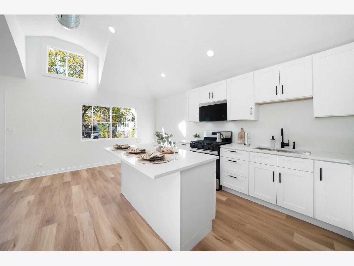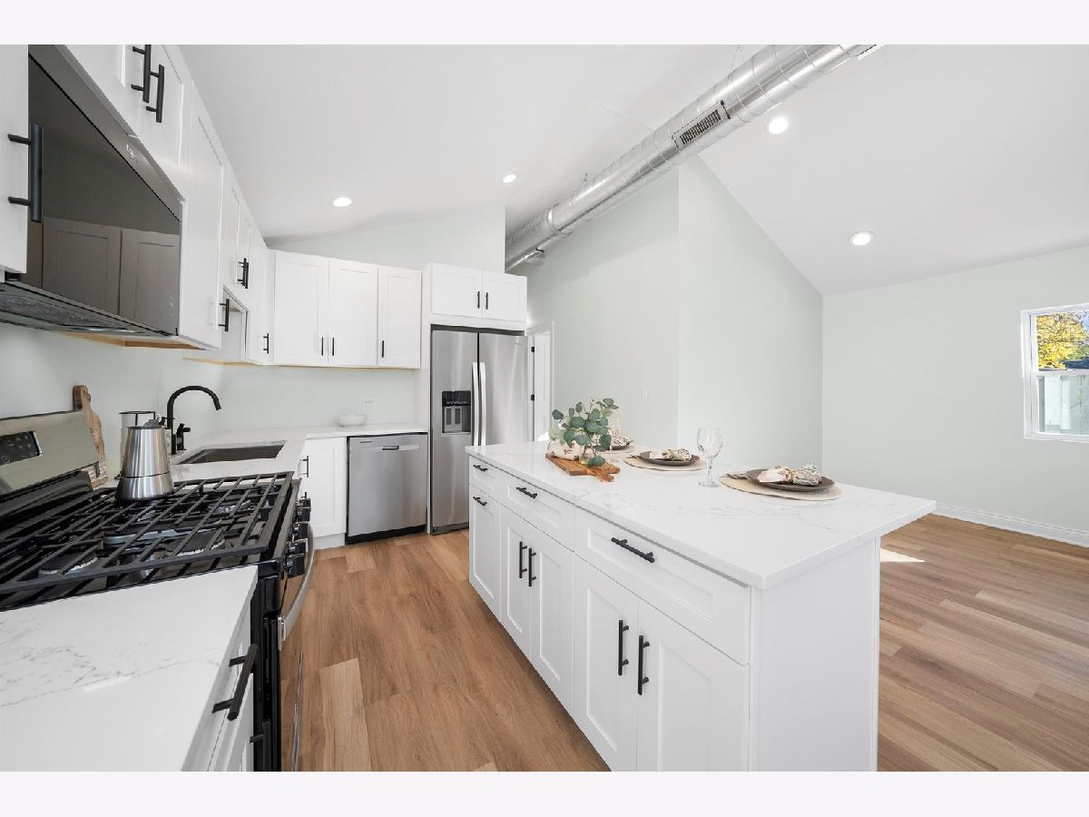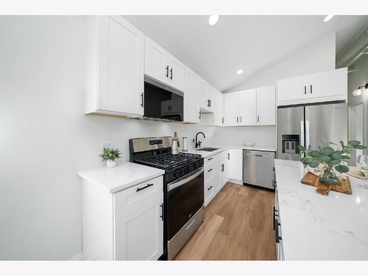 Come take a look at the cutest home on the block, located in the Galewood neighborhood of Chicago. This charming 2-bedroom, 1-bath home has been completely gutted and renovated, offering modern updates throughout. The open-concept layout on the first floor features vaulted ceilings, creating a spacious feel. The kitchen has been thoughtfully redesigned with white shaker cabinets, quartz countertops, and brand-new Whirlpool stainless steel appliances. Large center island for dining and entertainment. The two cozy bedrooms each come with their own closet. The large, modern bathroom features a stylish stand-up shower with contemporary finishes. A private laundry and utility closet is conveniently located towards the back of the home. The lovely back concrete patio is perfect for enjoying summer and fall evenings. Additionally, the large shed in the backyard offers extra storage and can easily be enclosed to create a 3-season room. Recent improvements include all-new electrical throughout the home, brand-new copper plumbing (including a new water heater), new subflooring with reinforced supports and floor joists, as well as new siding and new windows and a brand new AC. Located just a 5-minute walk from the Galewood Metra Station, this home is ideally situated for easy commuting. Perfect for modest homeowners, this cozy, move-in-ready home is ready for its new owners. Don't miss out-schedule your showing today!