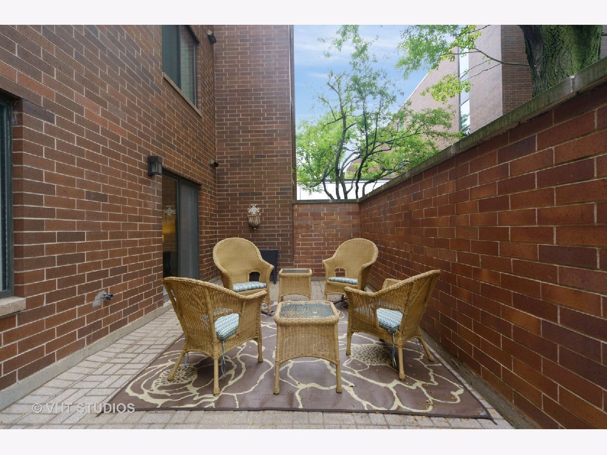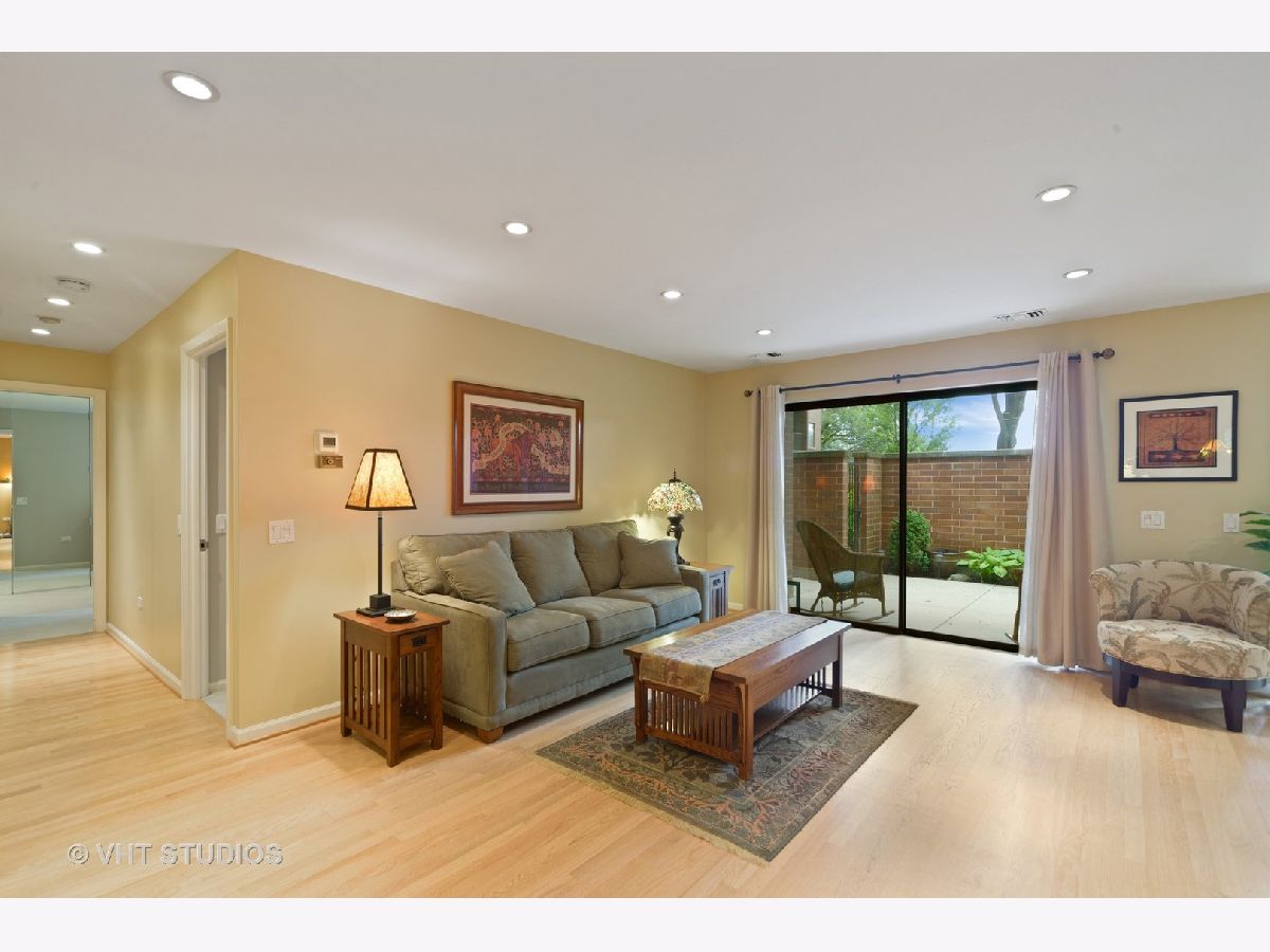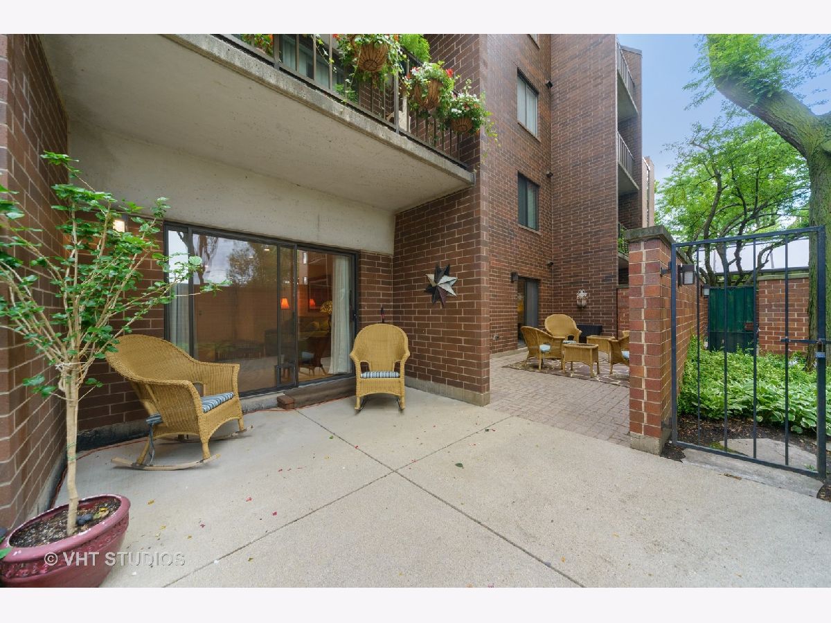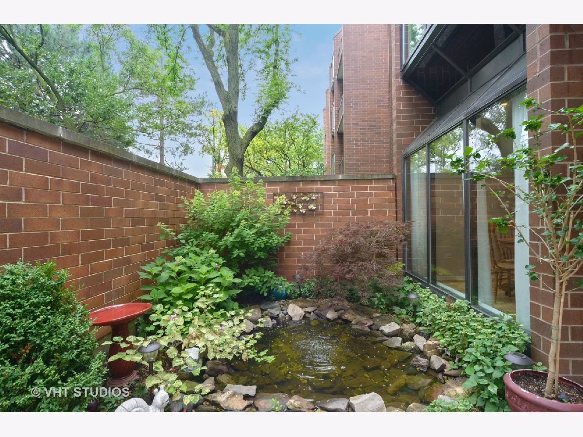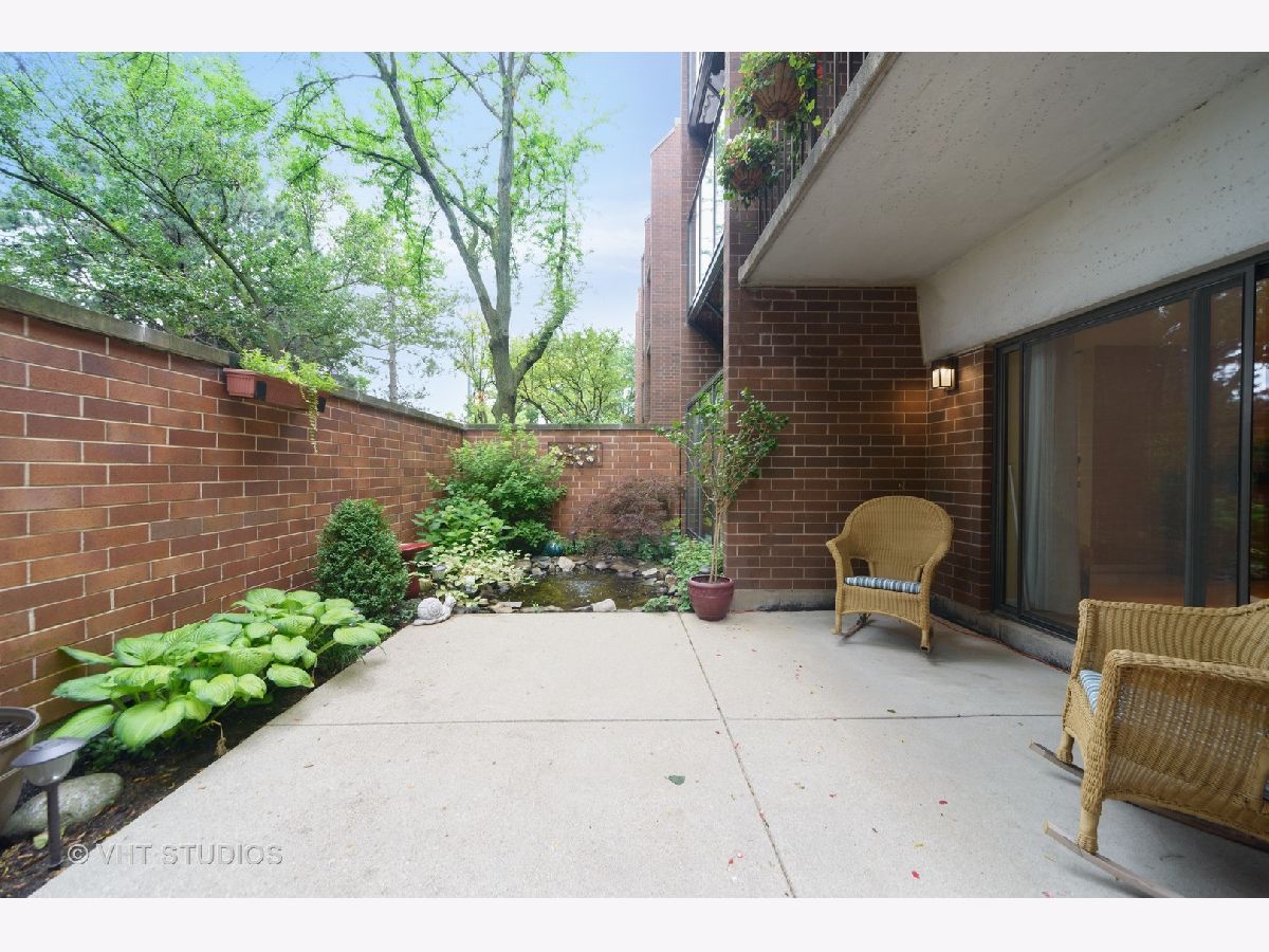 Are you looking for huge outdoor living space and a beautiful main floor condo all in one. This one checks all of those boxes plus the outdoor terrace has a zen garden/pond, can fit a large outdoor table set with chairs, planter boxes and has additional plantings. Brand new painted bedrooms. The Primary bedroom fits plenty of furniture has abundant closet space, and access to the patio. The primary bath features two Kohler stand alone sinks, marble floor tile and a large built shower that offers body sprays, and two sprayers including a handheld and a seat. Access to the terrace from the primary bedroom too. The secondary bath was recently renovated with a white vanity and classic marble top, beautiful tile flooring, and has a walk in tub, glass tile subway tile backsplash along with jets and a seat in the tub. The sunny white kitchen features newer stainless steel side by side refrigerator, stainless steel dishwasher and stainless microwave too. The primary bedroom is huge and has a plethora of closet space. The majority of this home features real oak hardwood floors that can be retained the color of your choice. Tons of modern micro-recessed lighting in this home. The formal dining room can accommodate a large table with 6-8 chairs. The eat-in kitchen area has tons of natural light from the southern exposures, overhead windows and the space can also serve as an office area. A laundry room features newer white Samsung side by side front loading washer/dryers and has ample room for additional storage. A large coat entry closet, a hall linen closet plus a large additional personal storage area in garage area. One premium garage parking space right off the elevator is included and located in a heated garage attached to the building is included in pricing. Professionally managed property. Conveniently located just a block to the Metra station, access to restaurants within walking distance, and a convenient store around the block. So many great features and benefits its hard to list it all here. Easy to show and ready to move into today- Dogs allowed in building but only for 1st floor units like this one!