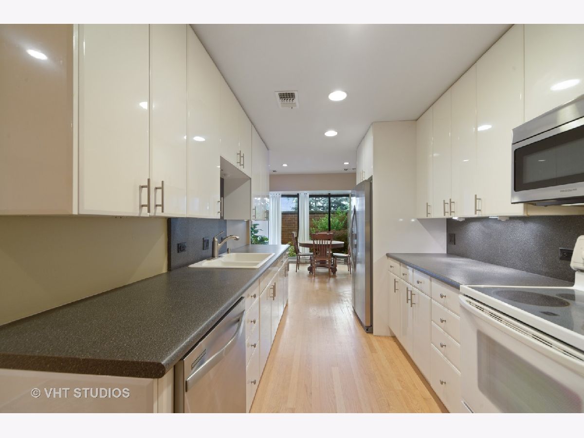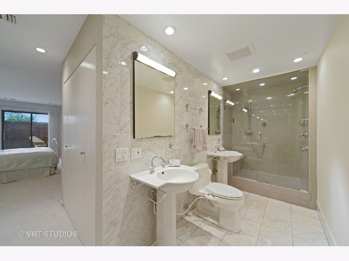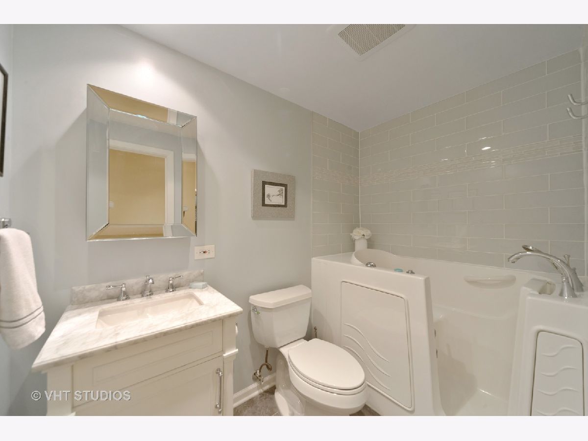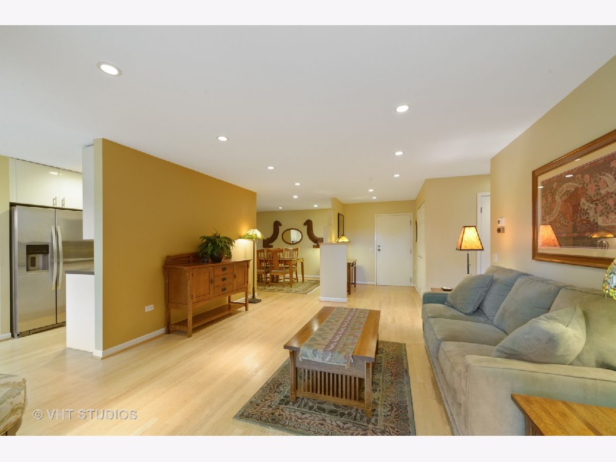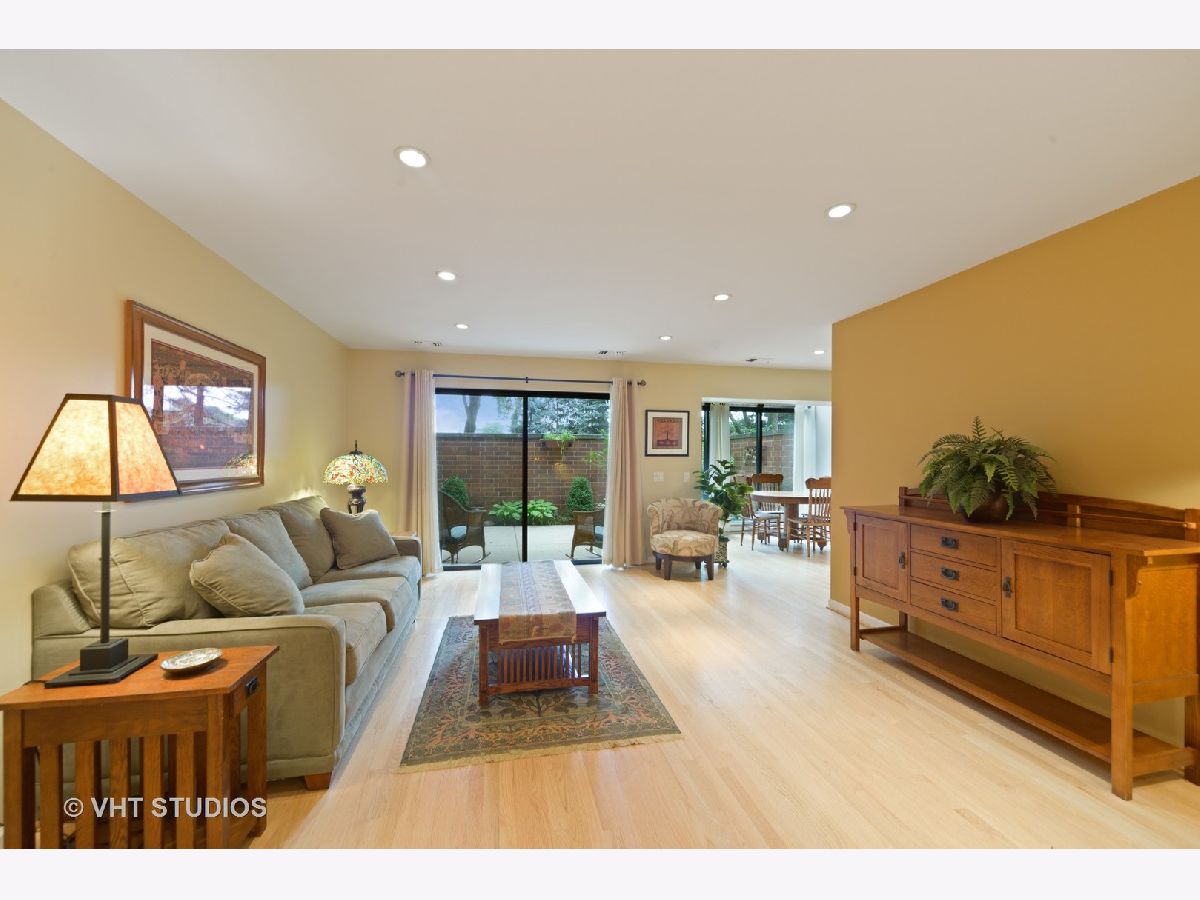 Are you looking for huge outdoor living space and a beautiful main floor condo all in one. This one checks all of those boxes plus the outdoor terrace has a zen garden/pond, can fit a large outdoor table set with chairs, planter boxes and has additional plantings. Brand new painted bedrooms. The Primary bedroom fits plenty of furniture has abundant closet space, and access to the patio. The primary bath features two Kohler stand alone sinks, marble floor tile and a large built shower that offers body sprays, and two sprayers including a handheld and a seat. Access to the terrace from the primary bedroom too. The secondary bath was recently renovated with a white vanity and classic marble top, beautiful tile flooring, and has a walk in tub, glass tile subway tile backsplash along with jets and a seat in the tub. The sunny white kitchen features newer stainless steel side by side refrigerator, stainless steel dishwasher and stainless microwave too. The primary bedroom is huge and has a plethora of closet space. The majority of this home features real oak hardwood floors that can be retained the color of your choice. Tons of modern micro-recessed lighting in this home. The formal dining room can accommodate a large table with 6-8 chairs. The eat-in kitchen area has tons of natural light from the southern exposures, overhead windows and the space can also serve as an office area. A laundry room features newer white Samsung side by side front loading washer/dryers and has ample room for additional storage. A large coat entry closet, a hall linen closet plus a large additional personal storage area in garage area. One premium garage parking space right off the elevator is included and located in a heated garage attached to the building is included in pricing. Professionally managed property. Conveniently located just a block to the Metra station, access to restaurants within walking distance, and a convenient store around the block. So many great features and benefits its hard to list it all here. Easy to show and ready to move into today- Dogs allowed in building but only for 1st floor units like this one!