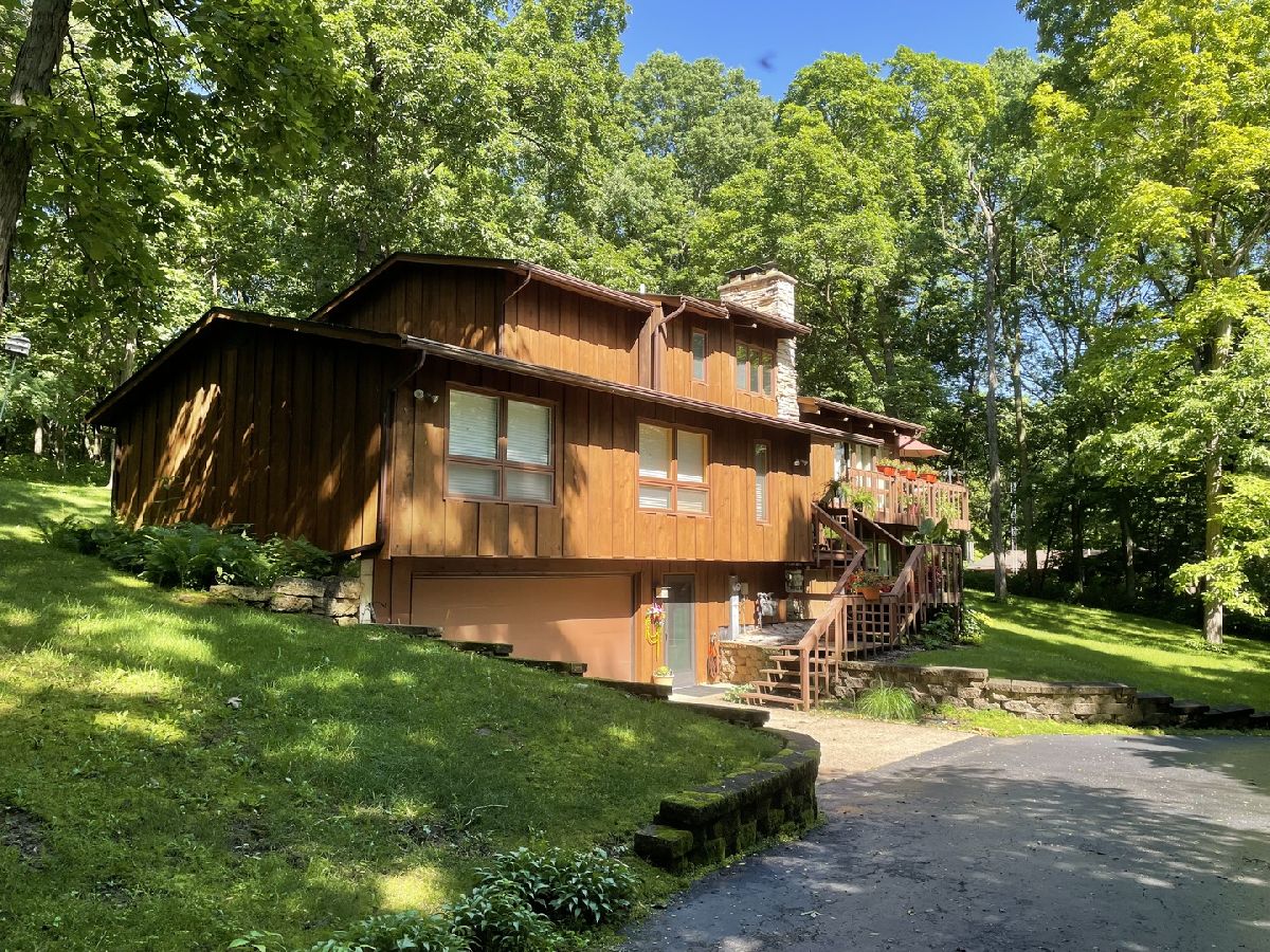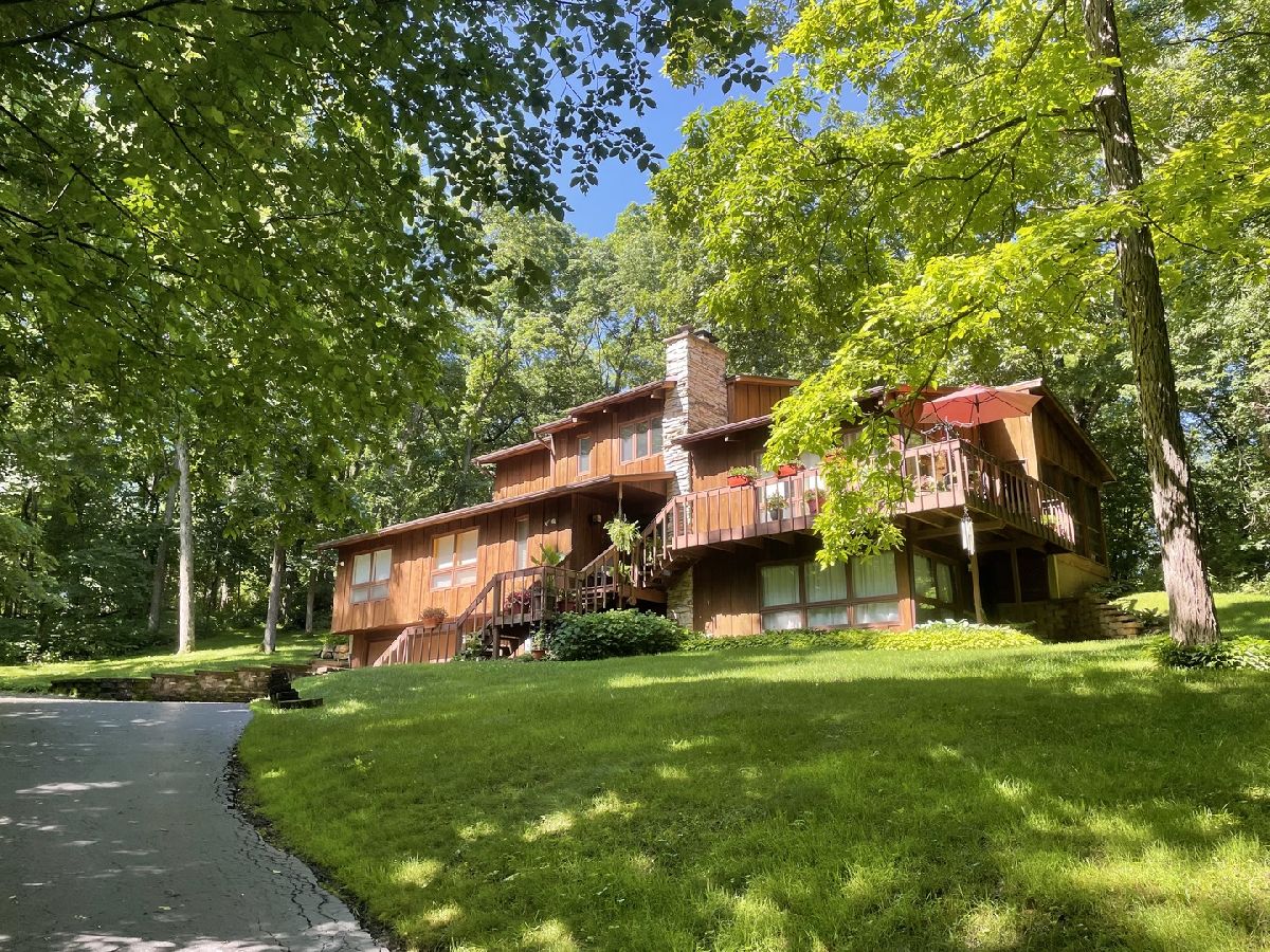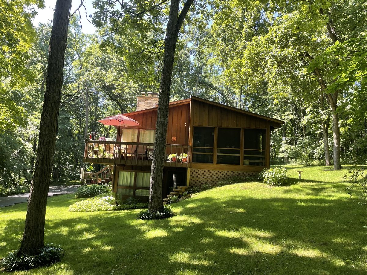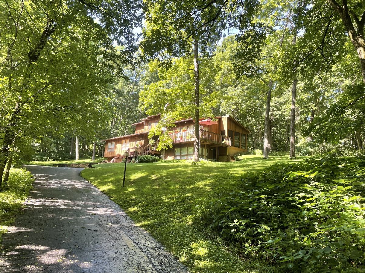 Frank Lloyd Wright style contemporary house nestled among the trees for ultimate privacy in a park like setting. What's not to love here? This 2 story home with walkout basement has 4 spacious bedrooms & 3.5 baths. An open concept from kitchen to living room and dining room with lots of windows and 2 skylights. This area also has vaulted ceilings with wooden exposed beams, beautiful limestone wood burning fireplace, bonus room for library, music or exercising and access to the screened porch. Kitchen has newer dishwasher, stove top, and marble cutting board. The master suit has a shower, jacuzzi tub and 3 large closets. The secluded large bedroom upstairs has its own bathroom. Their are 2more main floor bedrooms next to the laundry closet. The huge family room has plenty of room to entertain and a gas fireplace. Lots of storage in the basement and garage too. Home has newer A/C, furnace, hot water, well and pressure tank, and 2 Raynor garage doors. Great space and room outside the home as well. Lots of wildlife and colors to see in the spring, summer and fall. It's your move!