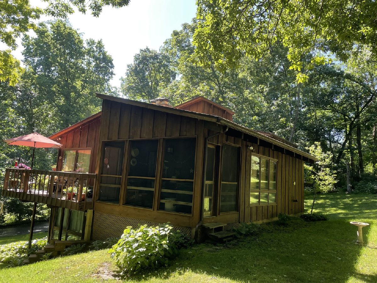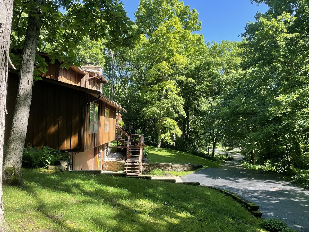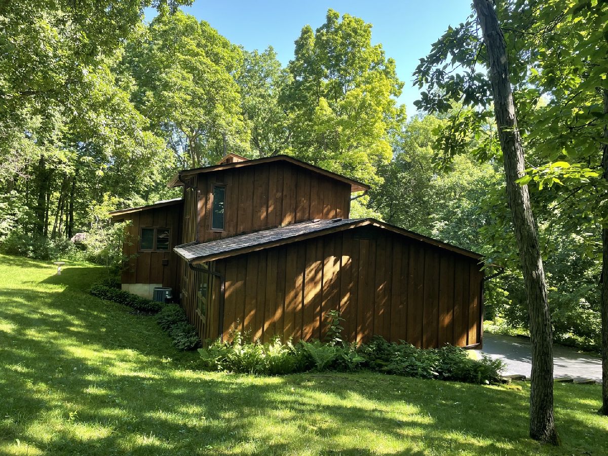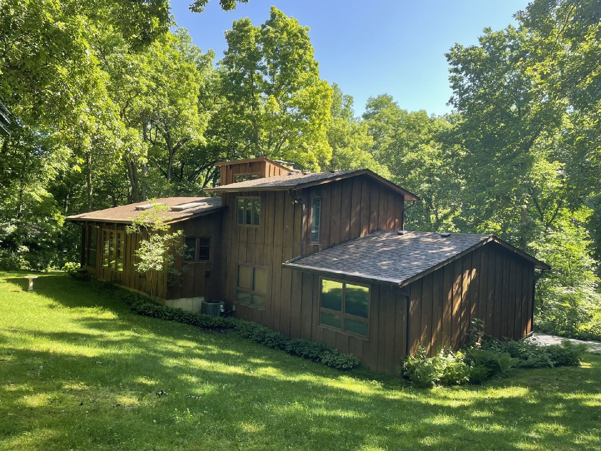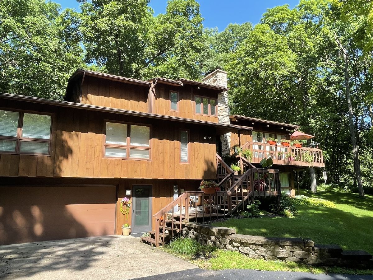 Frank Lloyd Wright style contemporary house nestled among the trees for ultimate privacy in a park like setting. What's not to love here? This 2 story home with walkout basement has 4 spacious bedrooms & 3.5 baths. An open concept from kitchen to living room and dining room with lots of windows and 2 skylights. This area also has vaulted ceilings with wooden exposed beams, beautiful limestone wood burning fireplace, bonus room for library, music or exercising and access to the screened porch. Kitchen has newer dishwasher, stove top, and marble cutting board. The master suit has a shower, jacuzzi tub and 3 large closets. The secluded large bedroom upstairs has its own bathroom. Their are 2more main floor bedrooms next to the laundry closet. The huge family room has plenty of room to entertain and a gas fireplace. Lots of storage in the basement and garage too. Home has newer A/C, furnace, hot water, well and pressure tank, and 2 Raynor garage doors. Great space and room outside the home as well. Lots of wildlife and colors to see in the spring, summer and fall. It's your move!