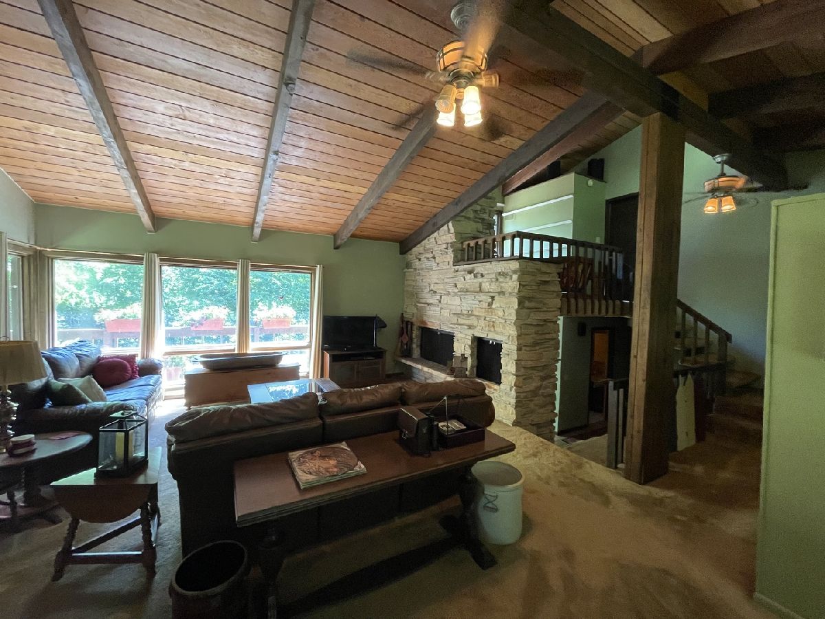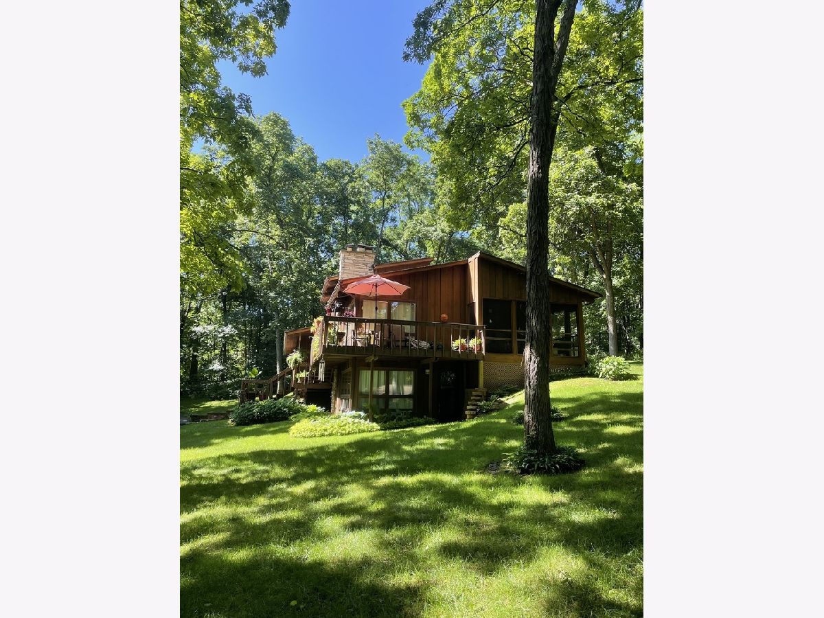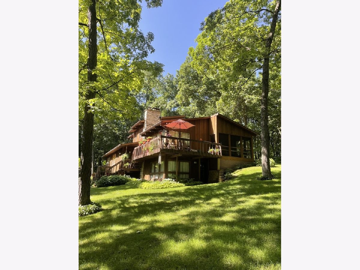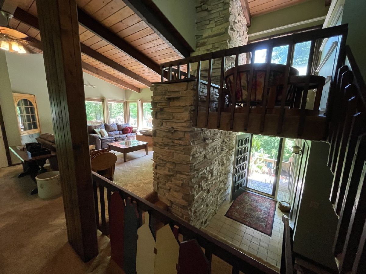 Frank Lloyd Wright style contemporary house nestled among the trees for ultimate privacy in a park like setting. What's not to love here? This 2 story home with walkout basement has 4 spacious bedrooms & 3.5 baths. An open concept from kitchen to living room and dining room with lots of windows and 2 skylights. This area also has vaulted ceilings with wooden exposed beams, beautiful limestone wood burning fireplace, bonus room for library, music or exercising and access to the screened porch. Kitchen has newer dishwasher, stove top, and marble cutting board. The master suit has a shower, jacuzzi tub and 3 large closets. The secluded large bedroom upstairs has its own bathroom. Their are 2more main floor bedrooms next to the laundry closet. The huge family room has plenty of room to entertain and a gas fireplace. Lots of storage in the basement and garage too. Home has newer A/C, furnace, hot water, well and pressure tank, and 2 Raynor garage doors. Great space and room outside the home as well. Lots of wildlife and colors to see in the spring, summer and fall. It's your move!