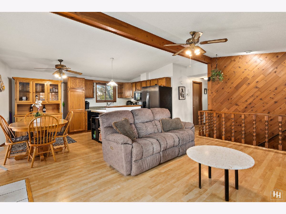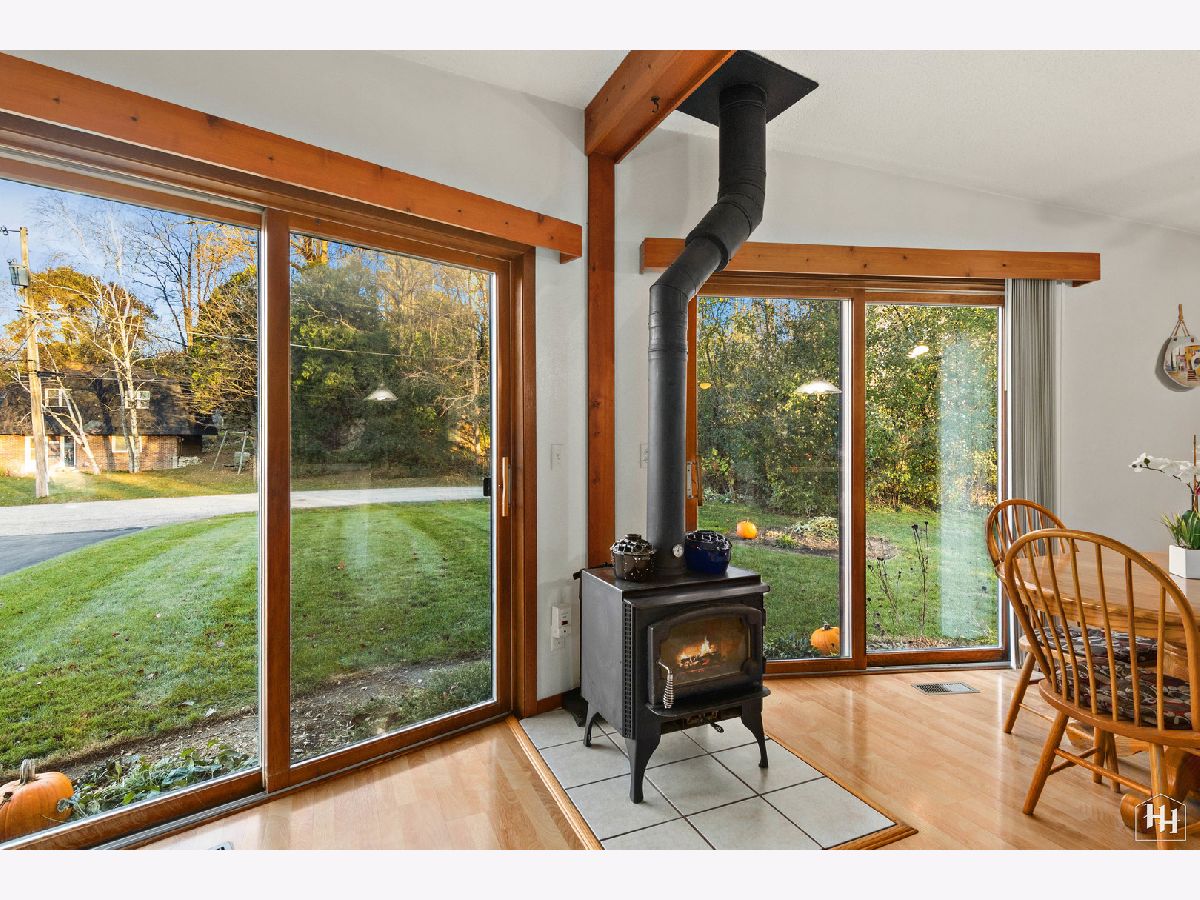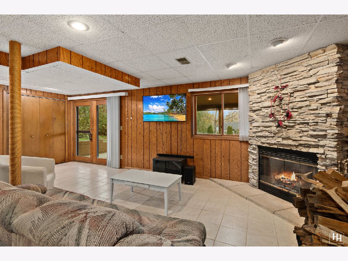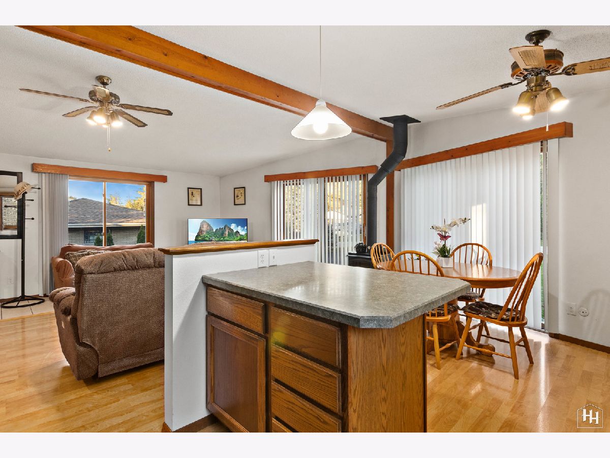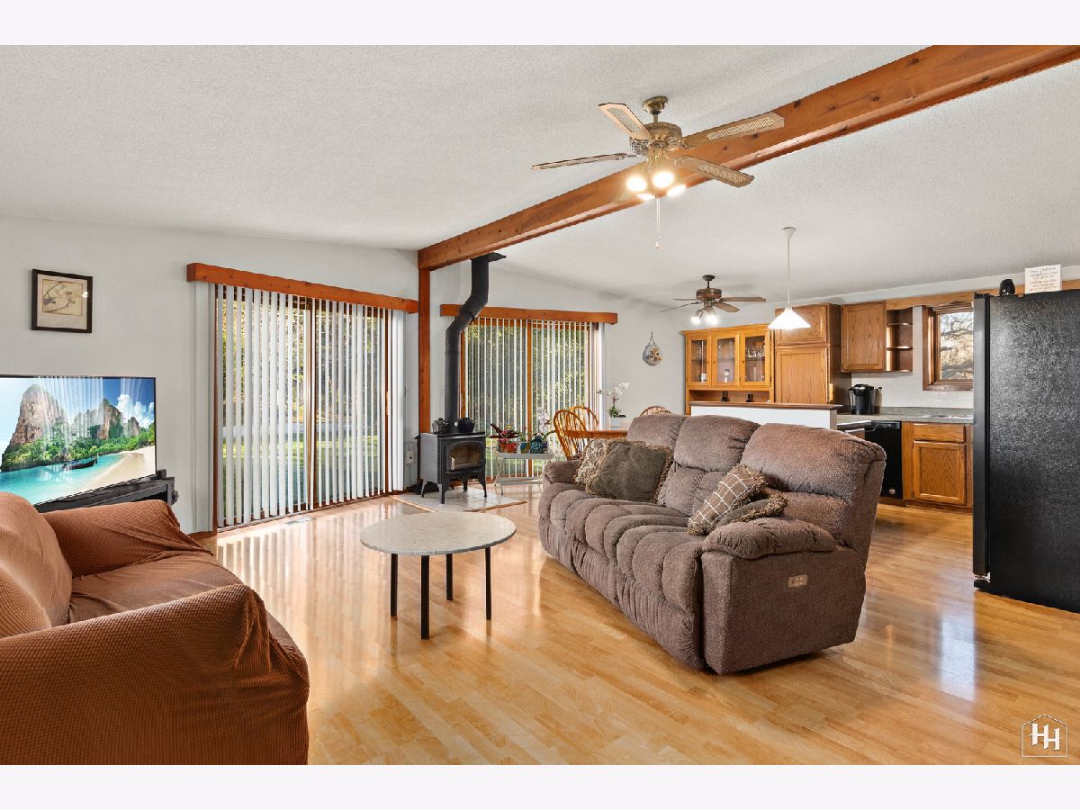 This 2 Bedroom 2 Bath ranch with finished walkout basement and 2 car heated garage sits on a lovely wooded lot. The main floor offers a great open floor plan with vaulted and beamed ceilings and wood laminate flooring. Beautiful open kitchen features a wood burning stove and center island, plus a dining area with backyard views. An adjacent living room offers tons of natural light. The primary bedroom includes carpeting and shares a spacious full bathroom with the second bedroom. Fabulous walkout lower level features a spacious family room with gas fireplace, comfortable wet bar, and game room that makes a great entertaining space. Walk right out to the large covered patio with ceiling fans and skylights, and beautiful backyard with a fire pit and garden shed. Lower level also includes a laundry room and full bathroom. Near downtown Fox River Grove with Metra train station, schools, parks, and outdoor recreation opportunities.