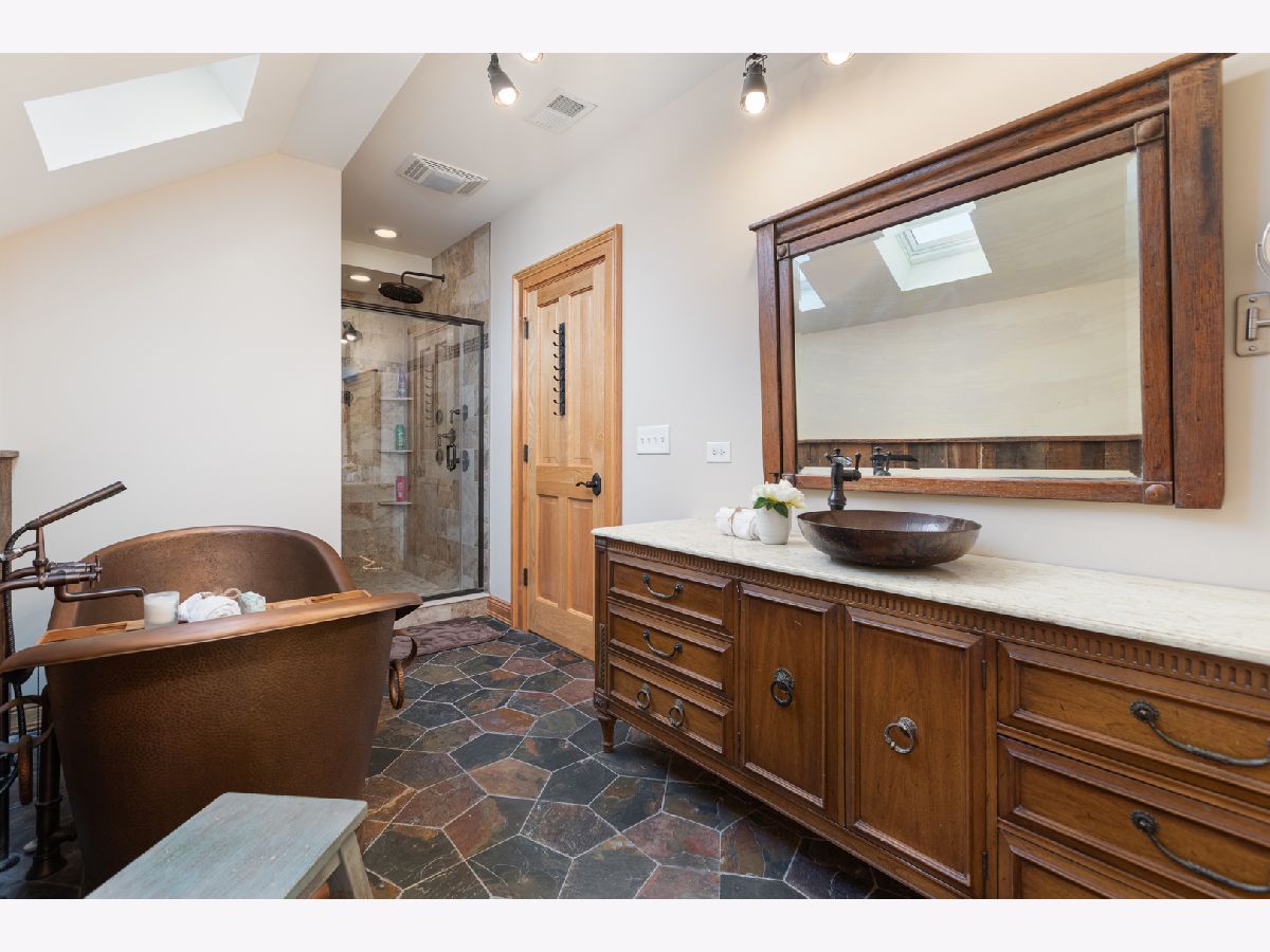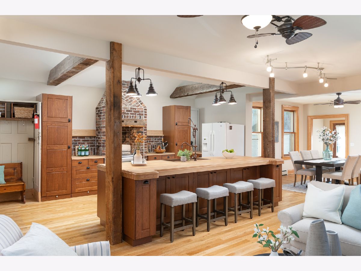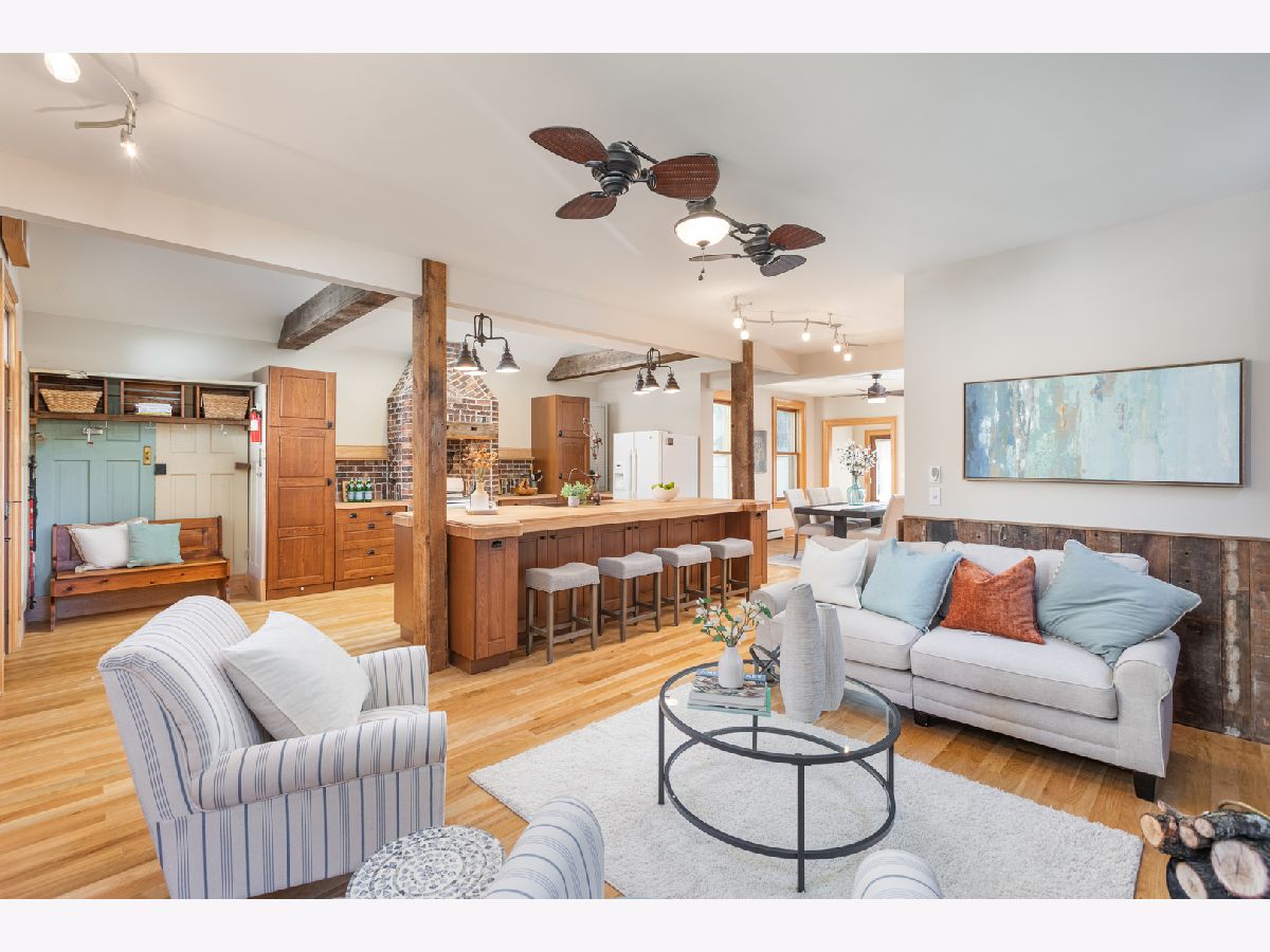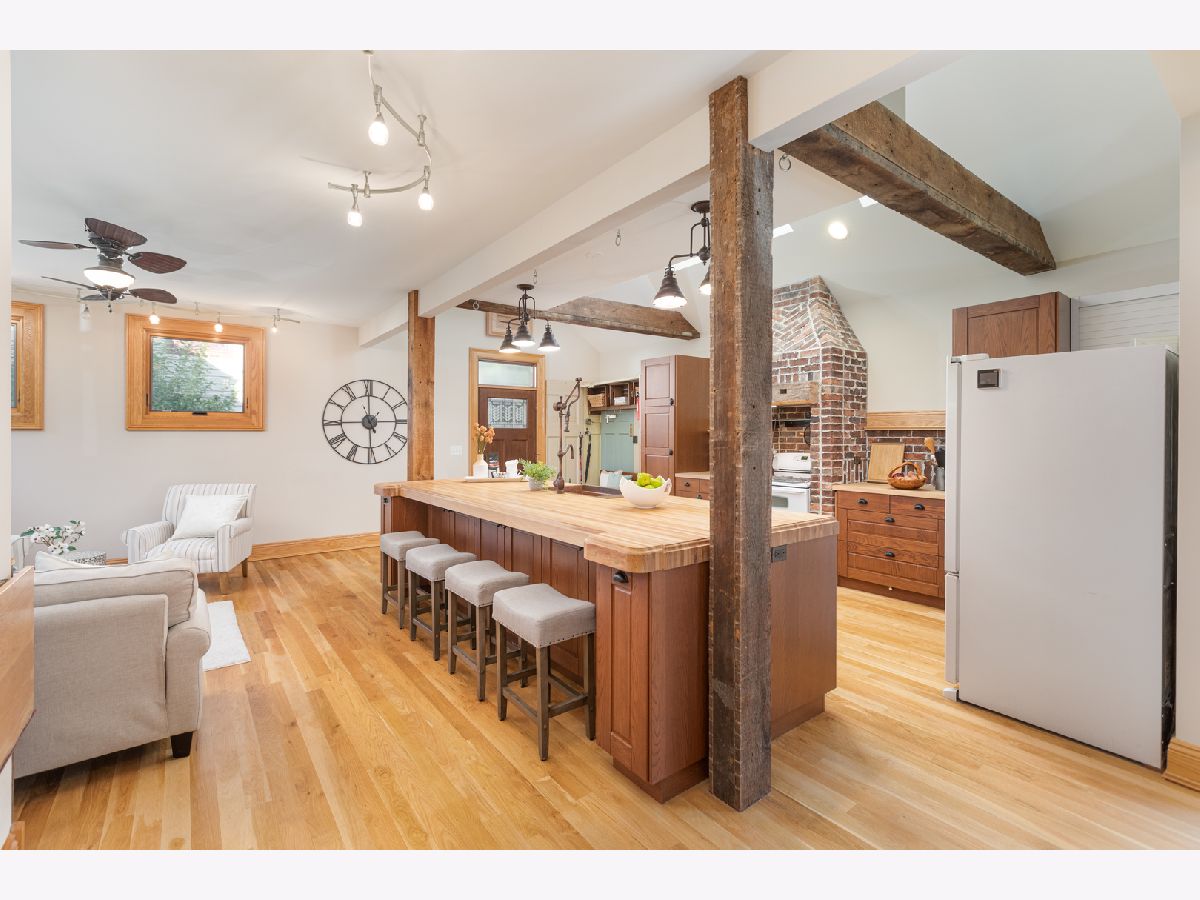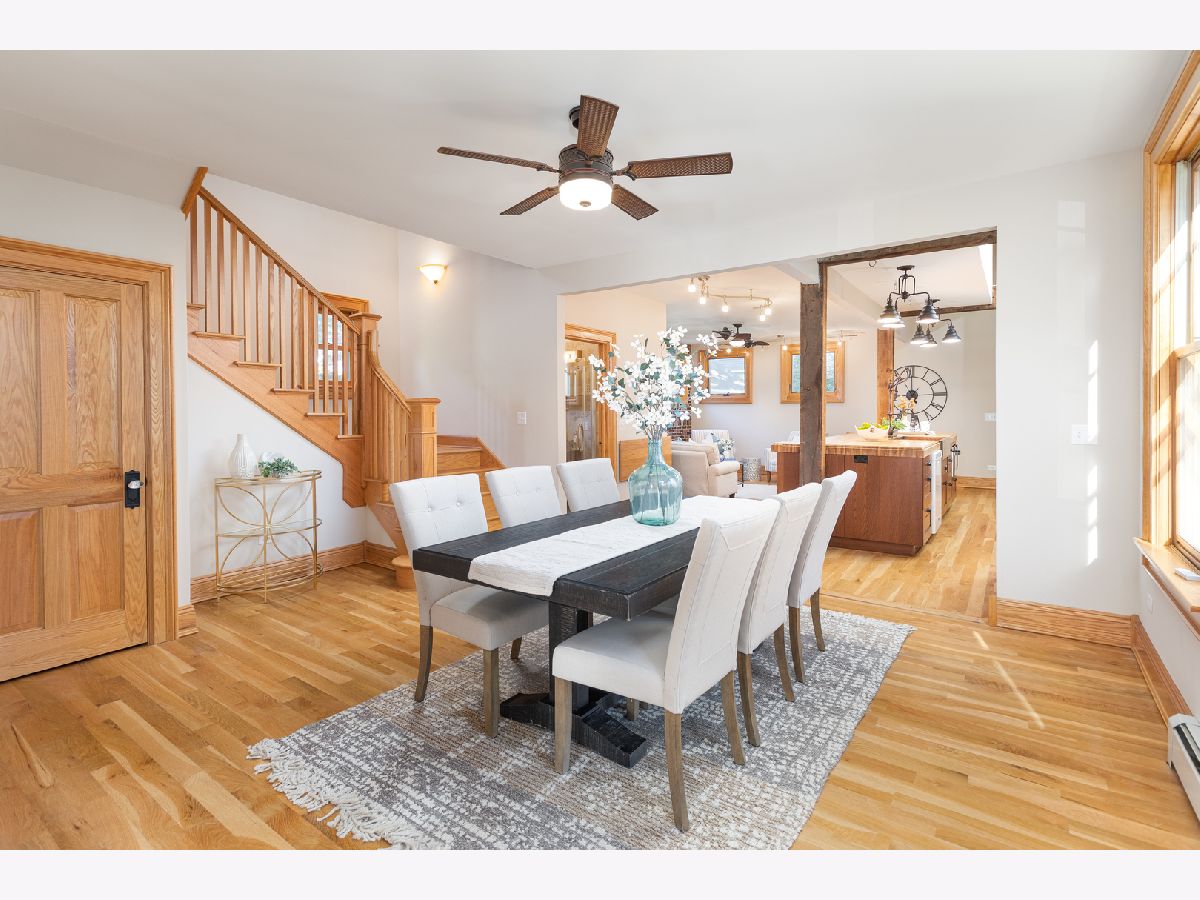 This home beautifully merges modern amenities with vintage appeal, and it is just a short walk from the train, downtown Naperville, and schools. Originally built in1860, this approx. 2,300 sf, 3-bedroom, 2 full bath home was completely remodeled, with an addition, in 2014. The homeowners repurposed wood beams and accents from the original structure to create a fresh take on living in the Historical District of downtown Naperville. Light infuses the vaulted kitchen through two skylights which are controlled with a remote and sensors that will automatically close them if it starts to rain. The kitchen also boasts a large butcher block island, an elegant copper farm sink, updated appliances, and reclaimed brick around the stove. The hearth room off the kitchen is a perfect place to relax or entertain. The fireplace is nestled in a reclaimed brick wall and features a wood beam mantle that was once part of the original home. The kitchen and the recently added first floor full bath have radiant flooring. Large windows and doorways allow light to flow throughout the first floor, creating an open space. Arched French doors can separate the dining room from the living room and family room if desired. Beautiful wood floors run throughout both floors of the home, and a wide staircase takes you to the second floor. Each of the three bedrooms on this level has handcrafted barn beam closet doors, and the third bedroom has a built-in Murphy bed. The full bath has reclaimed wood accents, a copper soaking tub, a copper sink, slate tile flooring, and a large walk-in shower. The skylights over the tub infuse the room with natural light. The second floor laundry room has a newer washer and dryer. Gain approximately 2,000 sf with the four-car, heated and cooled, detached garage. Once the woodshop of the owner, the approx. 1,000sf upstairs space has innumerable possibilities, from guest quarters to office space to billiard room. The 12 year-old garage has a separate furnace and air conditioner, and is just steps from the house. Repurposed doors create the backdrop for the storage space located in the back entryway of the home. The yard is low maintenance and enhanced by a meandering limestone path that connects the front yard to the back. The roof and hardie board siding were all new with the renovation, as is the high-end, high-efficiency boiler system that heats the house and radiant flooring. There are two furnaces and air conditioners in the house, along with the furnace and air conditioner in the garage. The basement is unfinished and has walkout cellar doors. This home is a beautiful blend of modern amenities and history, and it is close to the train and all the wonderful attractions downtown Naperville has to offer. Welcome home!
